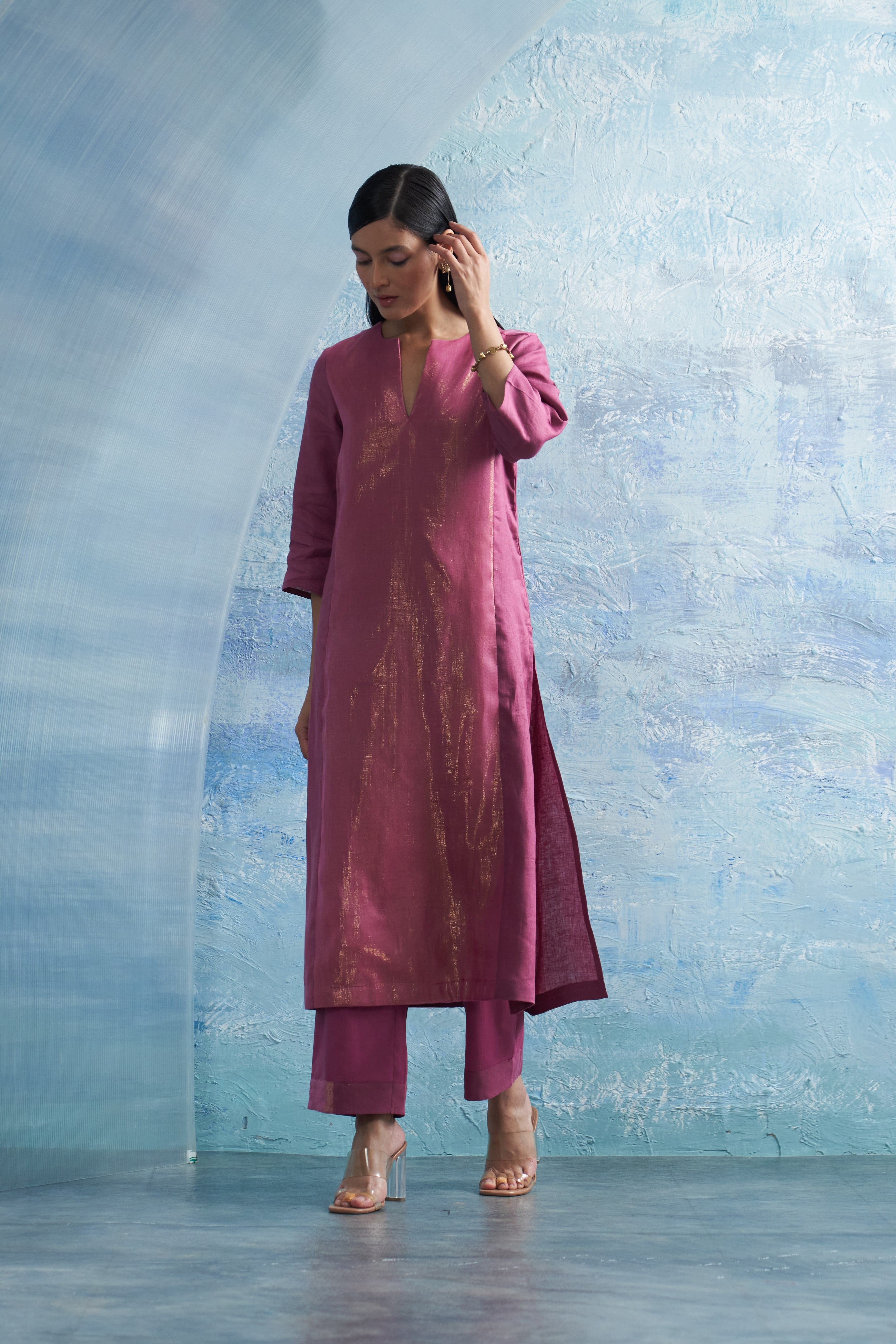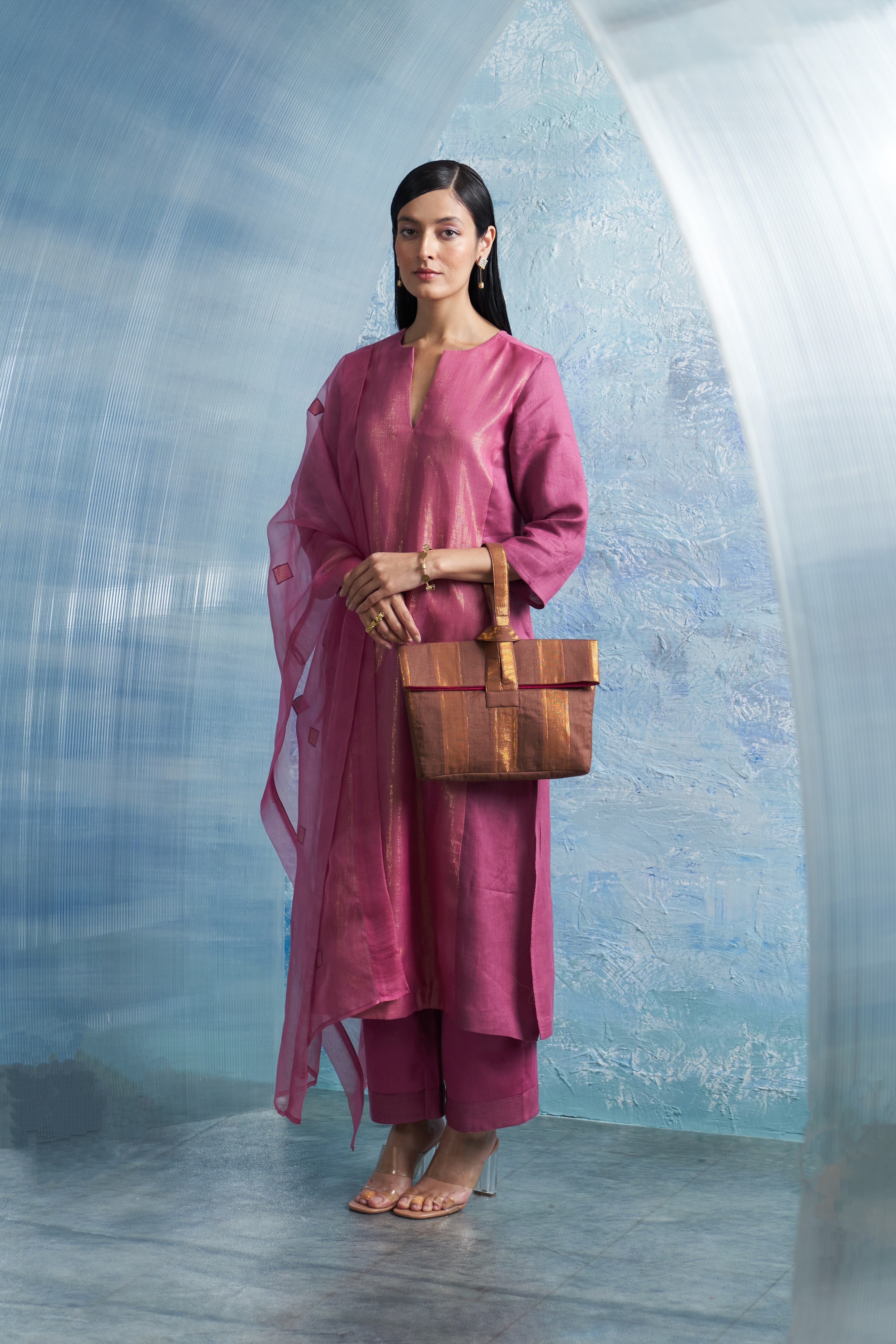 Indulge in the epitome of festive elegance with our Aura Fuchsia Notch Neck Kurta Set. Designed in a luscious grape pink hue, this ensemble is crafted from premium linen, boasting a subtle shimmer effect that exudes understated glamour. The crisp notch neckline and flattering A-line silhouette ensure a refined fit for every body type, while the straight palazzo pants offer both comfort and sophistication. Elevating the ensemble further, the sheer organza dupatta features meticulous patchwork and delicate hand embroidery, adding a touch of sophistication to any upscale occasion.