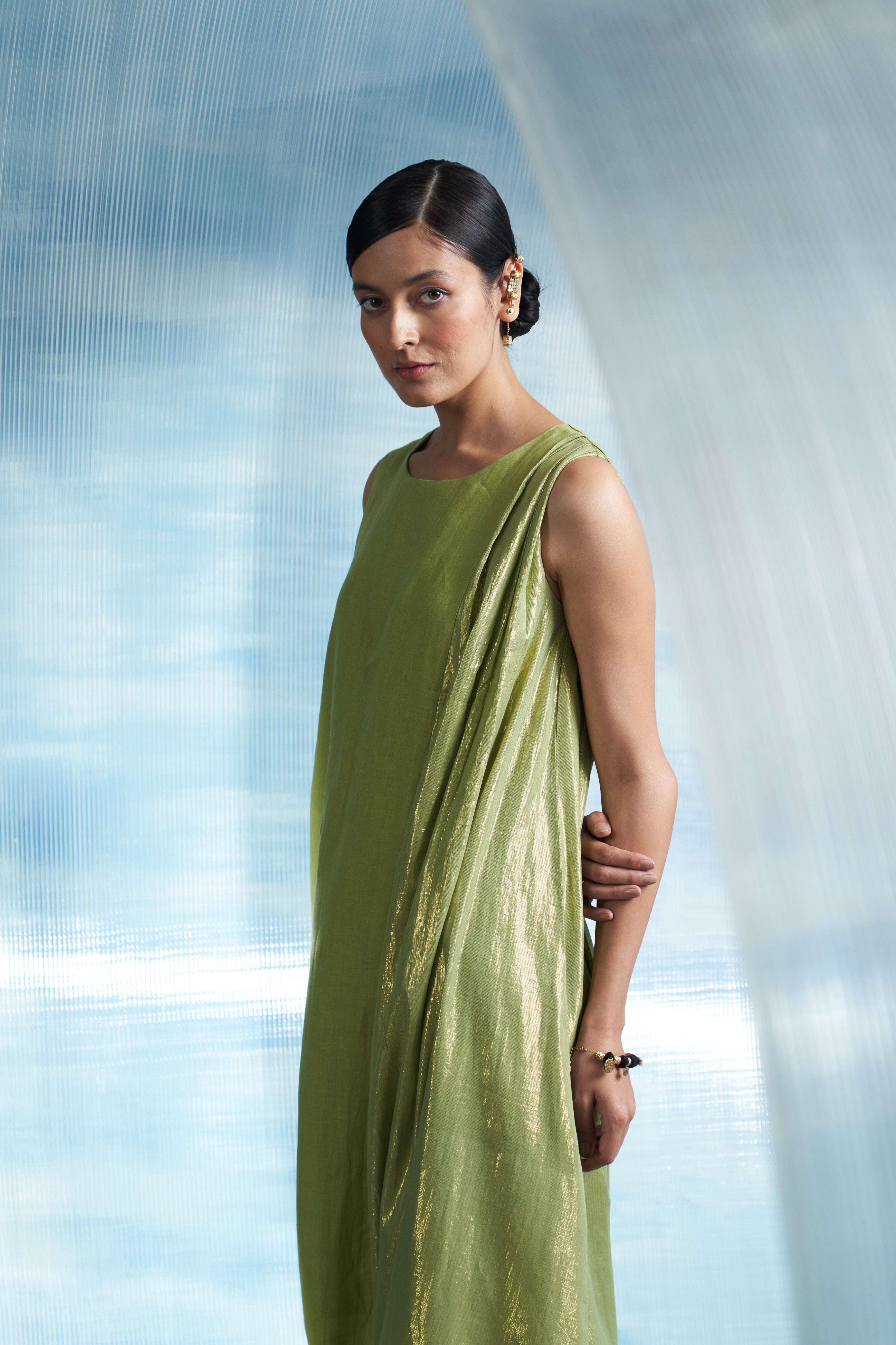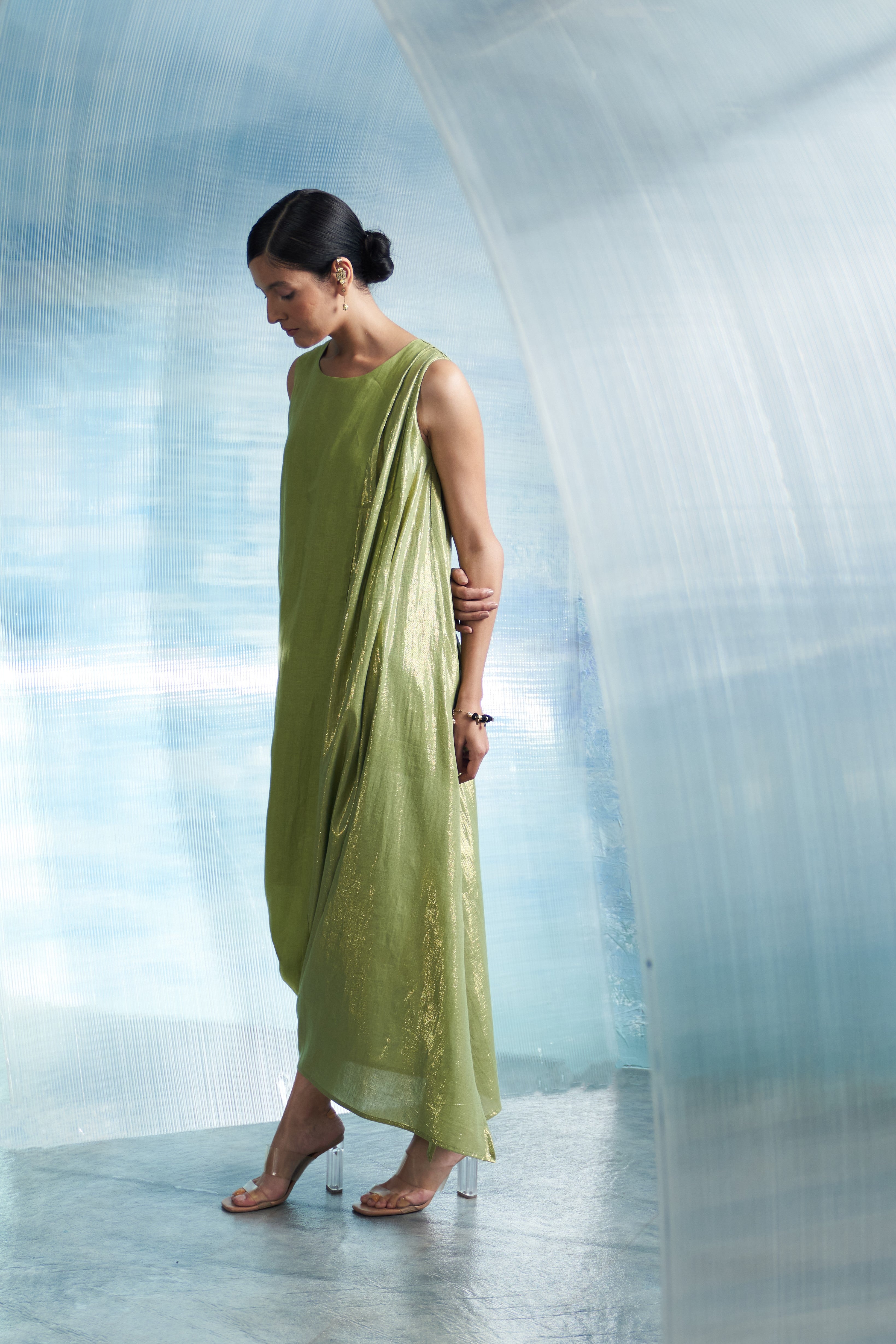 Aura Sheen Green Linen Drape Dress