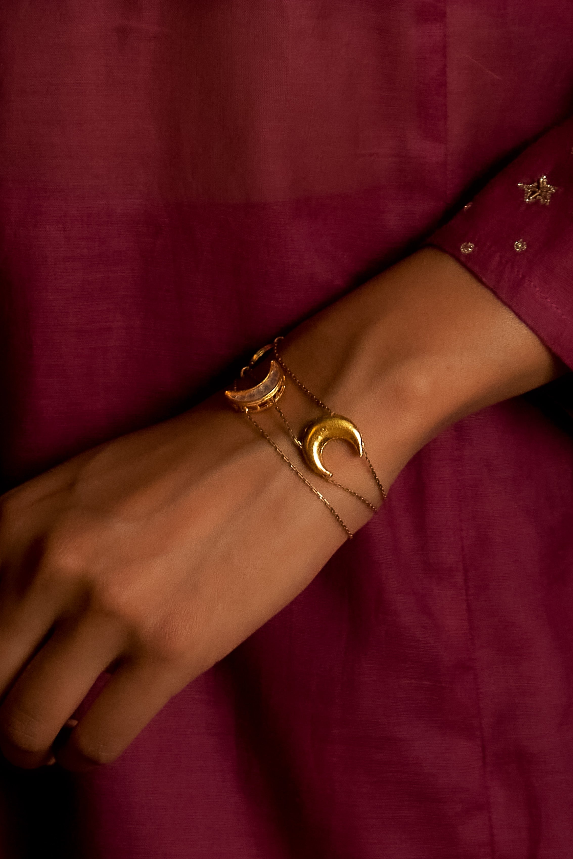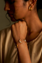 A delicate dual-chain bracelet featuring stacked kundan and gold crescents nestled in the gap between the chains. The subtle interplay of shimmer and shape creates a modern yet timeless accent, perfect for layering or wearing solo.