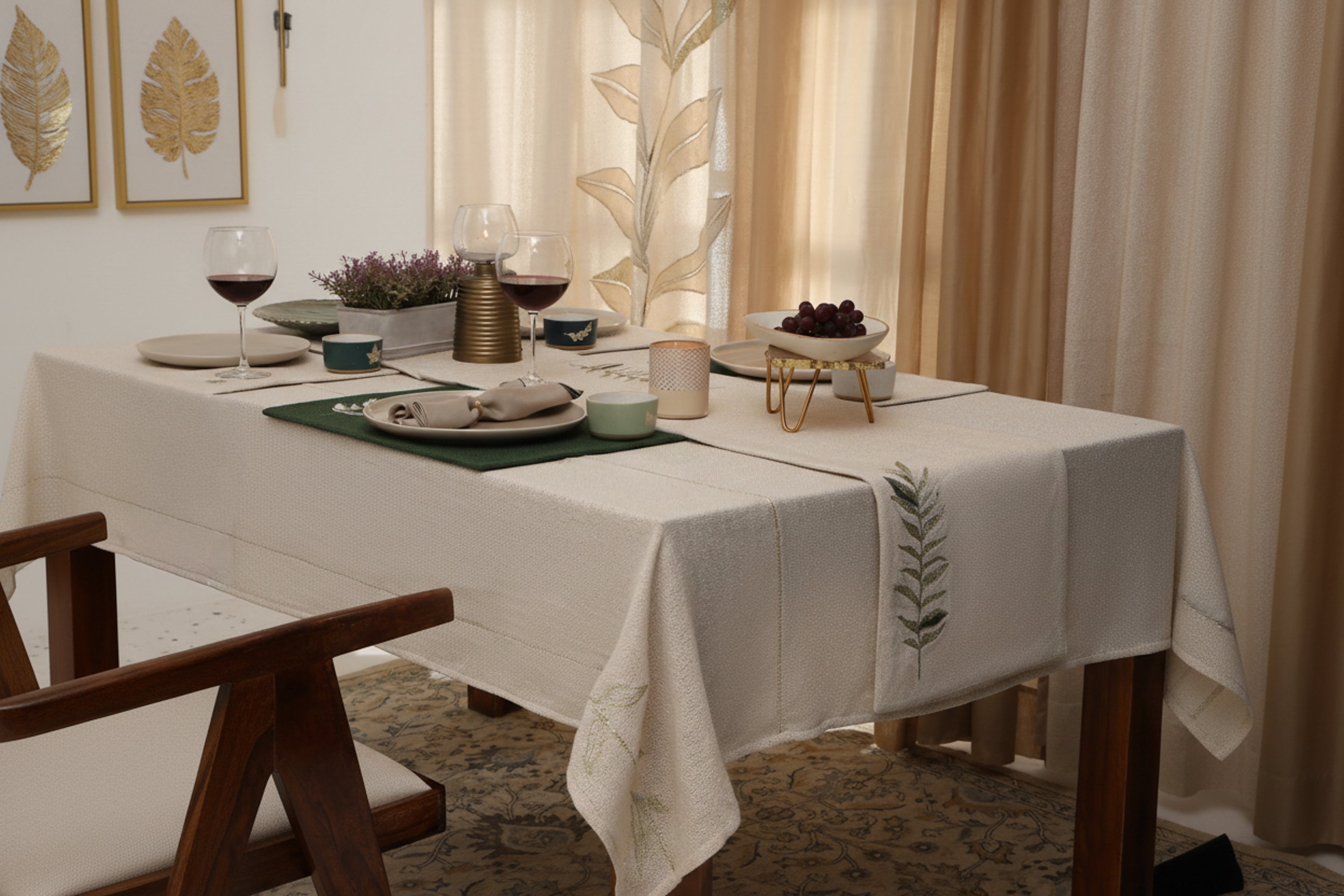 A refined table cover adorned with delicate leaf-branch embroidery along both edges, bringing natural elegance and charm to your setting