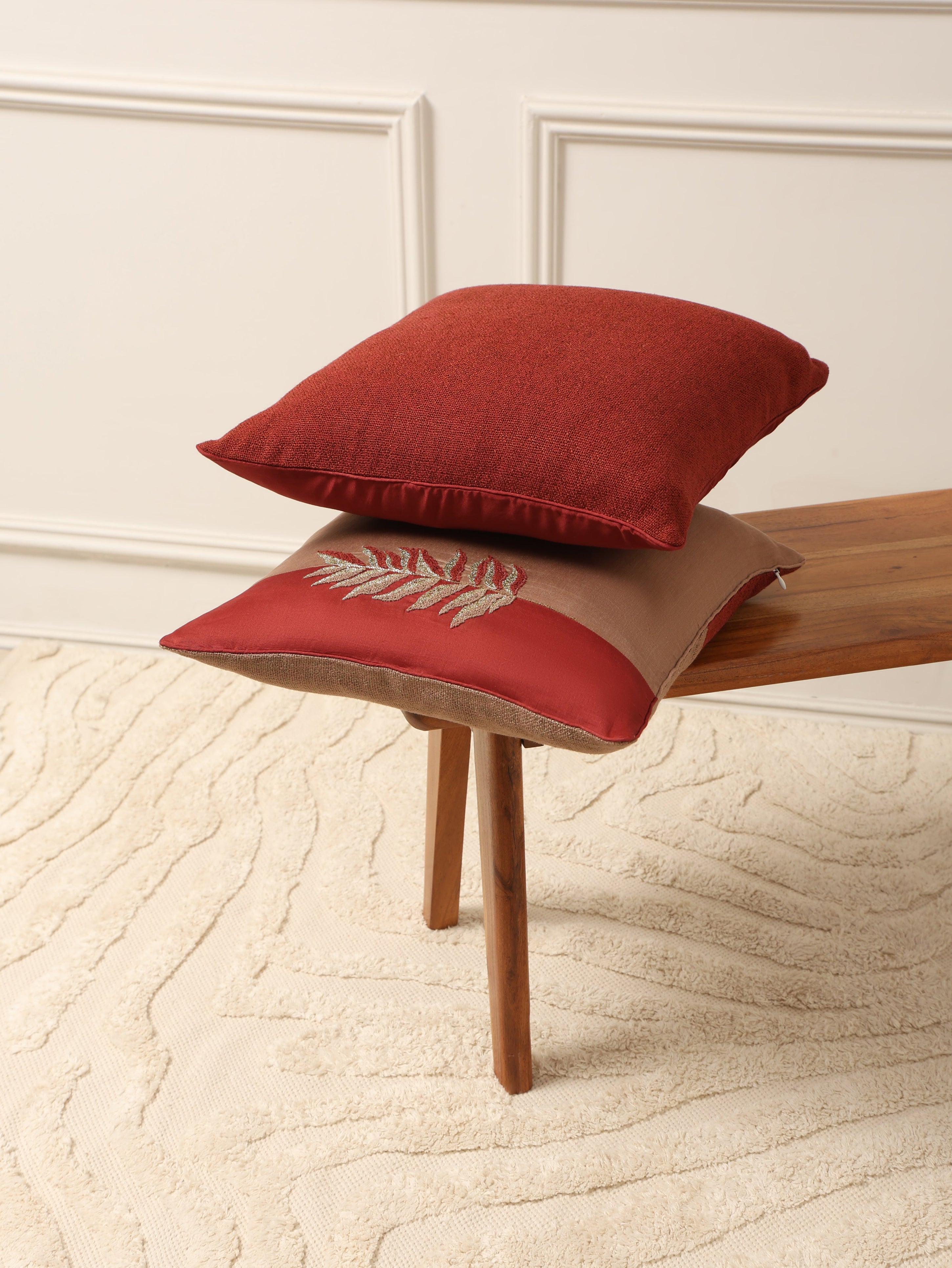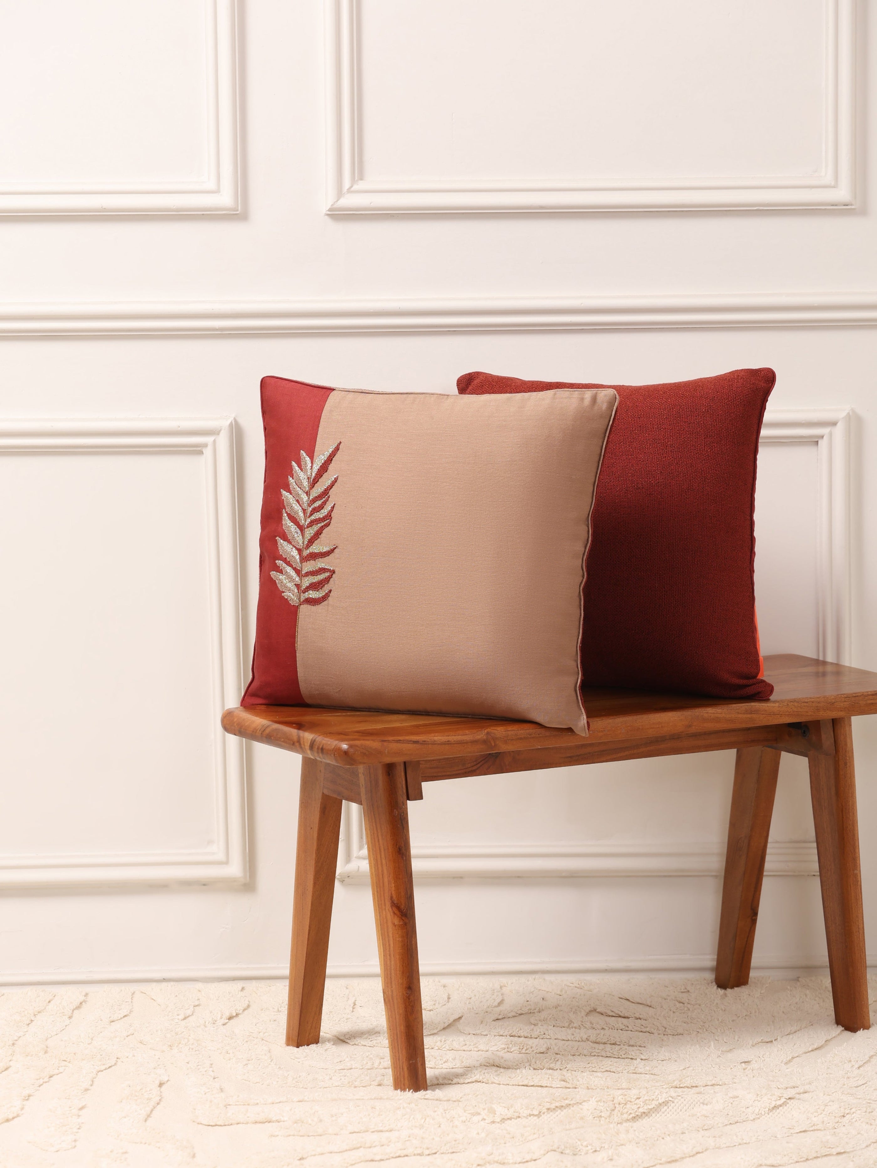 A set of four beautifully coordinated cushions crafted to bring texture and elegance to your space. Two cushions feature delicate embroidery with an interplay of fabrics in half-and-half color blocks on the front and back, while the other two come in solid shades with subtle fabric contrasts on both sides. Finished with a concealed zipper for a seamless look, this set creates a refined mix of pattern, color, and texture perfect for layering on your couch or bed.