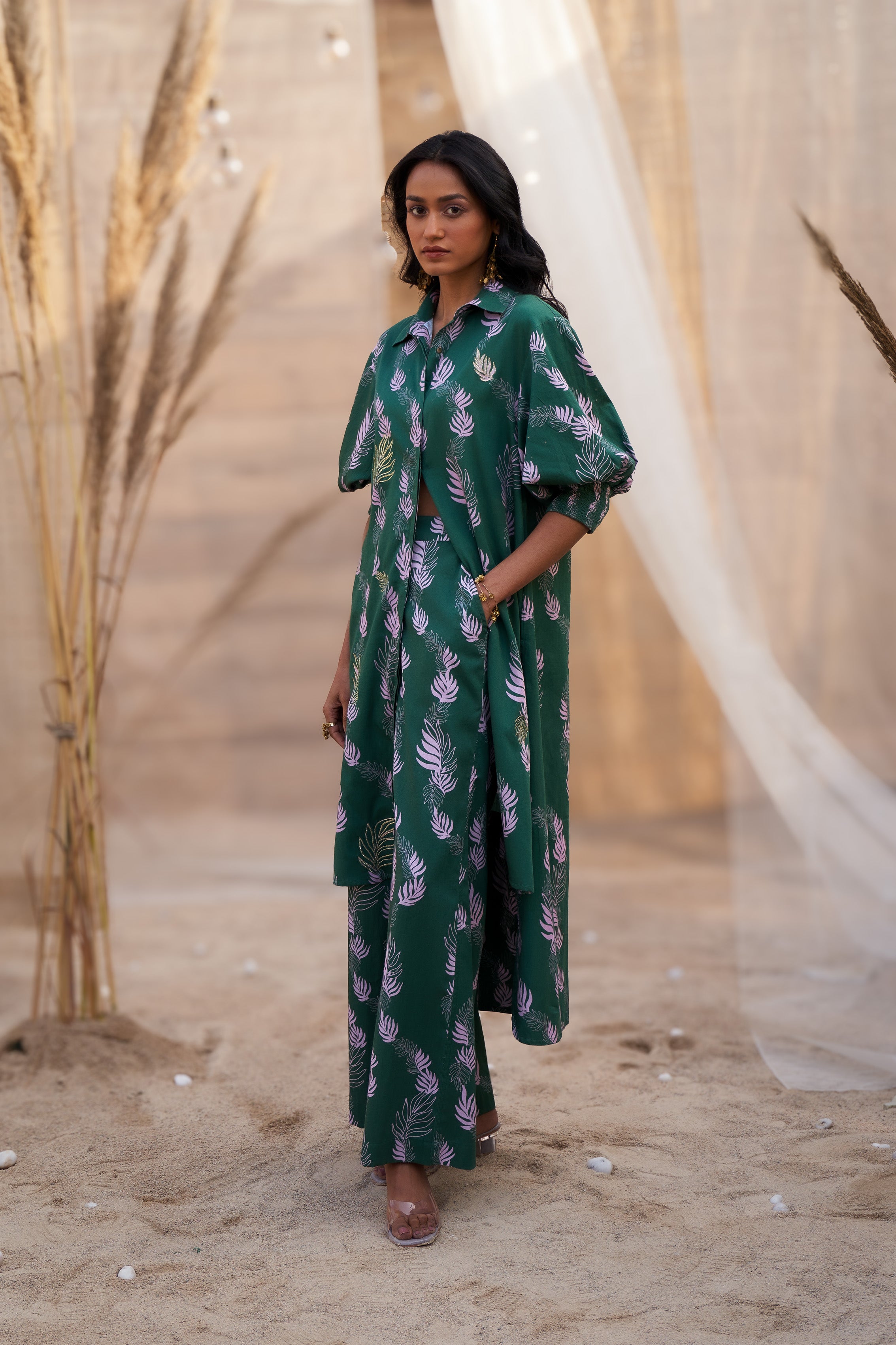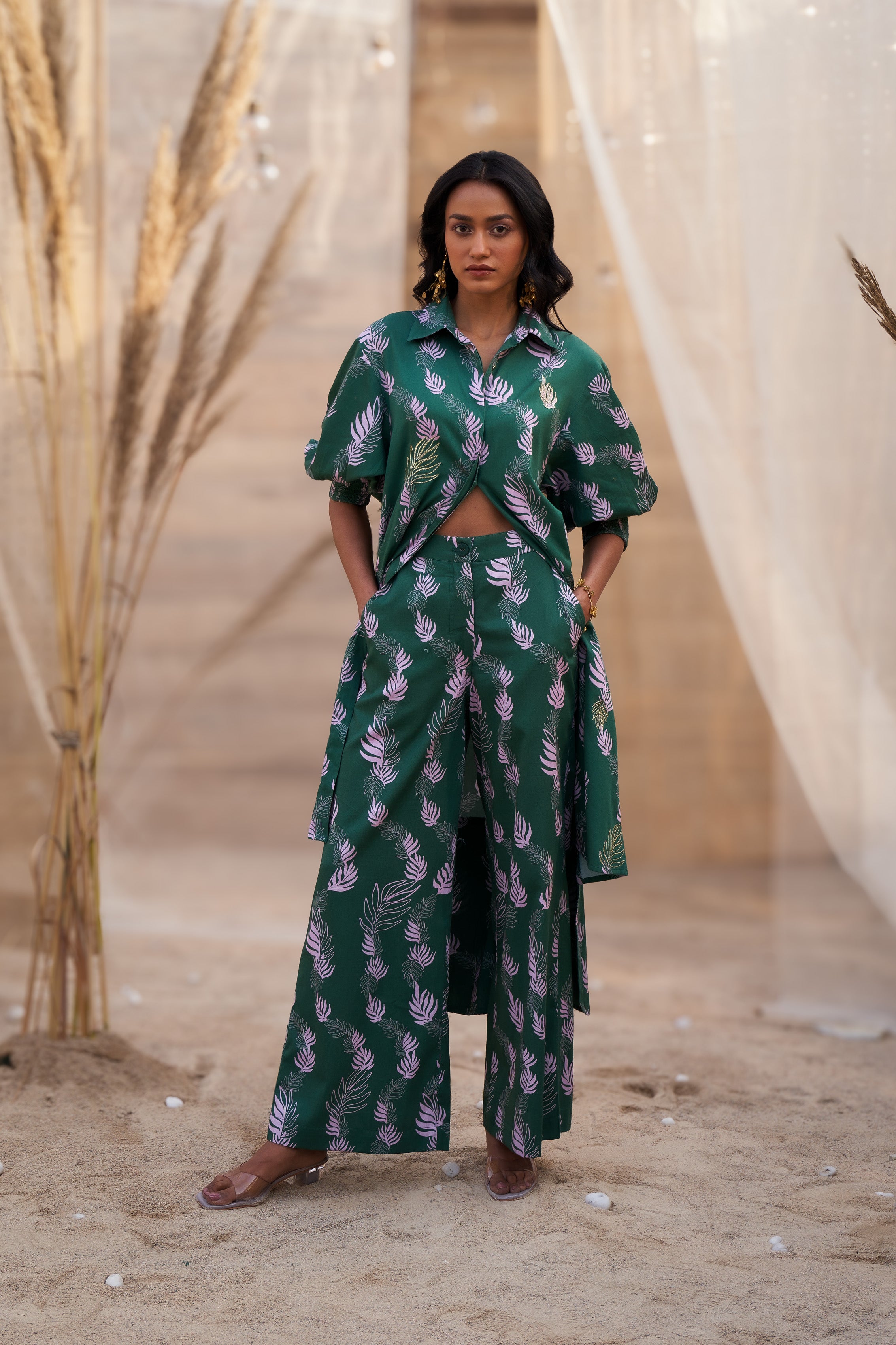 Redefine your elegance with this Charming Leaf-Print Co-ord Set, designed for modern elegance and sophistication. The kurta features a collared neckline and a front-buttoned design, adding a structured and contemporary appeal. Delicate Zari-highlighted motifs enhance the charm, making it perfect for special occasions. Unique smocking details on the sleeve cuffs add a playful yet refined touch, while the hi-lo kurta panels bring movement and flair to the outfit. Paired with flared pants, this ensemble offers a comfortable yet chic silhouette. Accessorize with statement jewelry and heels for a polished look that stands out.