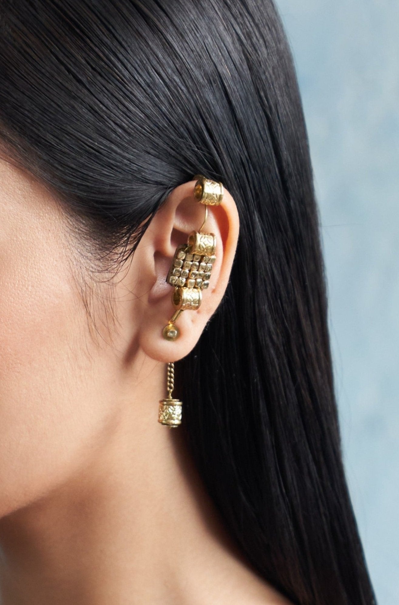 Our stylish and contemporary Stud Earring Set, a unique ensemble designed to make a statement. This set features a combination of a sleek stud earring paired with an ear cuff for an edgy twist on traditional styles. On the other ear, a delicate drop earring dangles gracefully, adding a touch of elegance to your look. Embrace versatility and individuality with this one-of-a-kind set that effortlessly blends modern flair with timeless charm. Elevate your style game with these captivating and unconventional earrings.