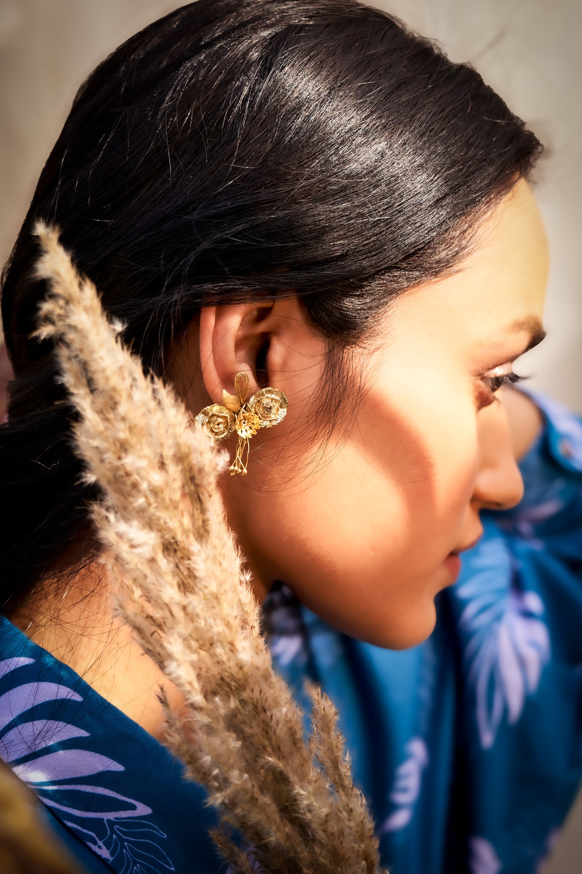 A blooming cluster of gold flowers with a touch of leaf and soft pollen drops. Light yet detailed, this earring brings an elegant flourish of nature to your look.