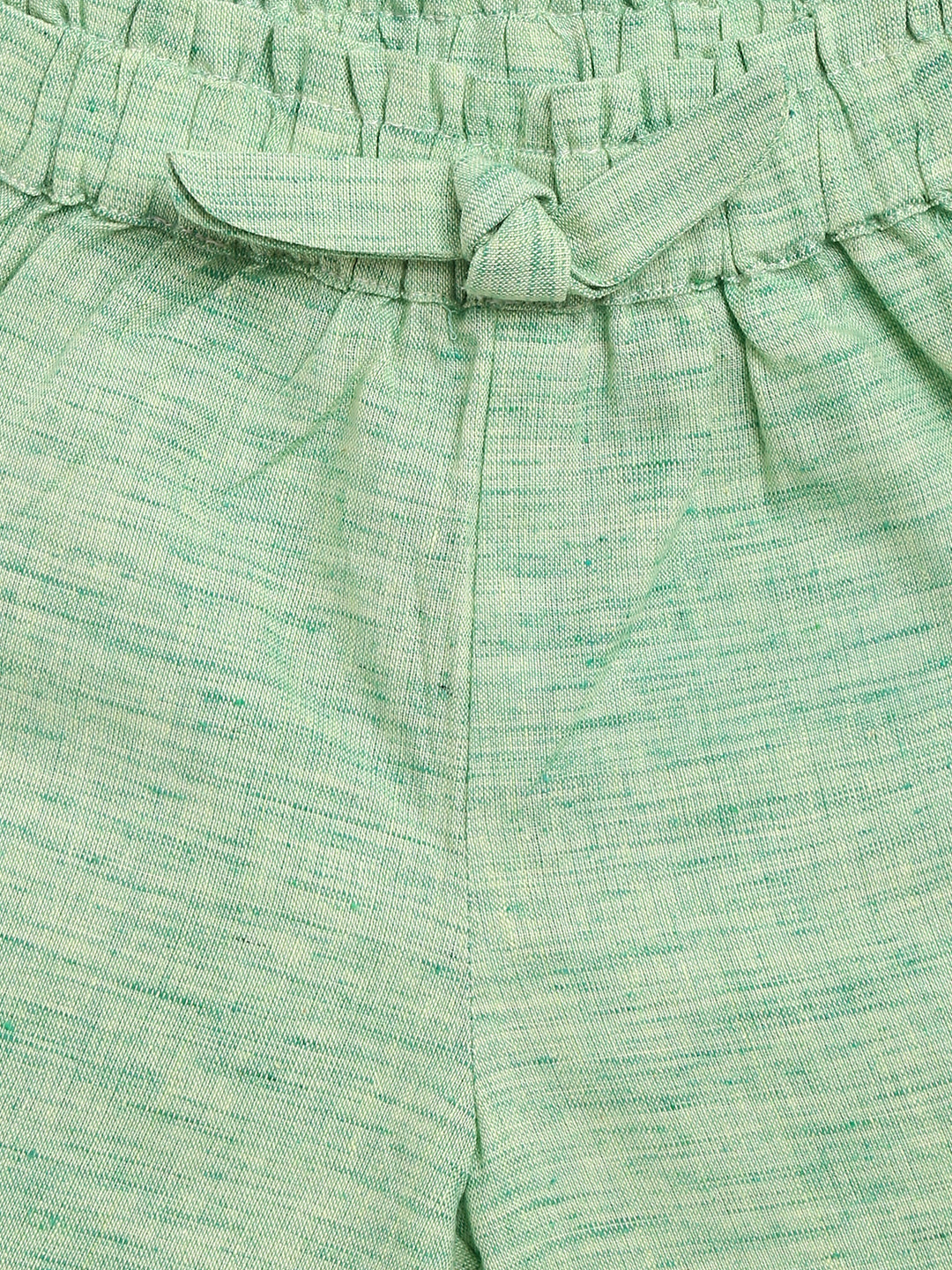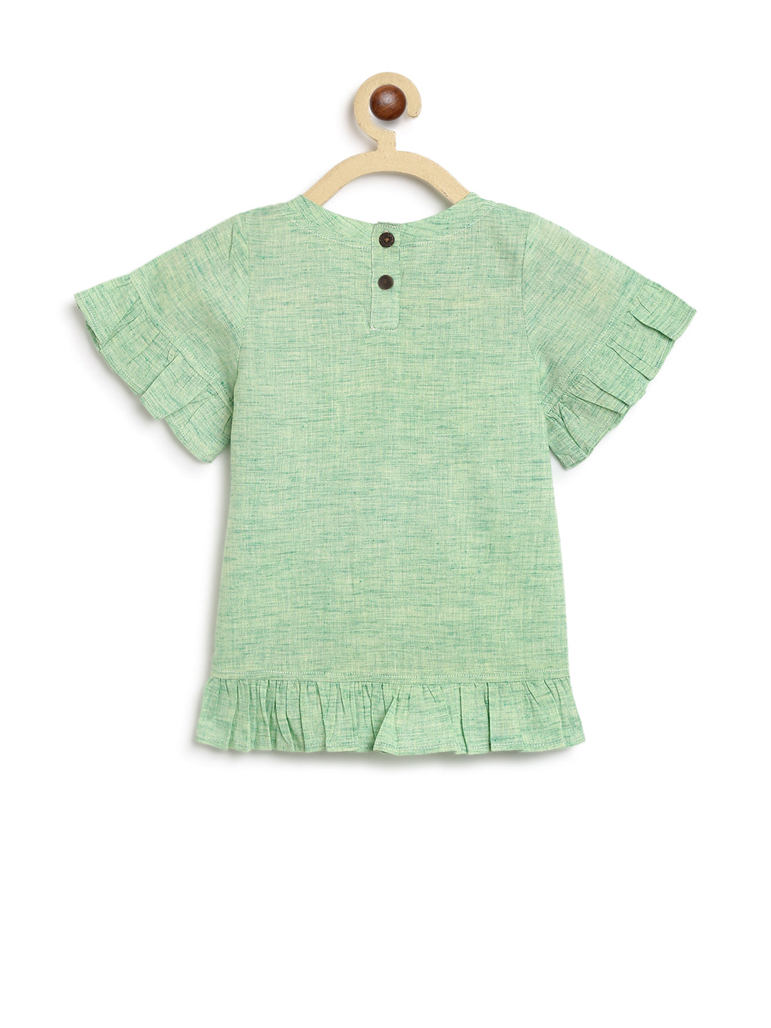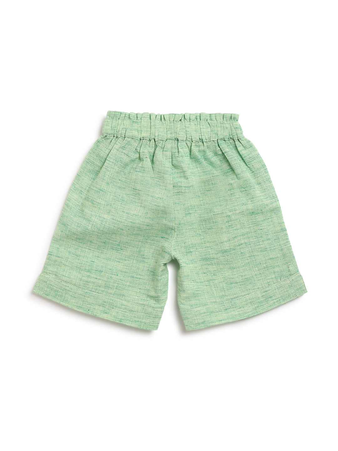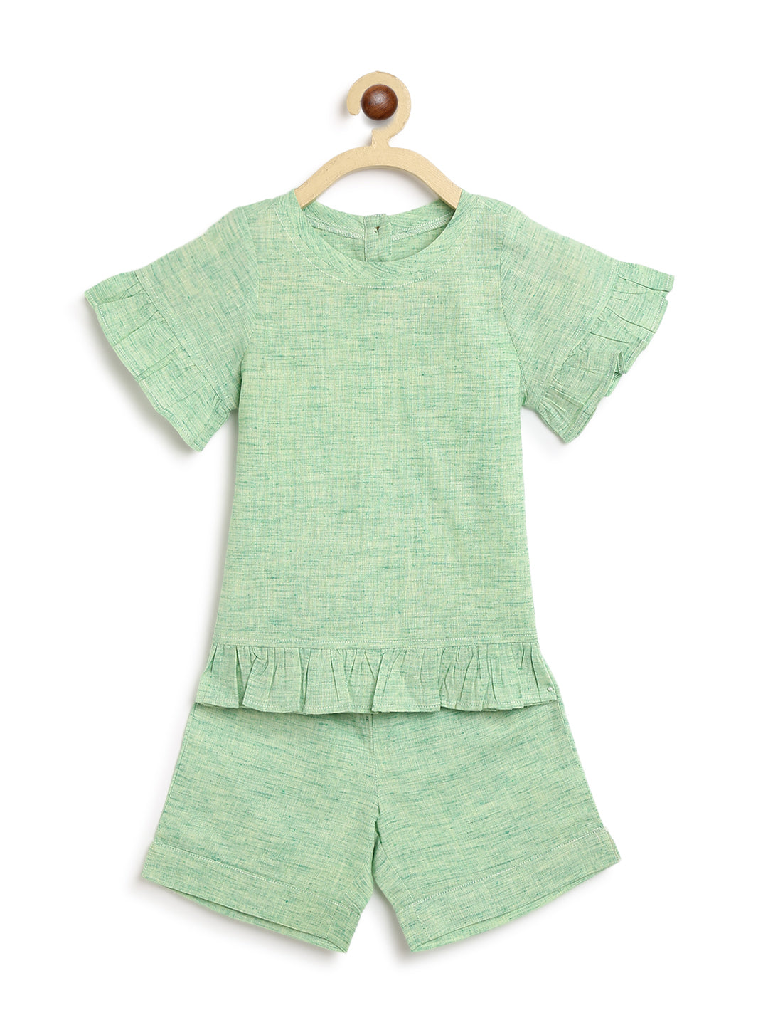 Green co-ord set consists of a top & shorts. Top has round neck, keyhole at back neck and ruffle details at sleeve and hem. Shorts has elasticated ruffled waistband with slip-on closure and has patch pocket.