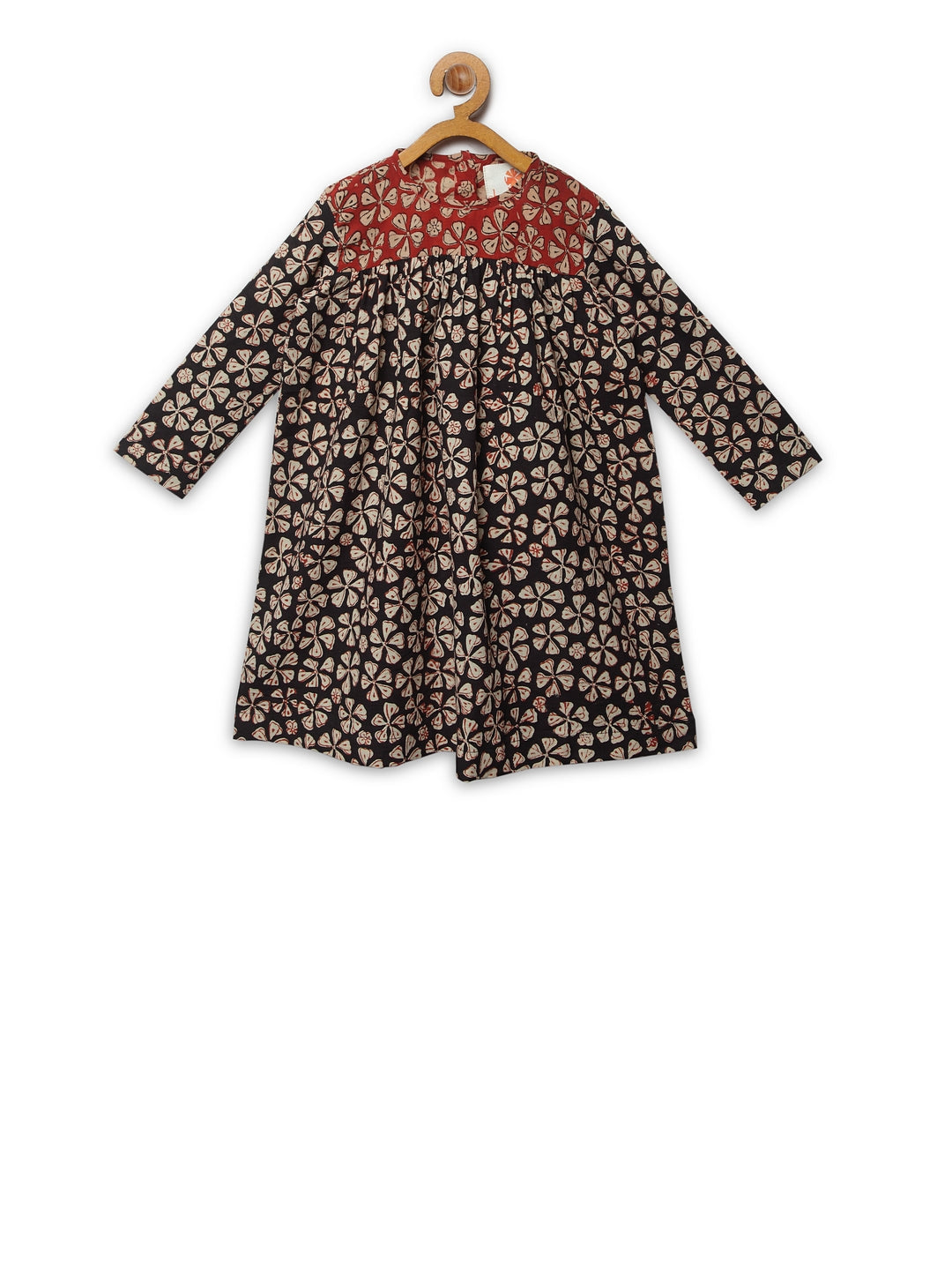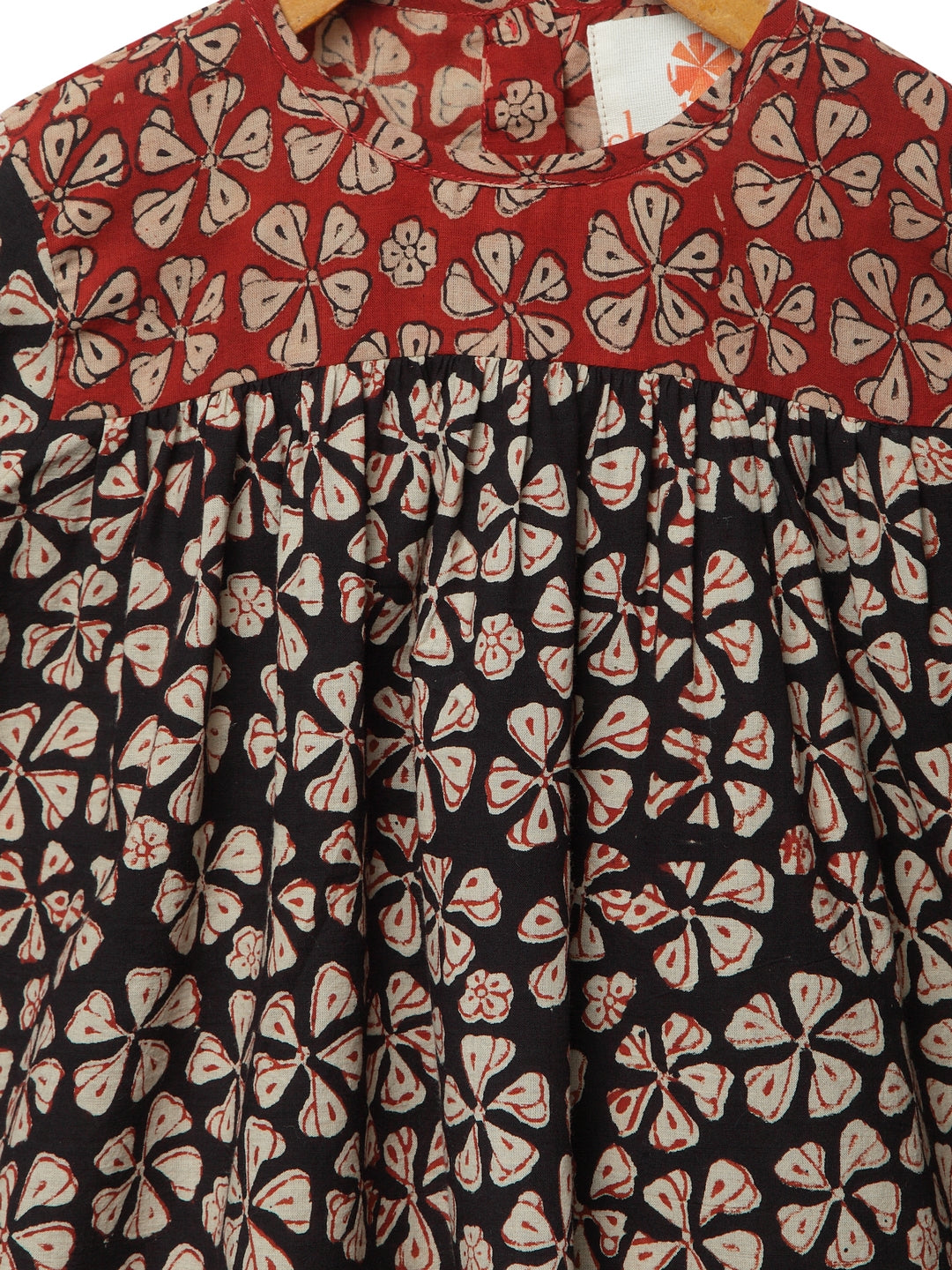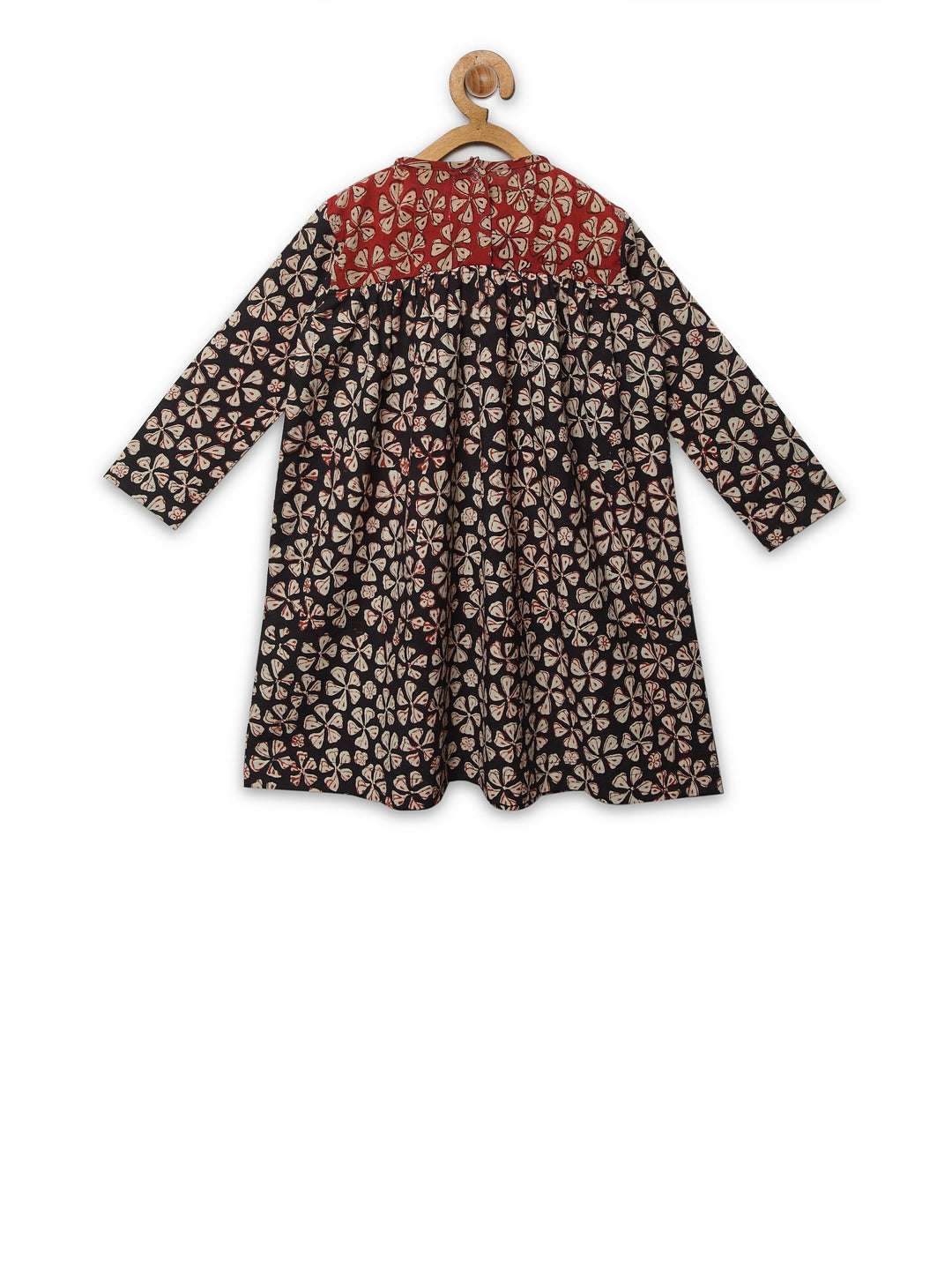 Black hand block printed floral A line dress with contrast yoke button opening at back.