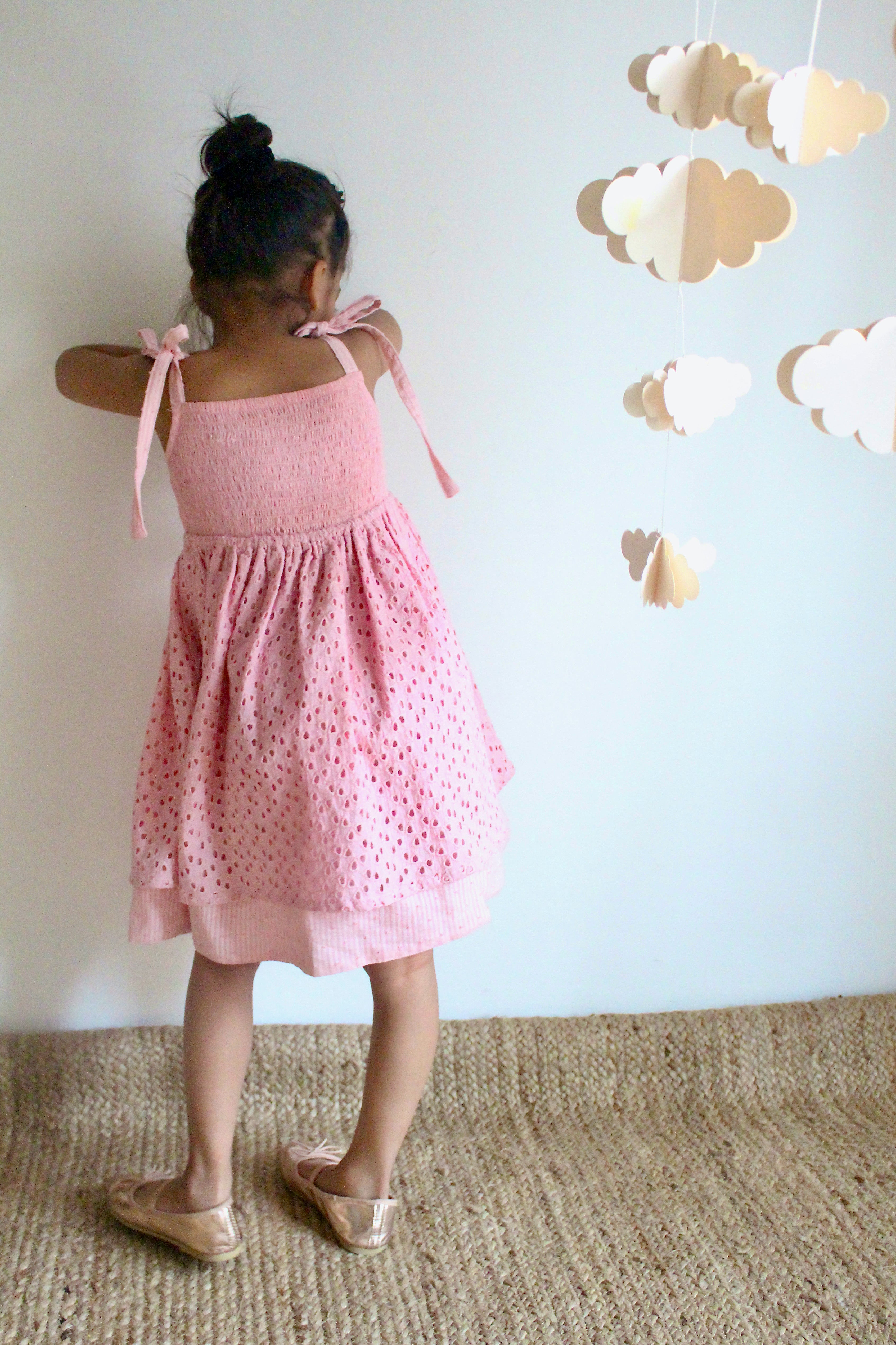 Flared dress with tie-up. Upper has smocking and lower layered with cotton dobby & schiffli. Comfortable wear for girls all day long!