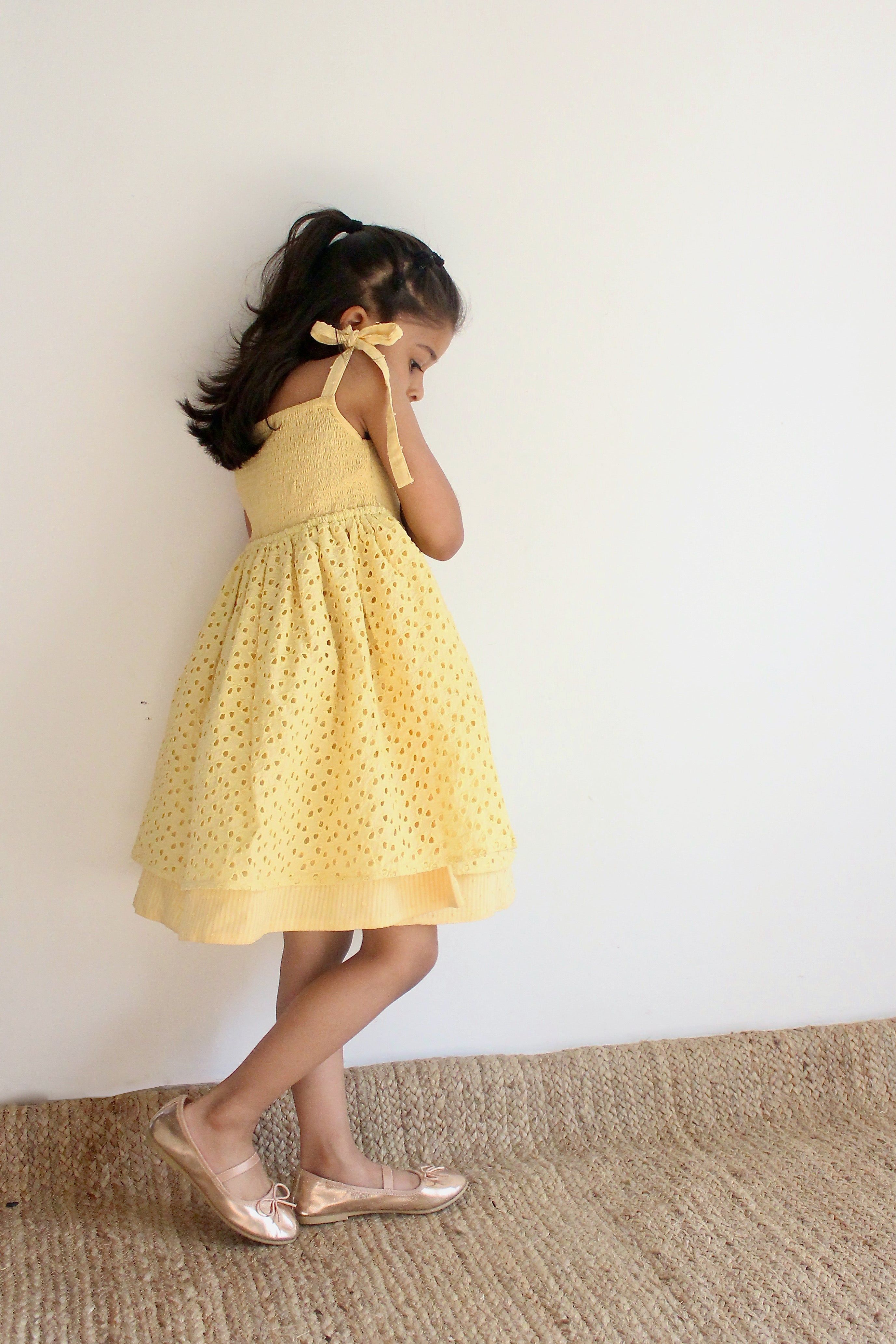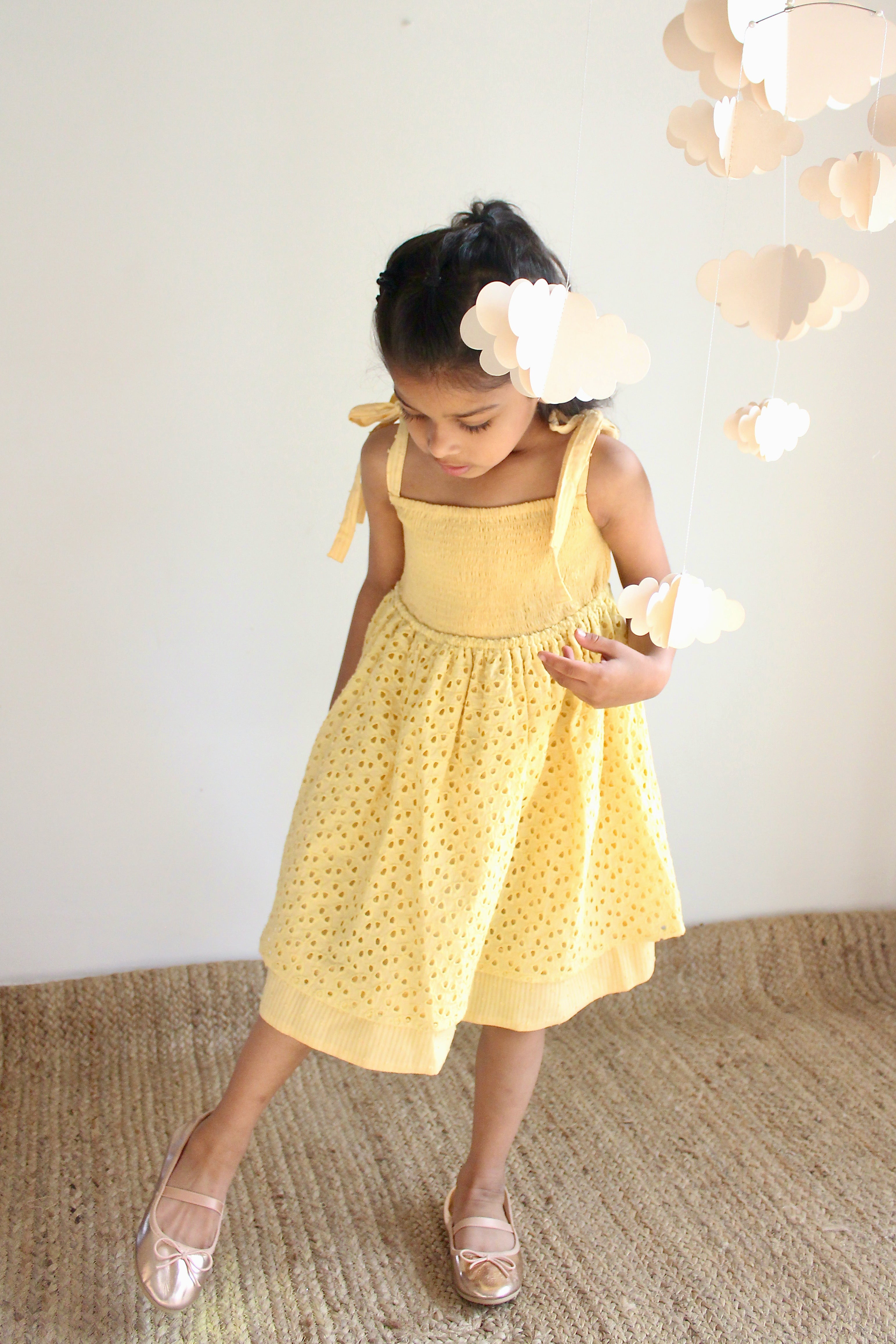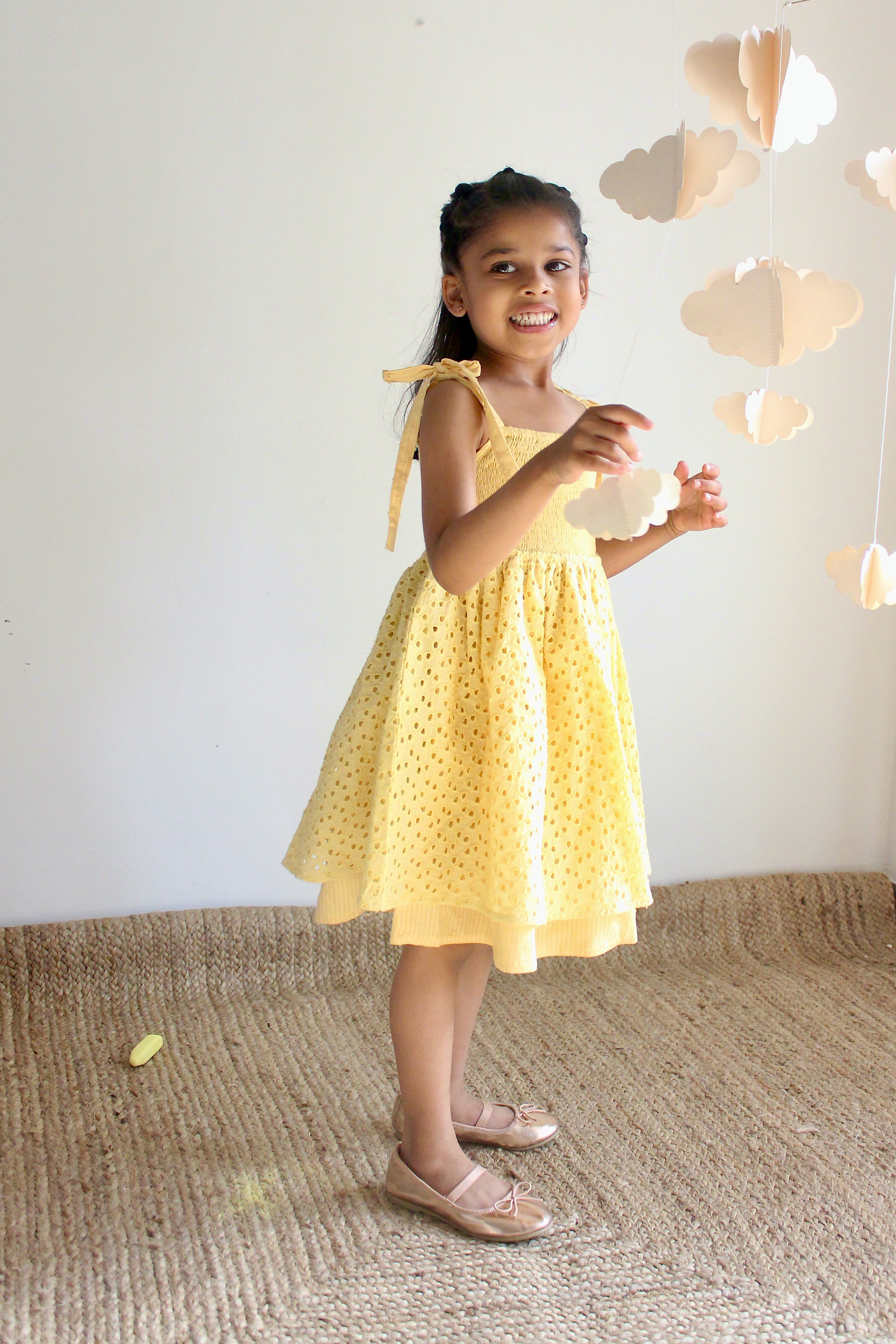 Flared dress with tie-up. Upper has smocking and lower layered with cotton dobby & schiffli. Comfortable wear for girls all day long!