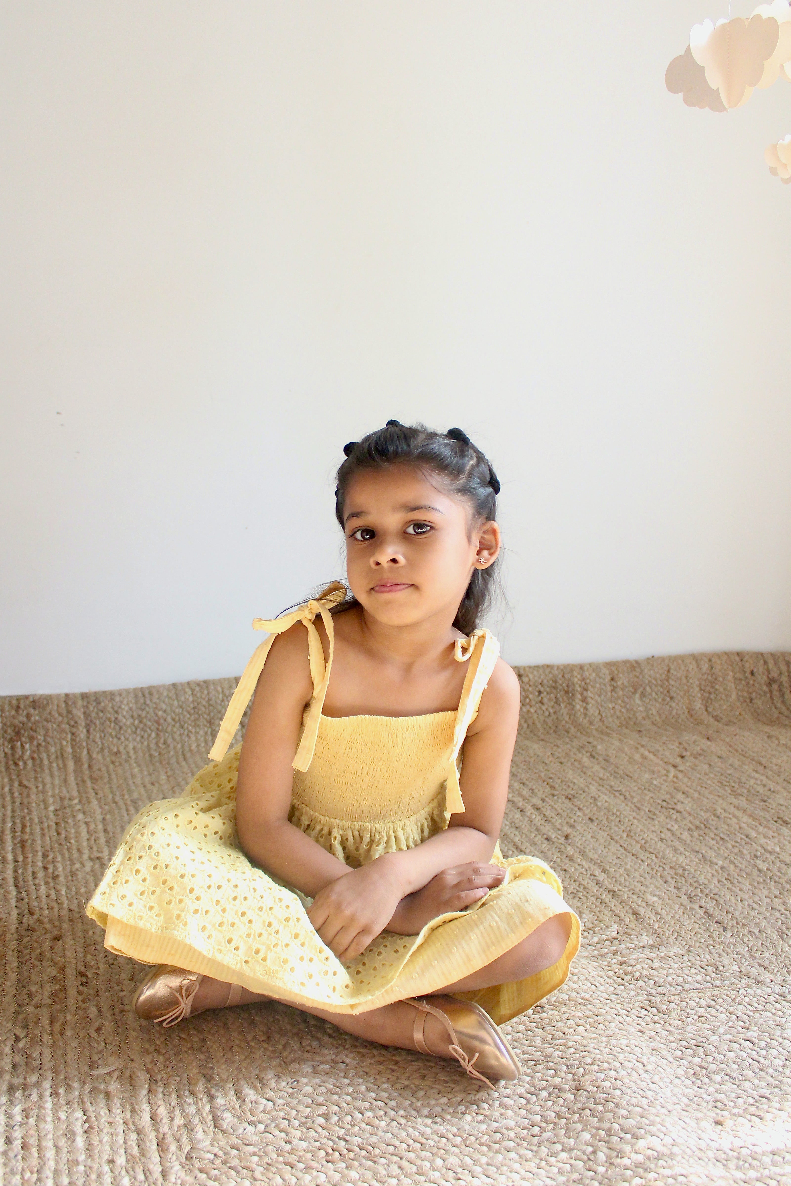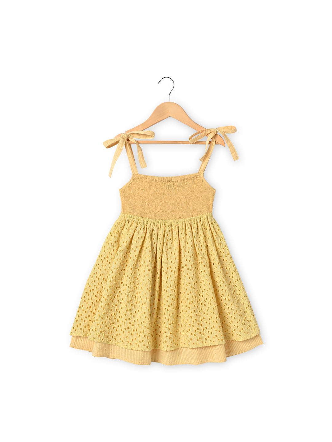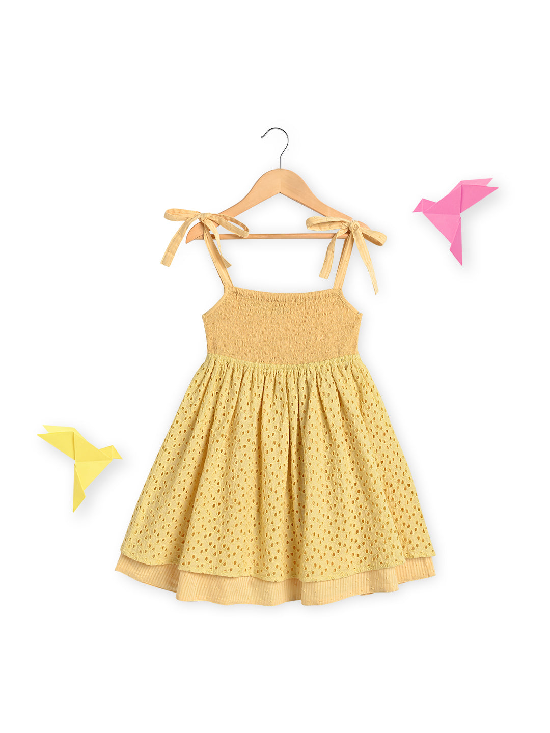Flared dress with tie-up. Upper has smocking and lower layered with cotton dobby & schiffli. Comfortable wear for girls all day long!