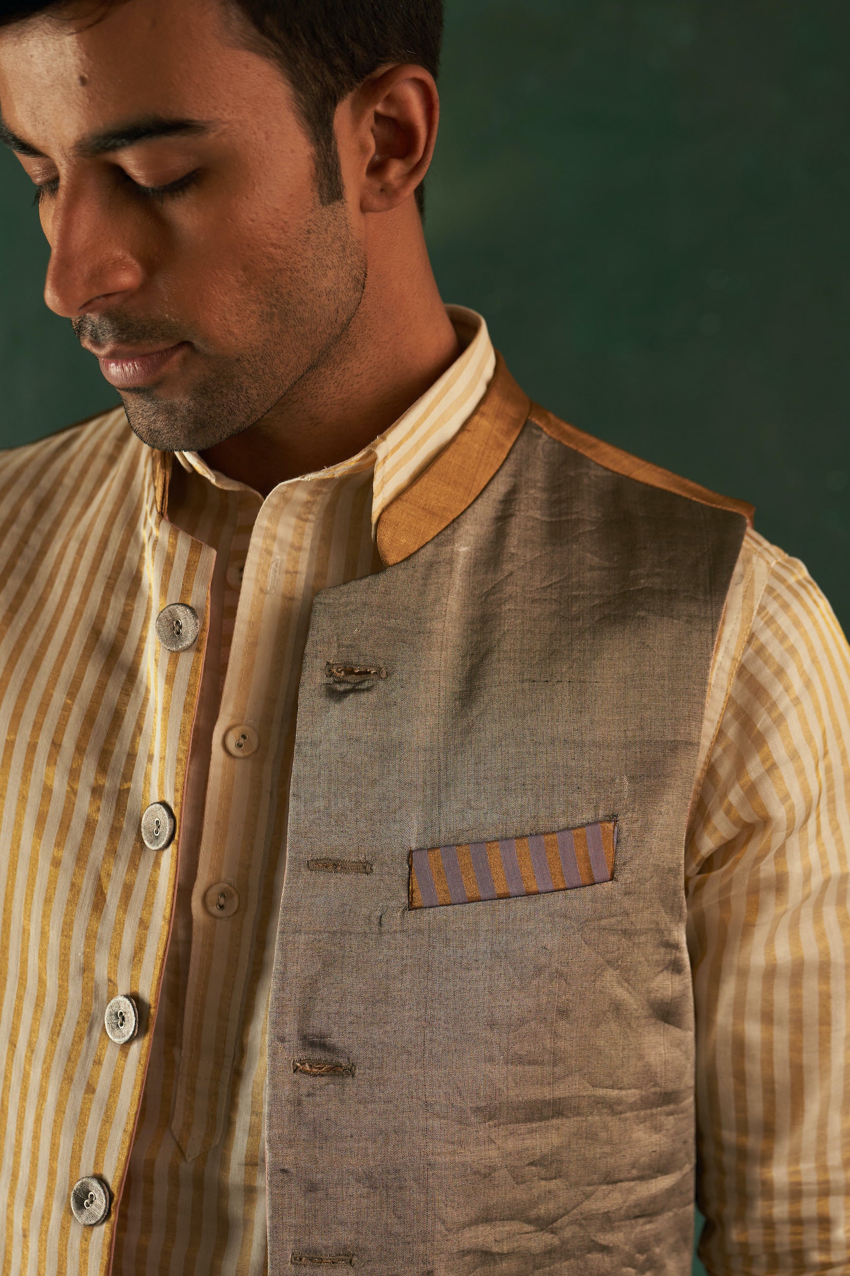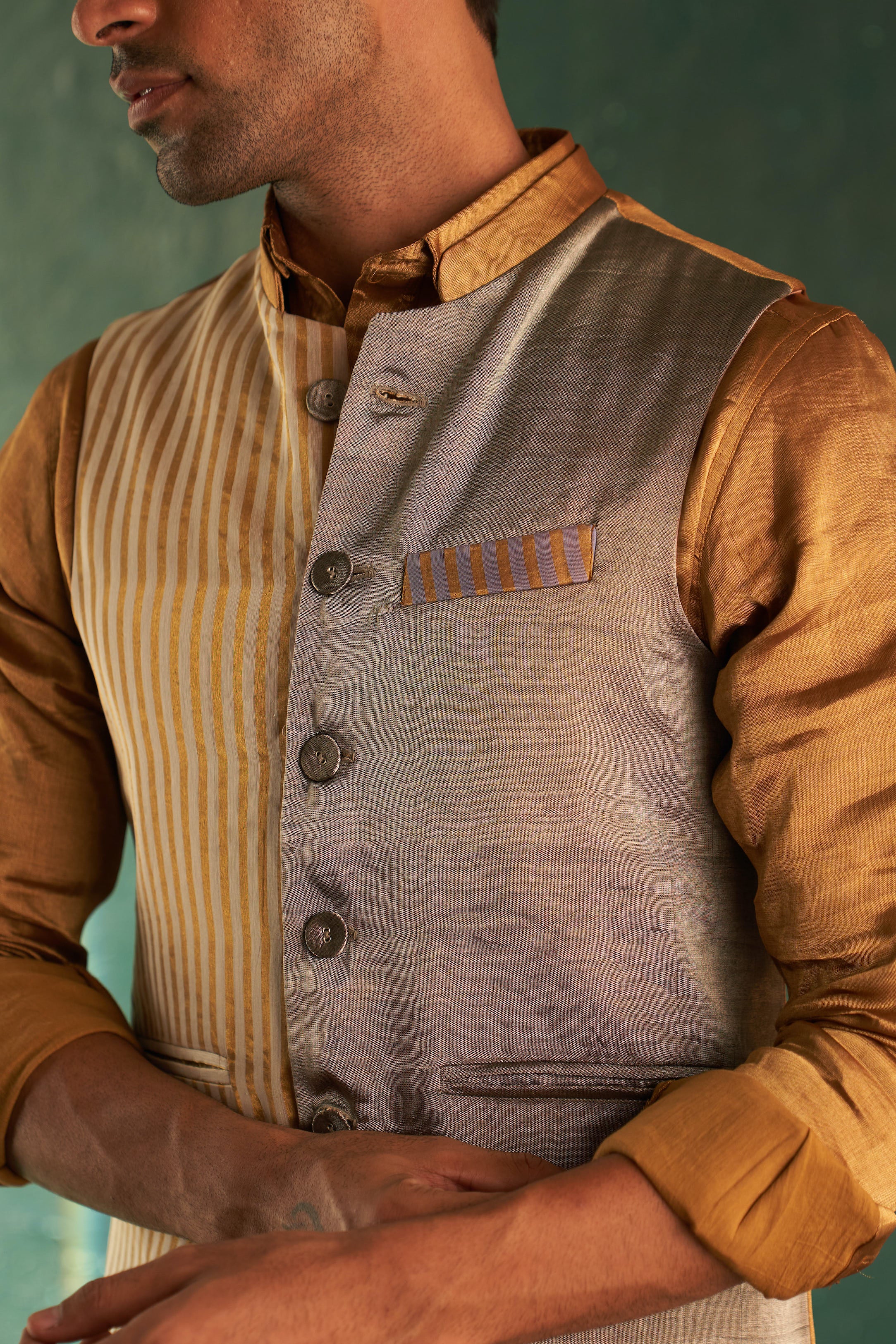 This luxurious, regal multi-patch Nehru jacket crafted from the softly-woven silk tissue can instantly elevate any ensemble to occasion-suitable attire.