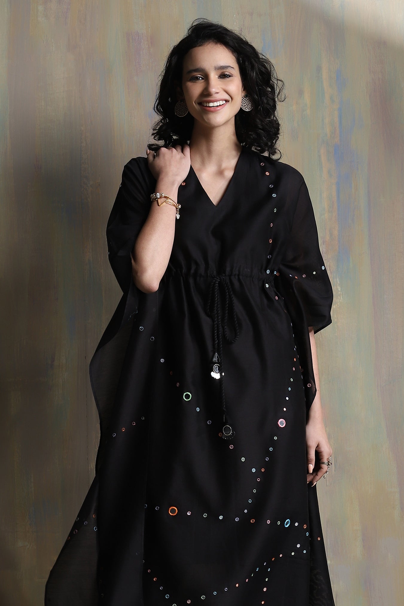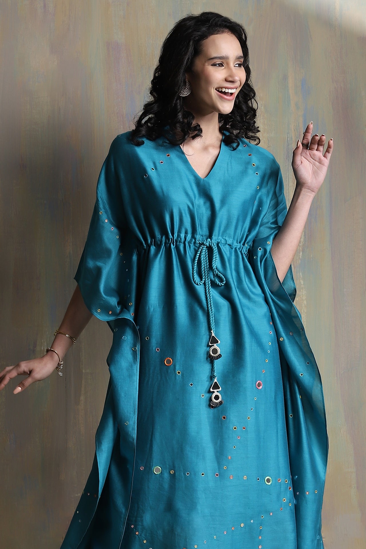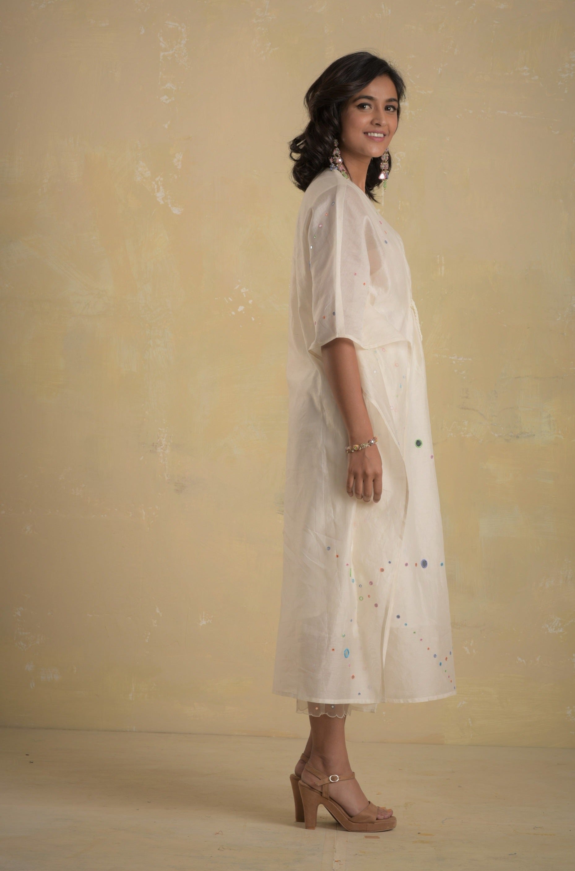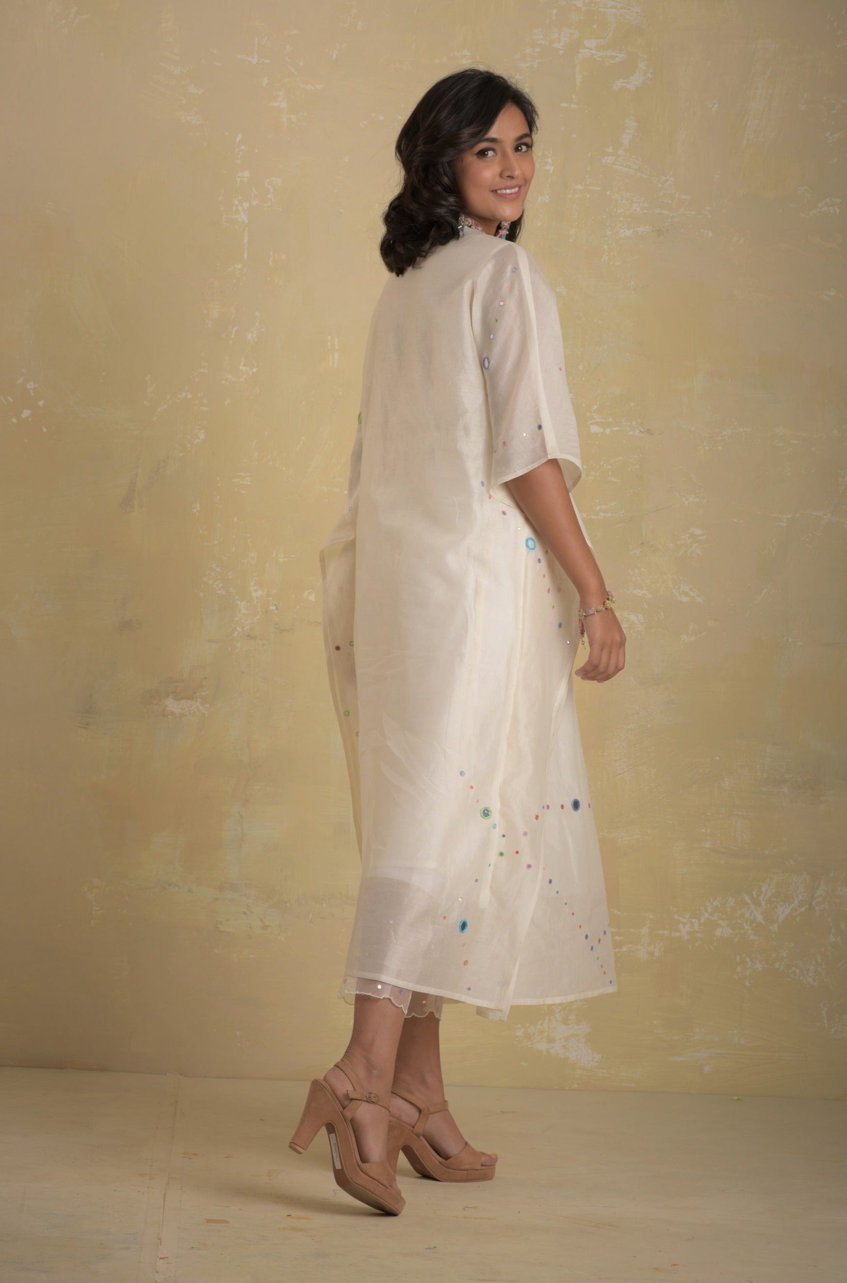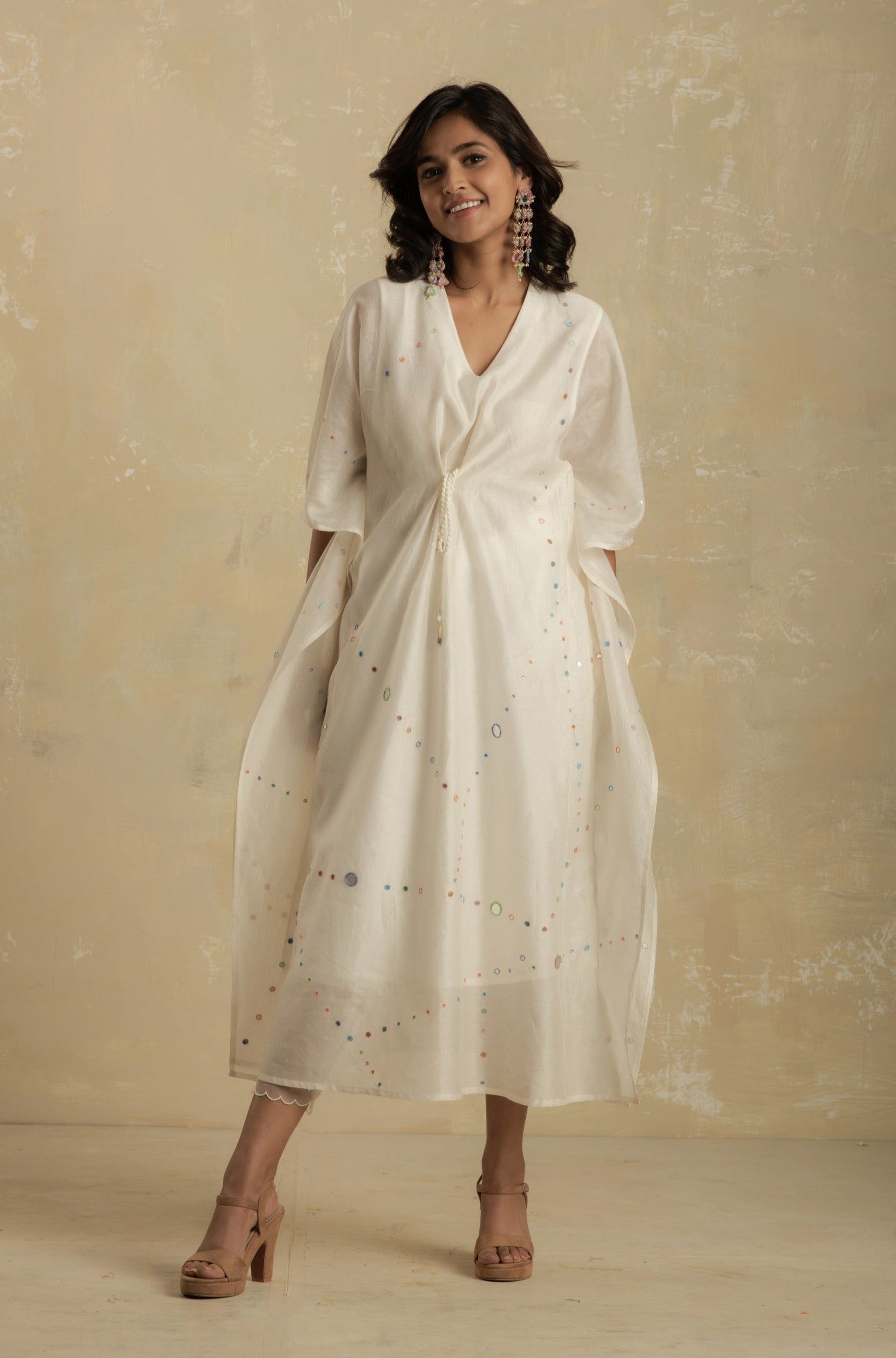 Chanderi white kaftan with colored embroidery embedded with mirrors and a front drawstring with mirror hangings, loose fit with gathers and side slit.