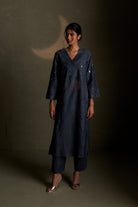 This kurta set blends classic elegance with celestial charm. The broad placket kurta is adorned with subtle star motifs and a crescent moon crafted in real glass, standing out beautifully against the delicate starry night embroidery on the neckline and sleeves. Paired with comfortable palazzos, it comes with a soft mul dupatta featuring crescent moons in glass placed all along the edge with scattered star motifs at some places , adding a graceful touch of festive sparkle.