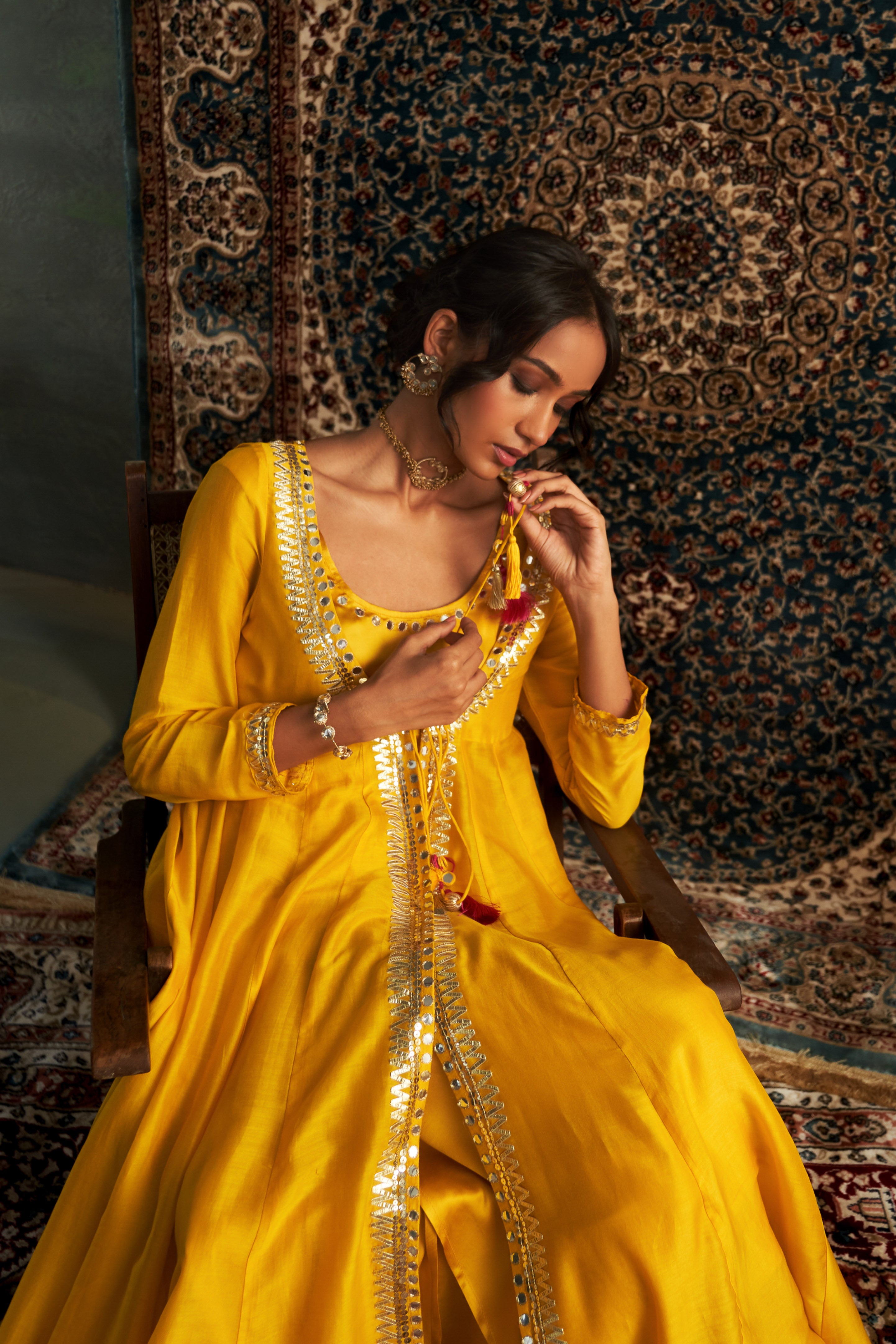 Our long-sleeved, flowy Choga is crafted from timeless chanderi fabric, offering an effortlessly luxurious aesthetic. Adorned with intricate gota, mirror, and sequin hand embroidery along the neckline and sleeves, this piece sparkles with artisanal charm. The front is finished with dori tie-ups and elegant tassels, adding a hint of quaint sophistication.