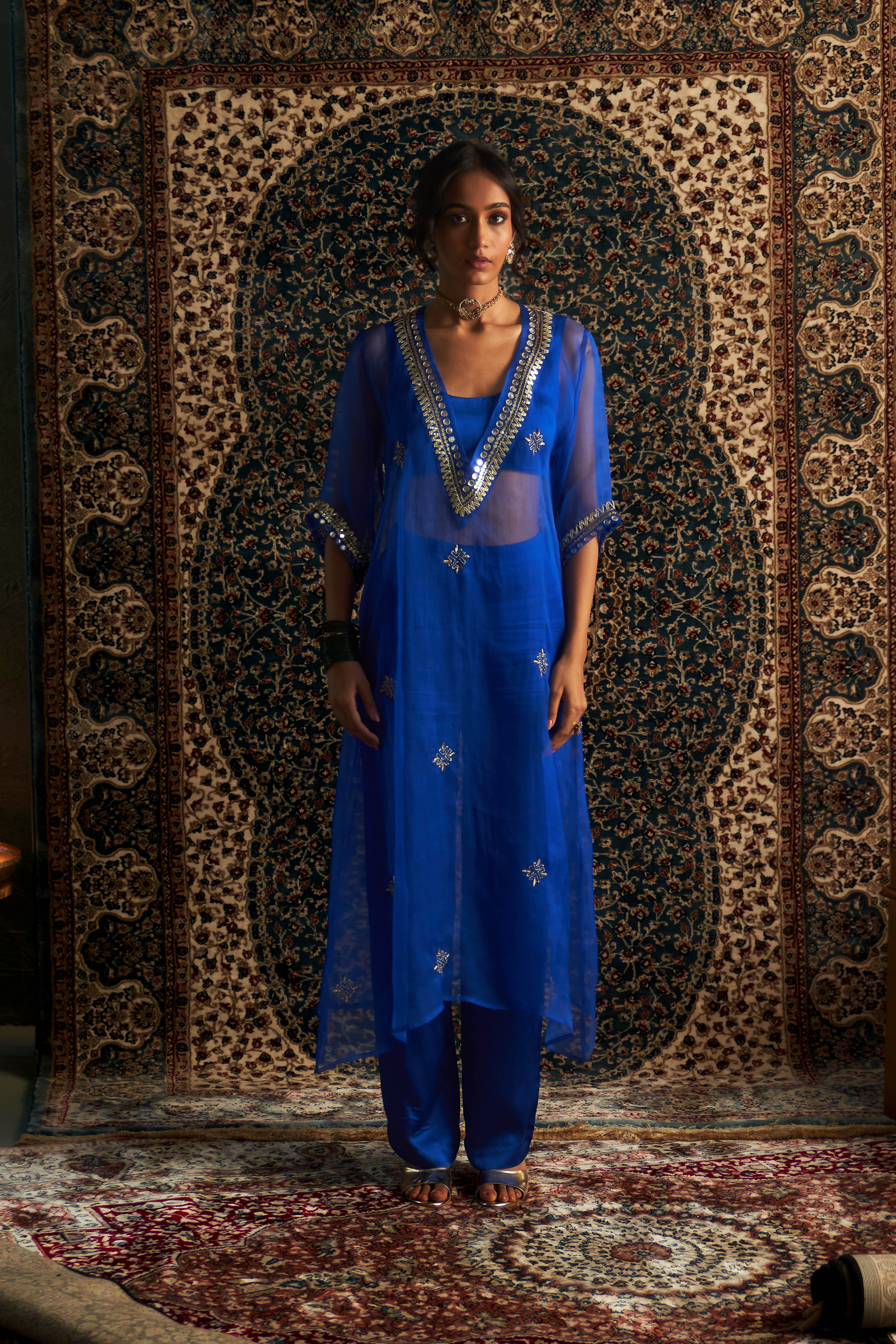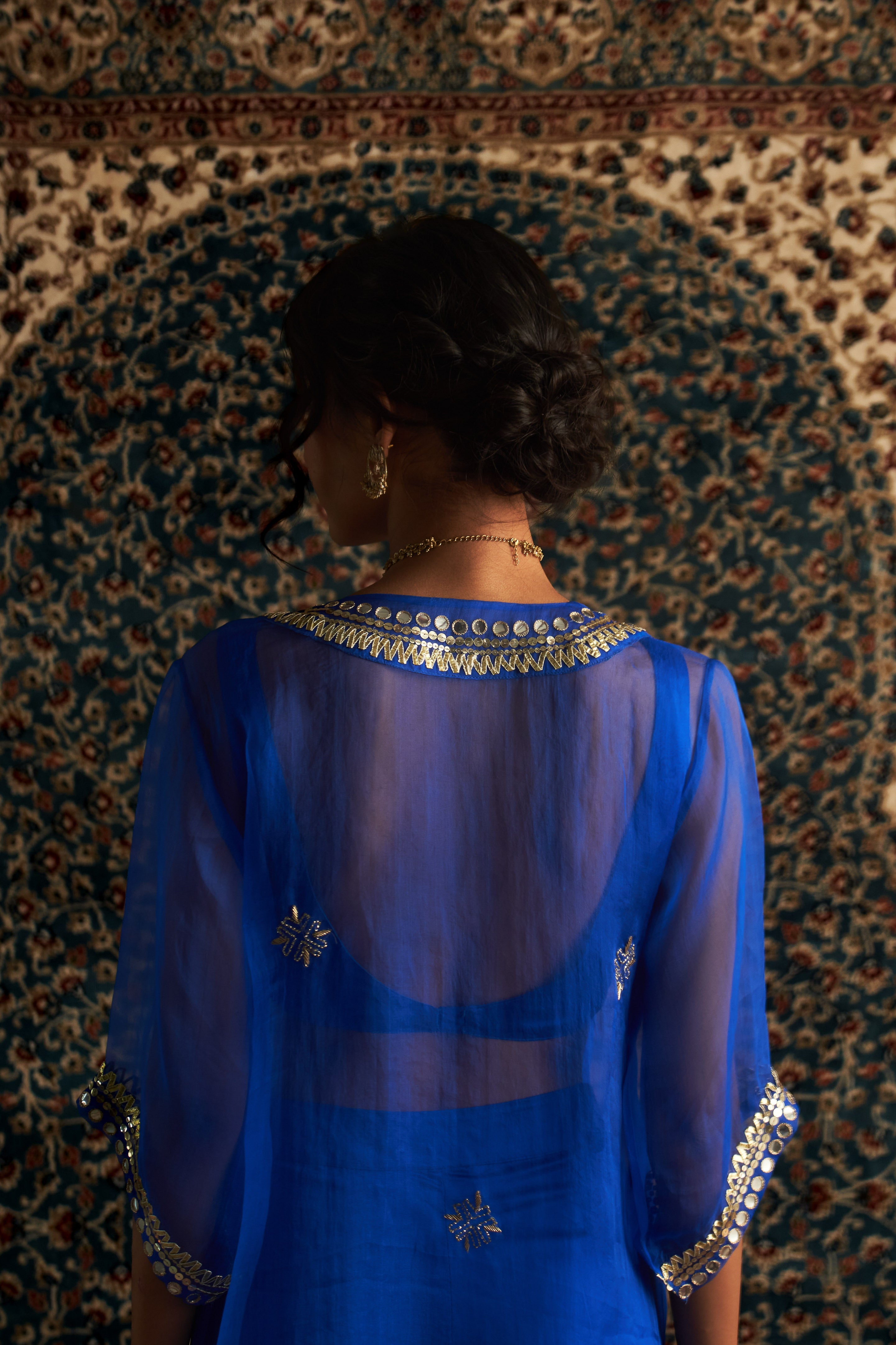 This Blue long Kurta is a showstopper for any occasion, radiating effortless elegance and refined sophistication. Crafted from luxurious organza, this sheer overlay kurta boasts exquisite hand-embroidered dabka and zari motifs across the fabric, with intricate gota and sequin detailing along the neckline and sleeves that adds a touch of opulence.