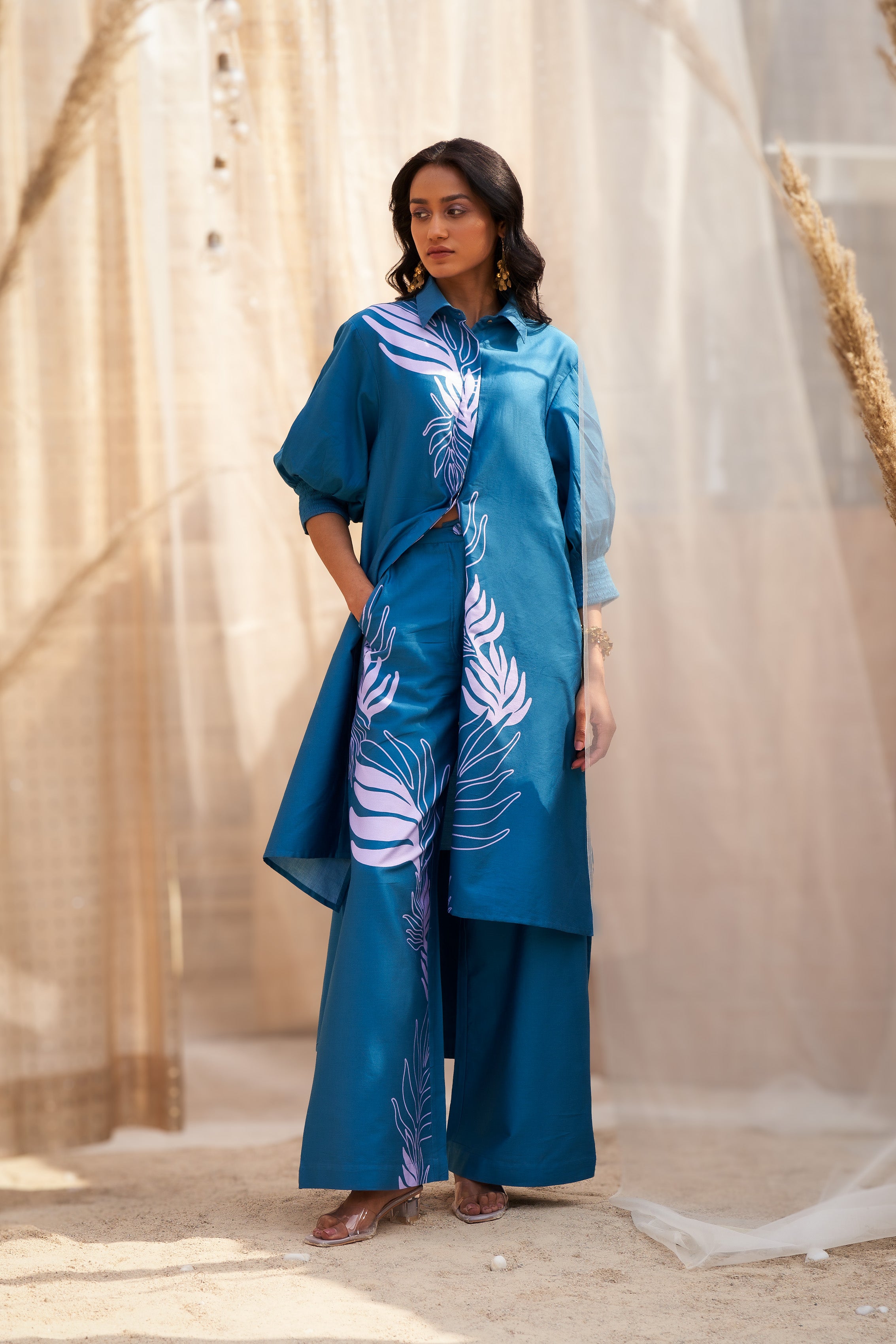 Redefine your elegance with this Charming Leaf-Print Co-ord Set, designed for modern elegance and sophistication. The kurta features a collared neckline and a front-buttoned design, adding a structured and contemporary appeal. Delicate Zari-highlighted motifs enhance the charm, making it perfect for special occasions. Unique smocking details on the sleeve cuffs add a playful yet refined touch, while the hi-lo kurta panels bring movement and flair to the outfit. Paired with flared pants, this ensemble offers a comfortable yet chic silhouette. Accessorize with statement jewelry and heels for a polished look that stands out.