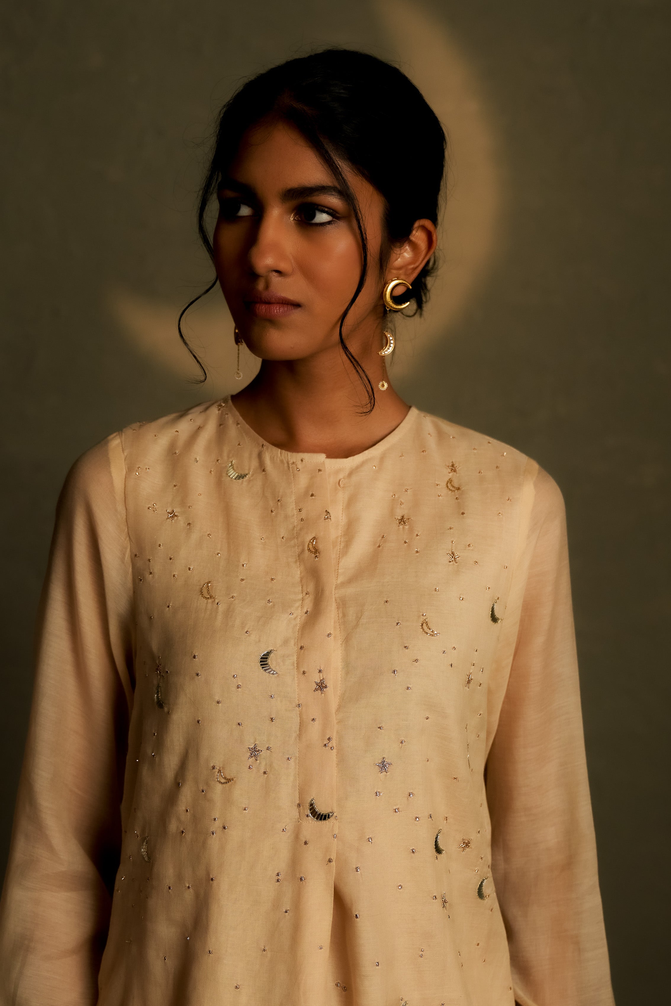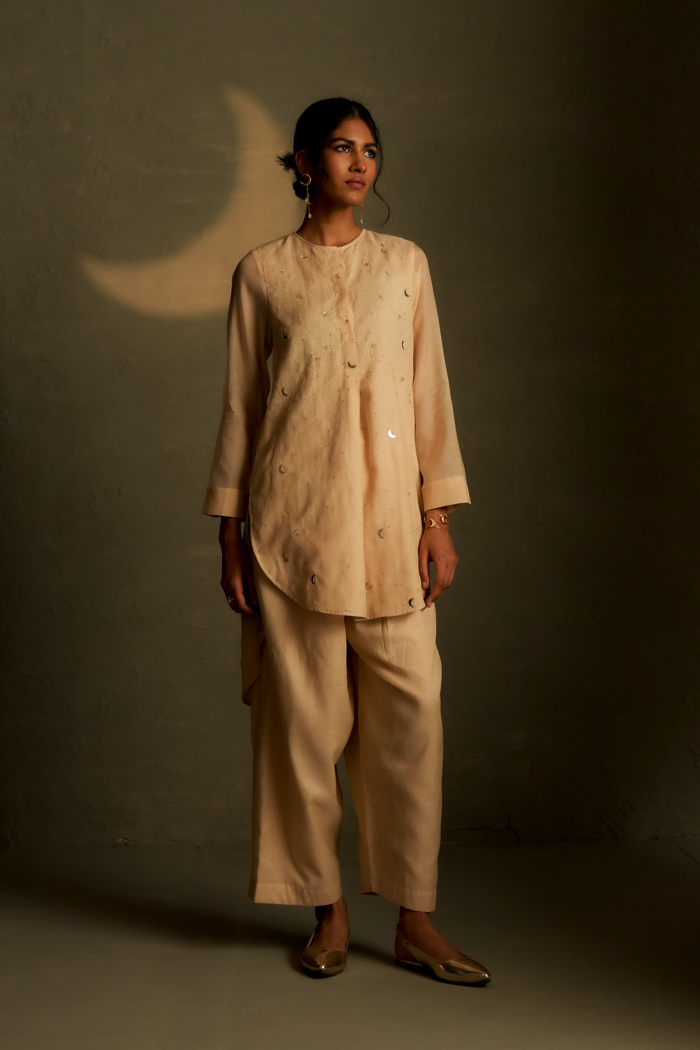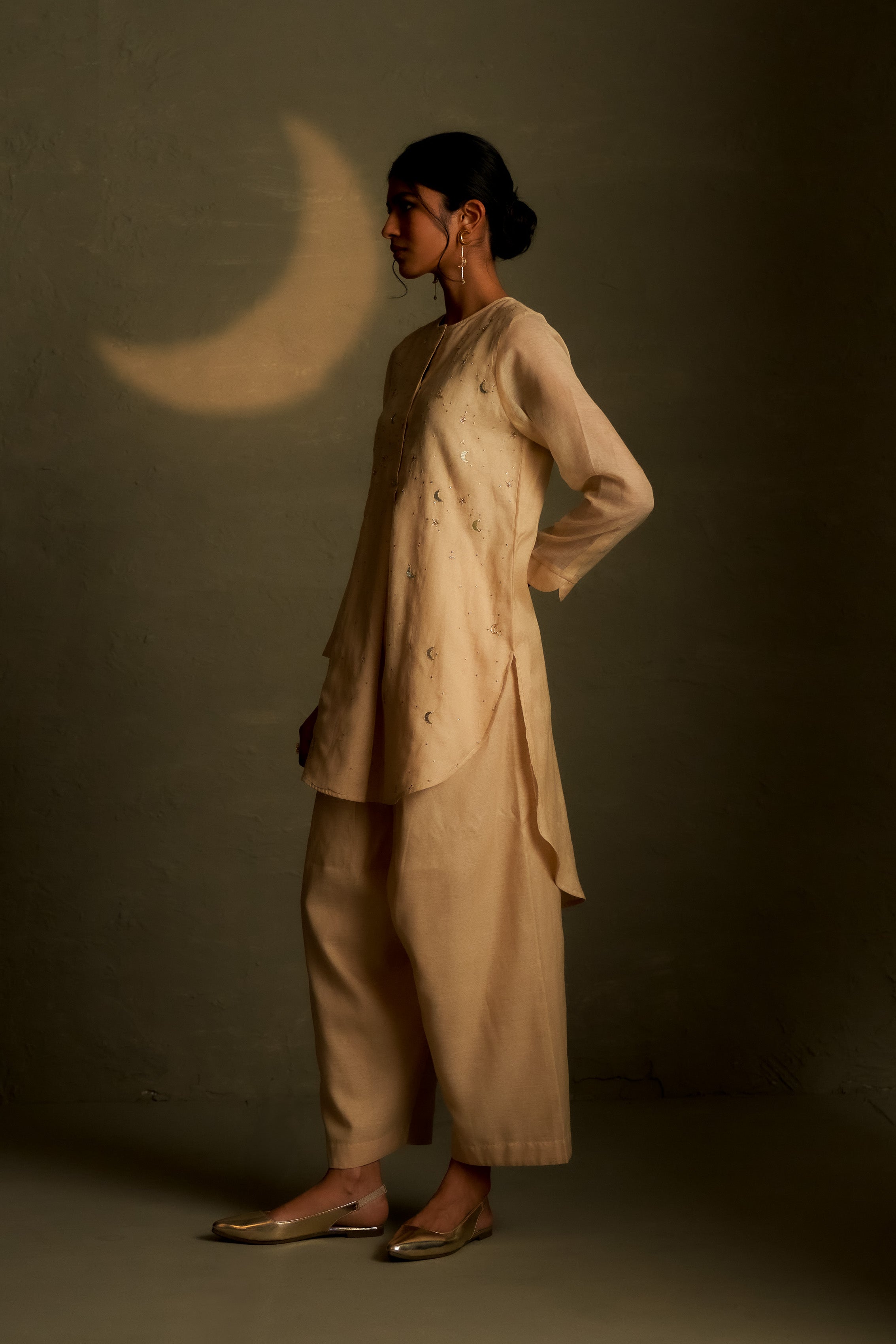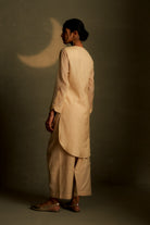 This beige hi-lo kurta set blends festive charm with modern ease. The front features subtle star motif embroidery with a soft shimmer—just enough to catch the light without overpowering. Paired with a relaxed, loose-style salwar, it’s a graceful yet contemporary choice for any festive outing.