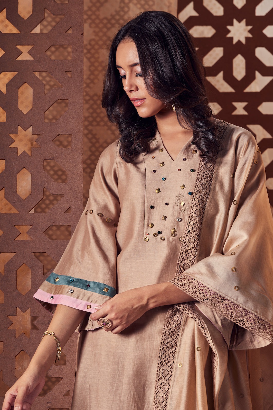With bell sleeves and embroidered yoke, this kurta set balances comfort with elegance. It features beautiful embroidery work intricately set with zari, studs and gems.