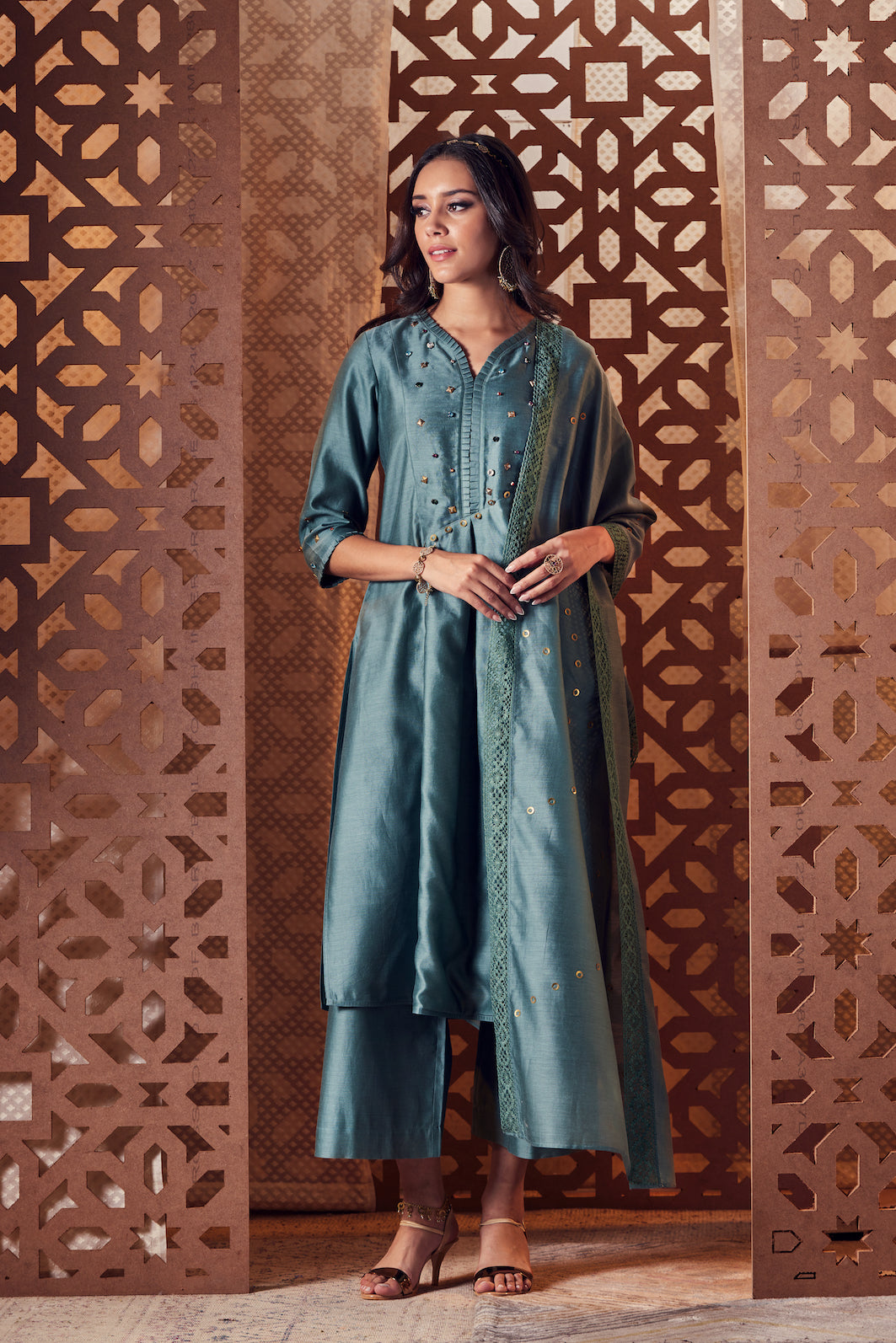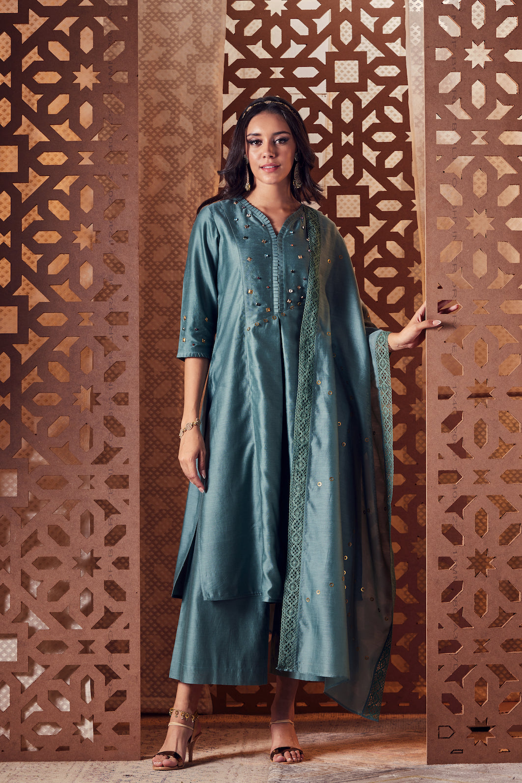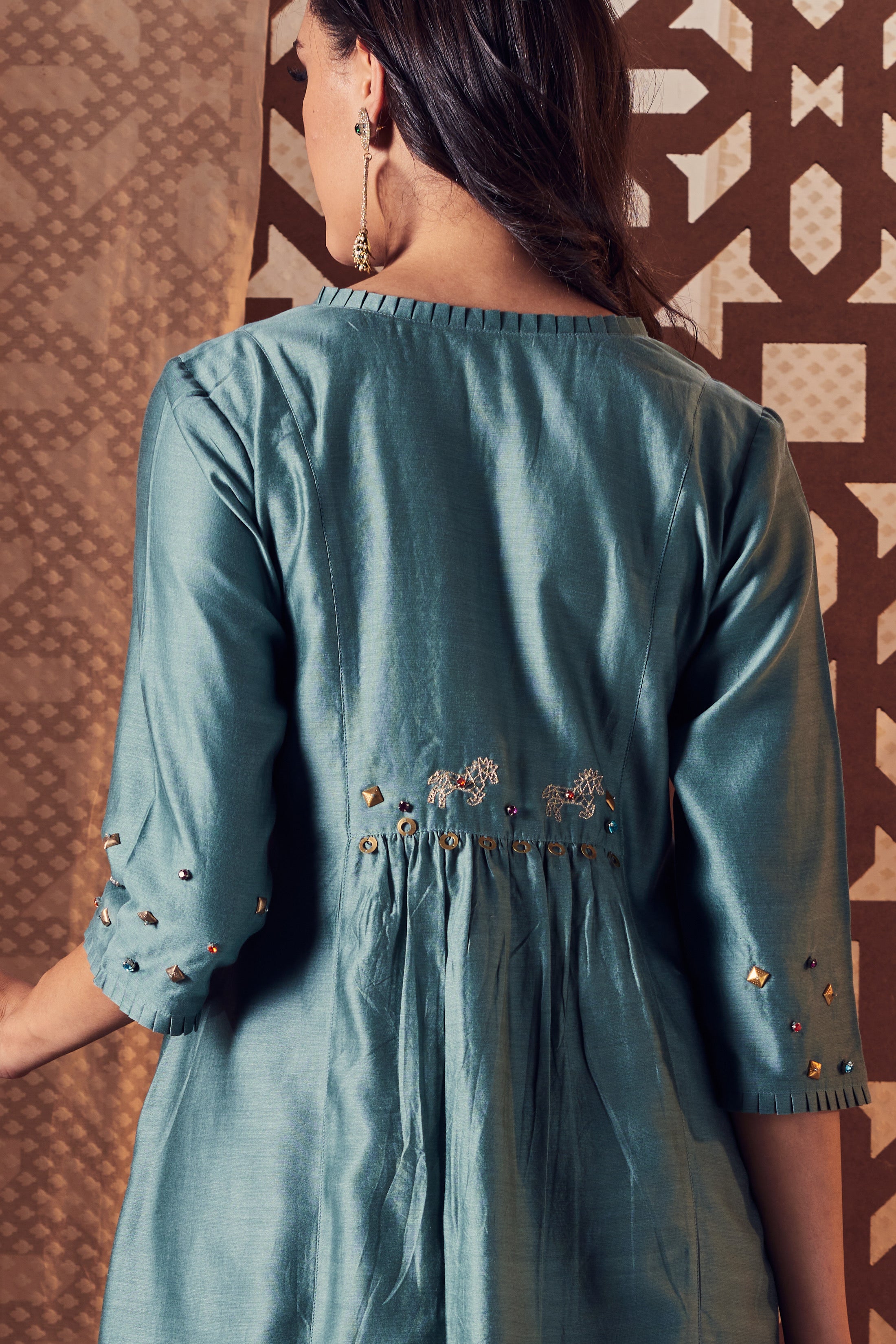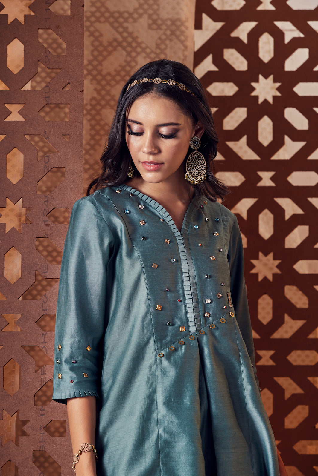 This chanderi relaxed fit kurta with its yoke beautifully set with intricate pleats, embellished with studs and gems is all the sparkle you will need for your upcoming celebrations.
