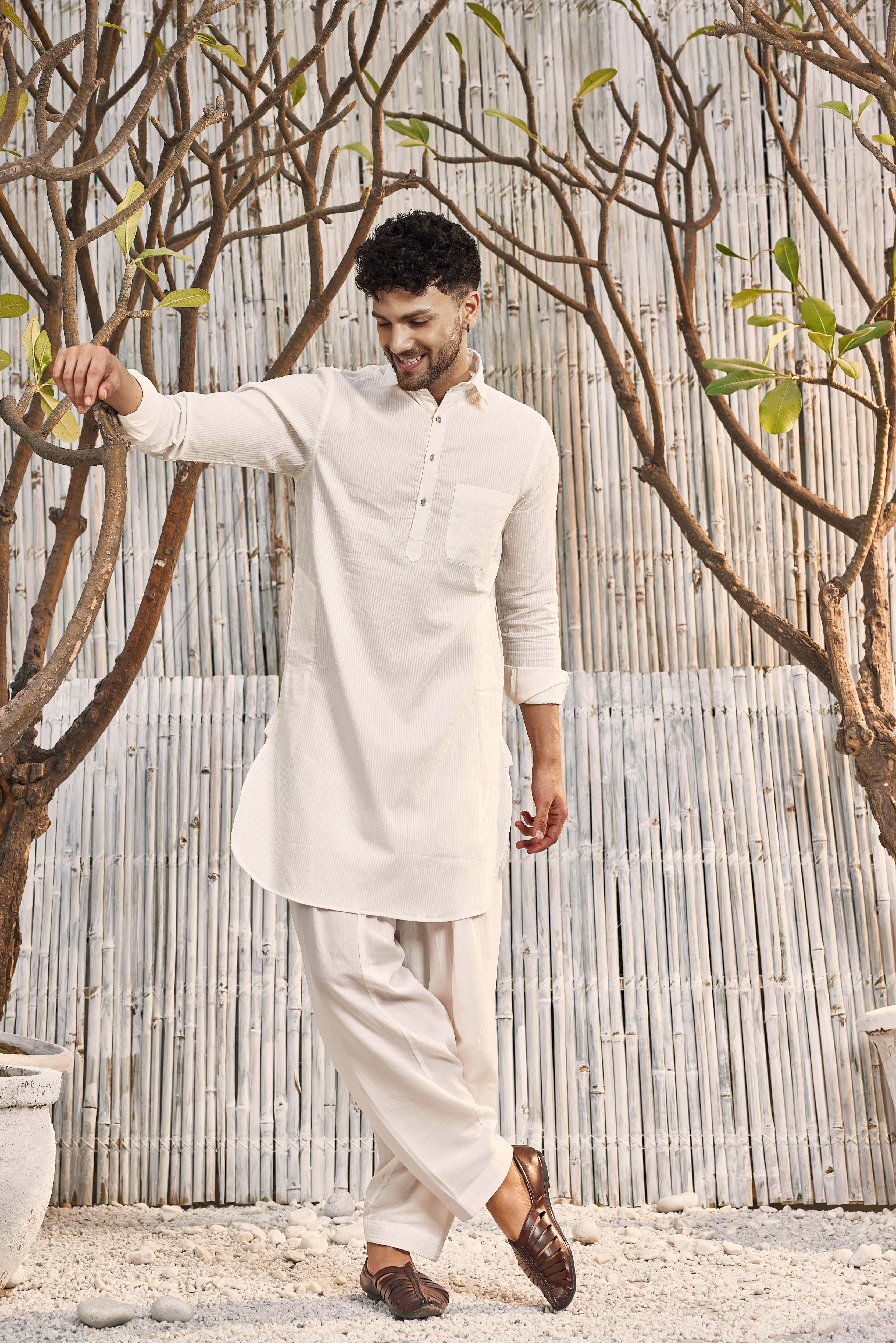 Our classic pathani in off-white textured cotton. It features, classic shirt collar, foldable sleeve, side pockets & a round shape bottom. Kurta is paired with salwar.