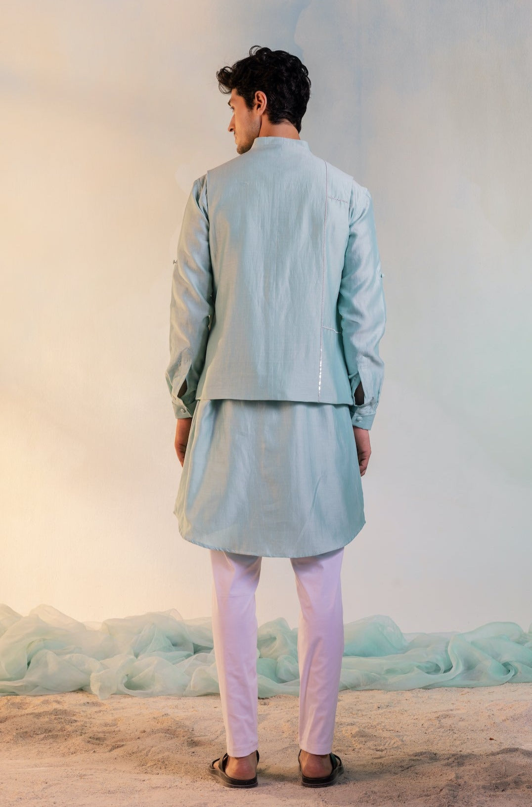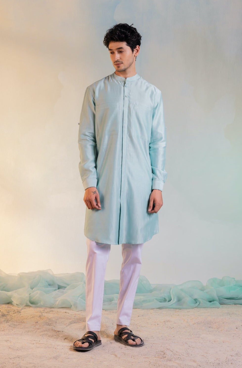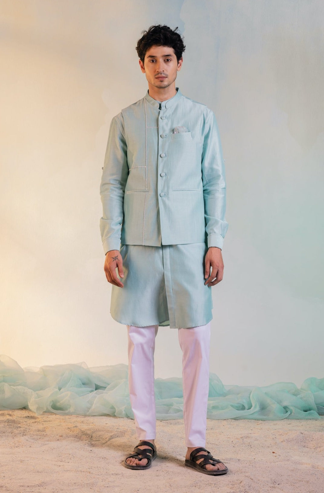 Comfort fit double pocket front slit kurta in pastel green paired with straight white cotton lycra pants. This formal look can be completed with a chanderi sequin work Nehru jacket.