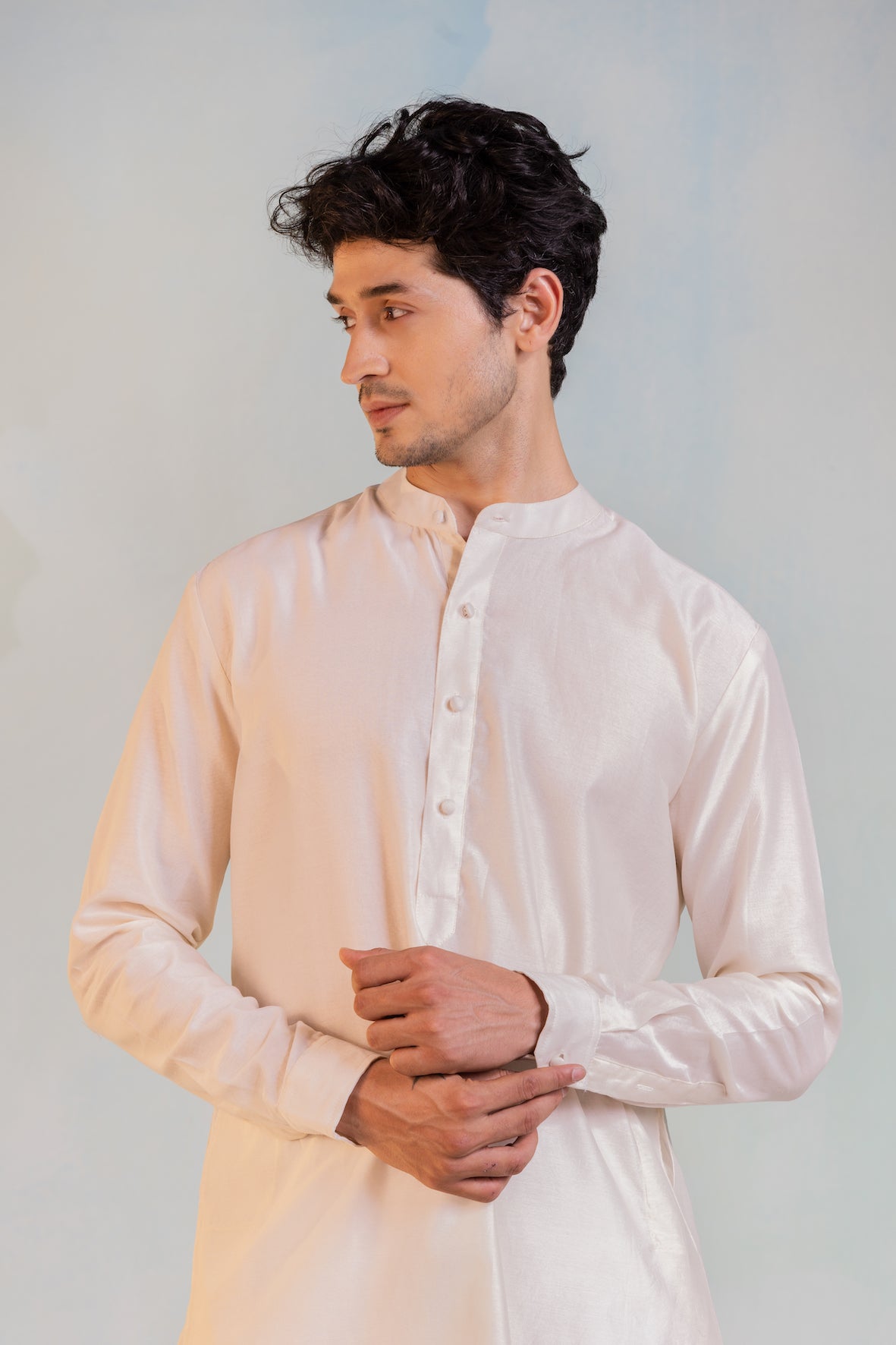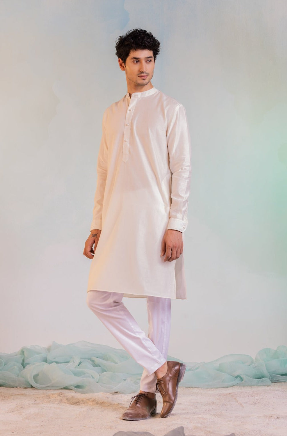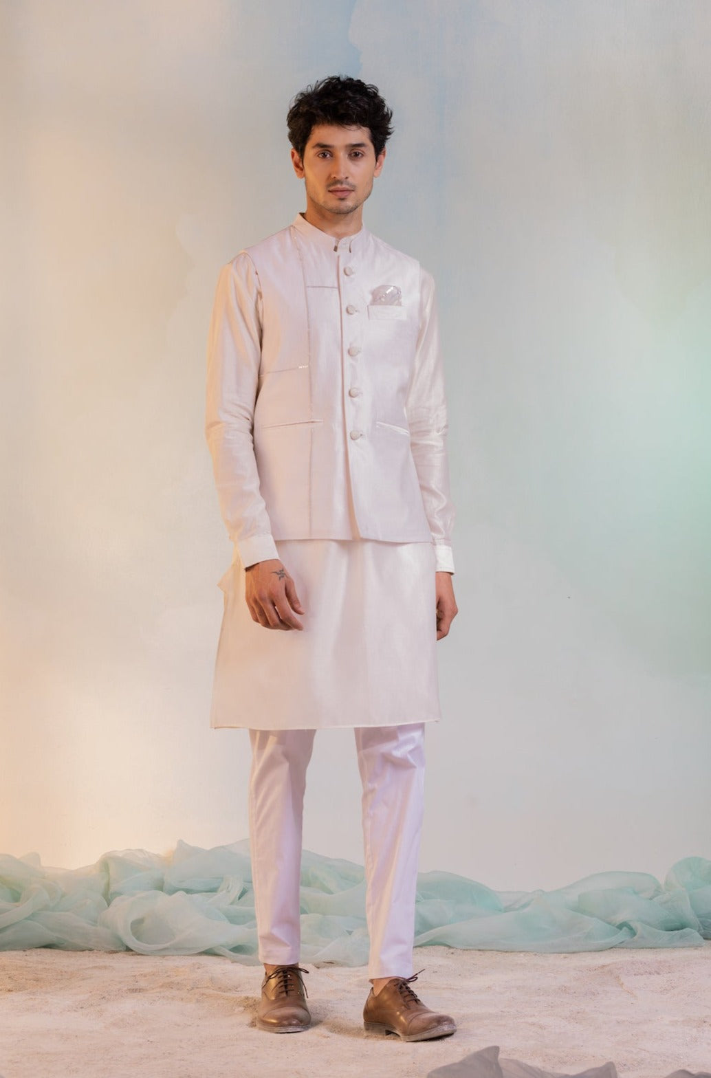 Comfort fit straight plain chanderi kurta, paired with straight white cotton lycra pants. This formal look can be completed with a chanderi sequin work Nehru jacket.