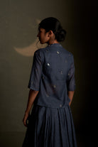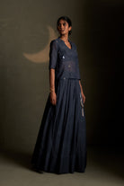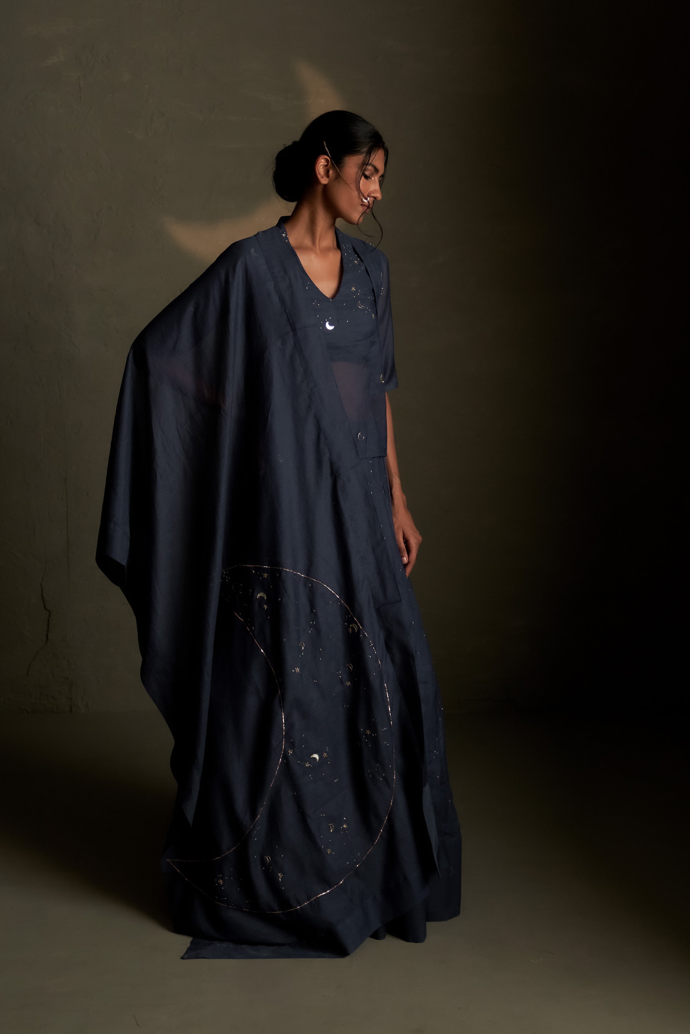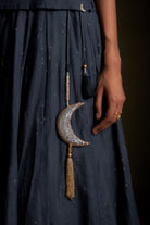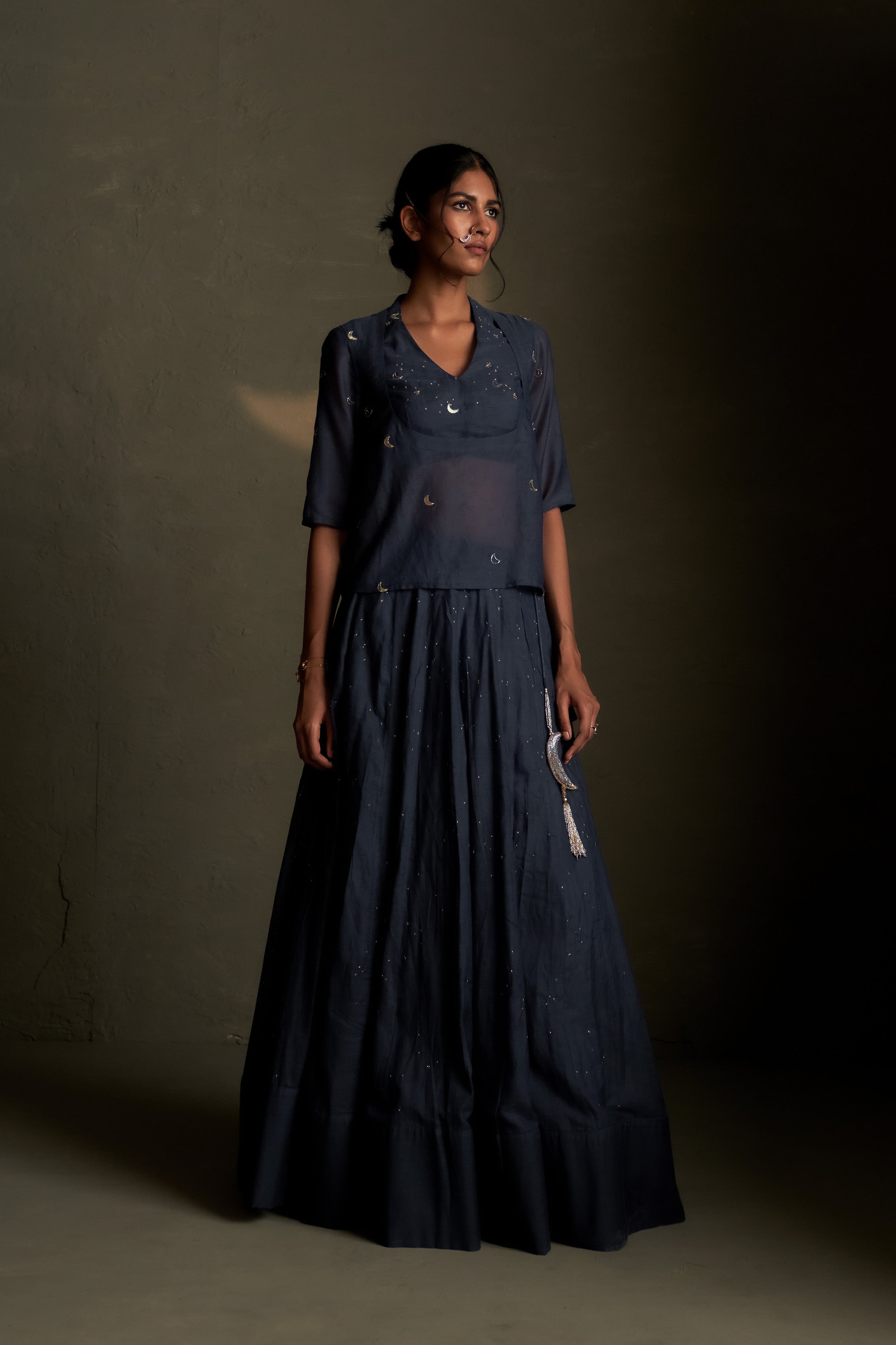 This lehenga captivates with a presence that feels both modern and timeless, mirroring the magic of the entire universe in its silhouette. The flared skirt is scattered with star motifs, forming a night-sky effect, and finished with a glittering hand crafted and embroidered crescent moon tassel at the tie-up. Its two-layered blouse features a sheer mul chanderi outer layer embroidered with delicate glass crescent moons, adding a touch of ethereal elegance. Paired with a broad mul dupatta showcasing a large crescent moon filled with star motifs and smaller glass crescents, this ensemble proves that simplicity can be striking, that makes you stand out effortlessly.