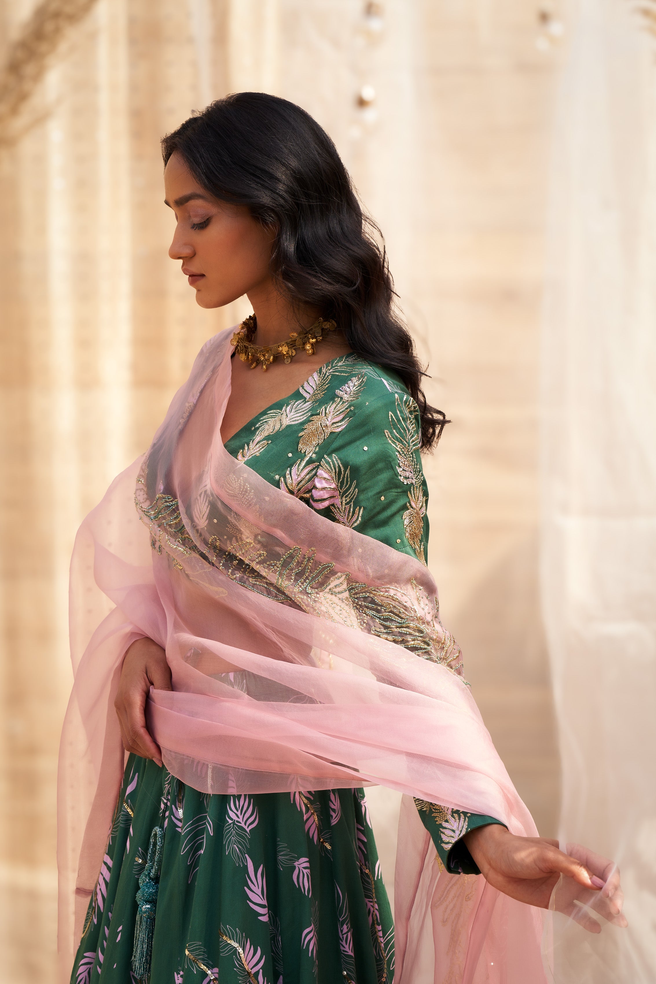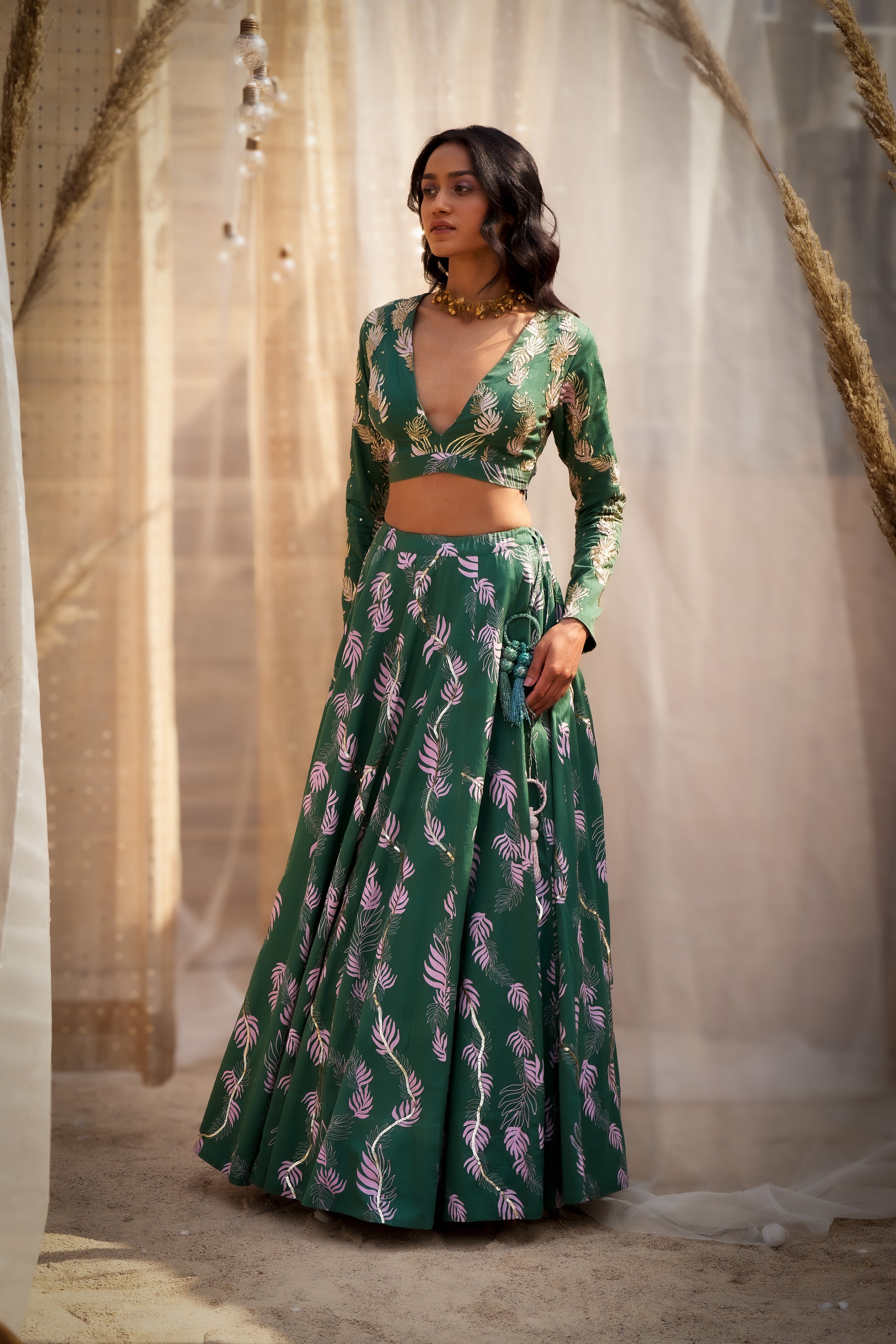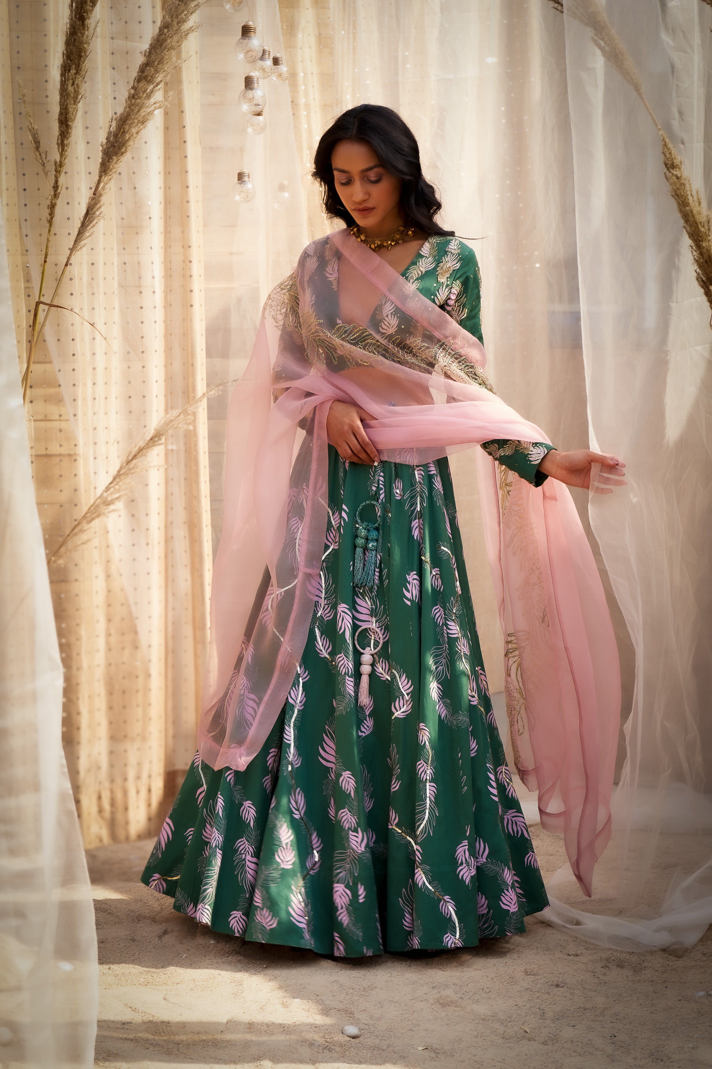 Embrace timeless elegance with this exquisite Printed Cotton Satin Lehenga in a stunning green shade adorned with delicate light pink motifs. The ensemble features a hand-embroidered blouse enriched with intricate Dabka, Zari, Cutdana, and sequins work, complete with a deep V-neckline and full sleeves with stylish long cuffs for a contemporary yet traditional look.