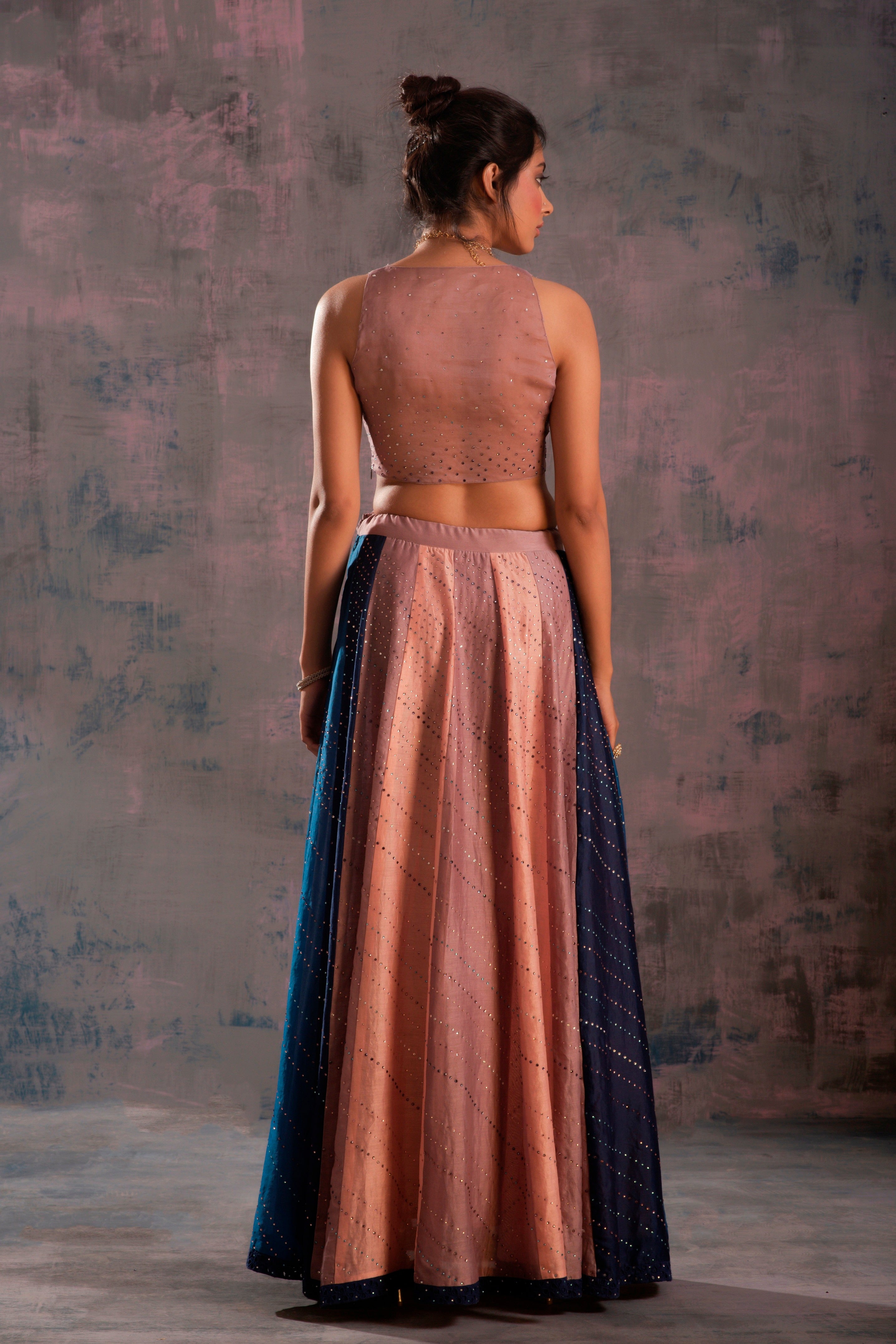 Leave everyone in awe like a beautiful sunset that brings out the shimmer in Chanderi Lehenga with contrast panels & a sheer organza upper. This beautiful Lehenga is studded with swarovski throughout. A Midnight Blue cutwork running at the bottom border, & organza dupatta embellished with swarovski.