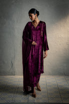 An elegant velvet suit adorned with circular embroidery along the front and back yoke, tracing the armhole in a jacket-style silhouette. It is paired with loose, embroidered palazzo pants that add graceful movement. Available in two rich colour options, one complemented by an embroidered velvet stole, and the other by an organza dupatta finished with a velvet border for a delicate flowy drape.