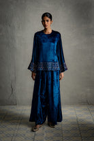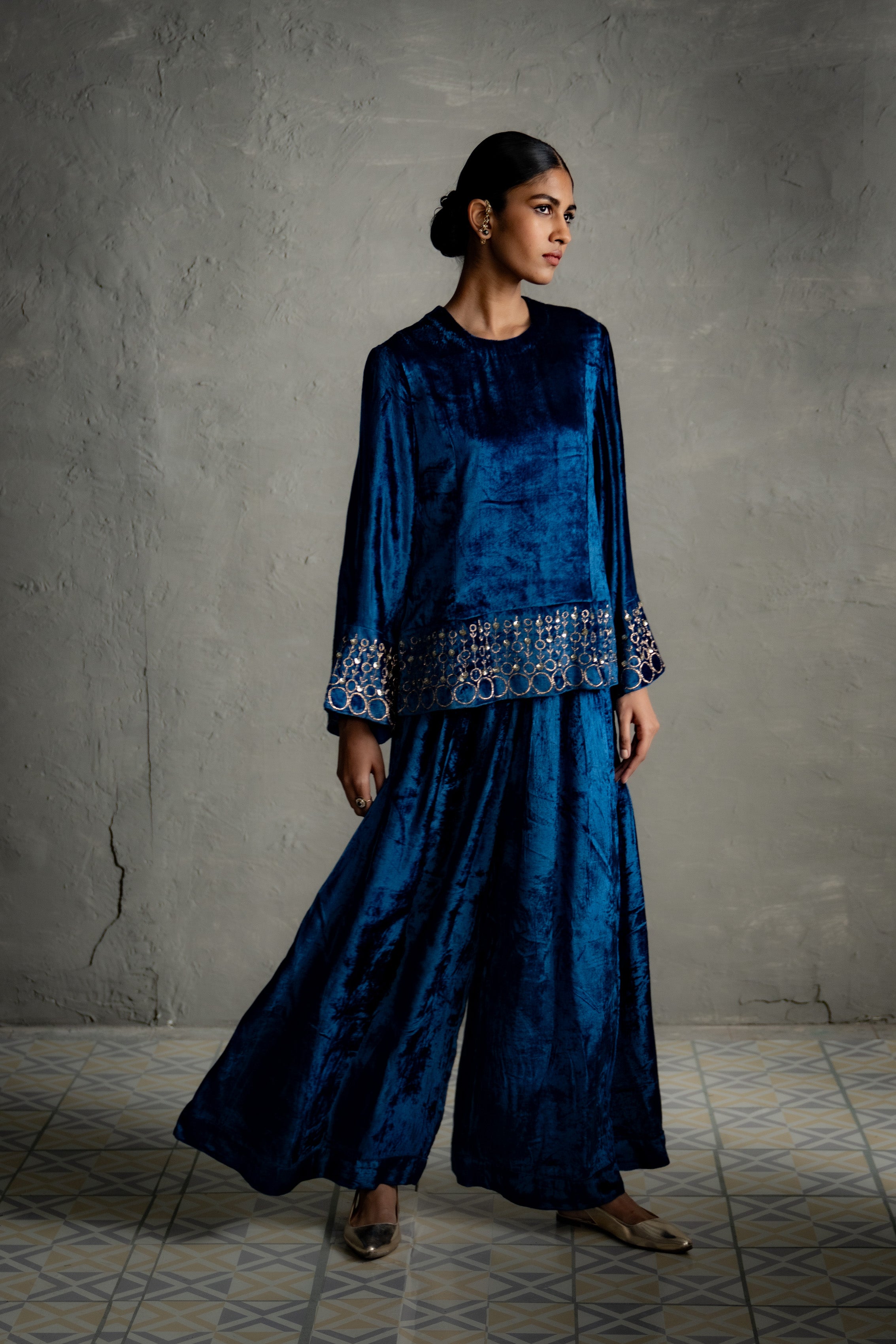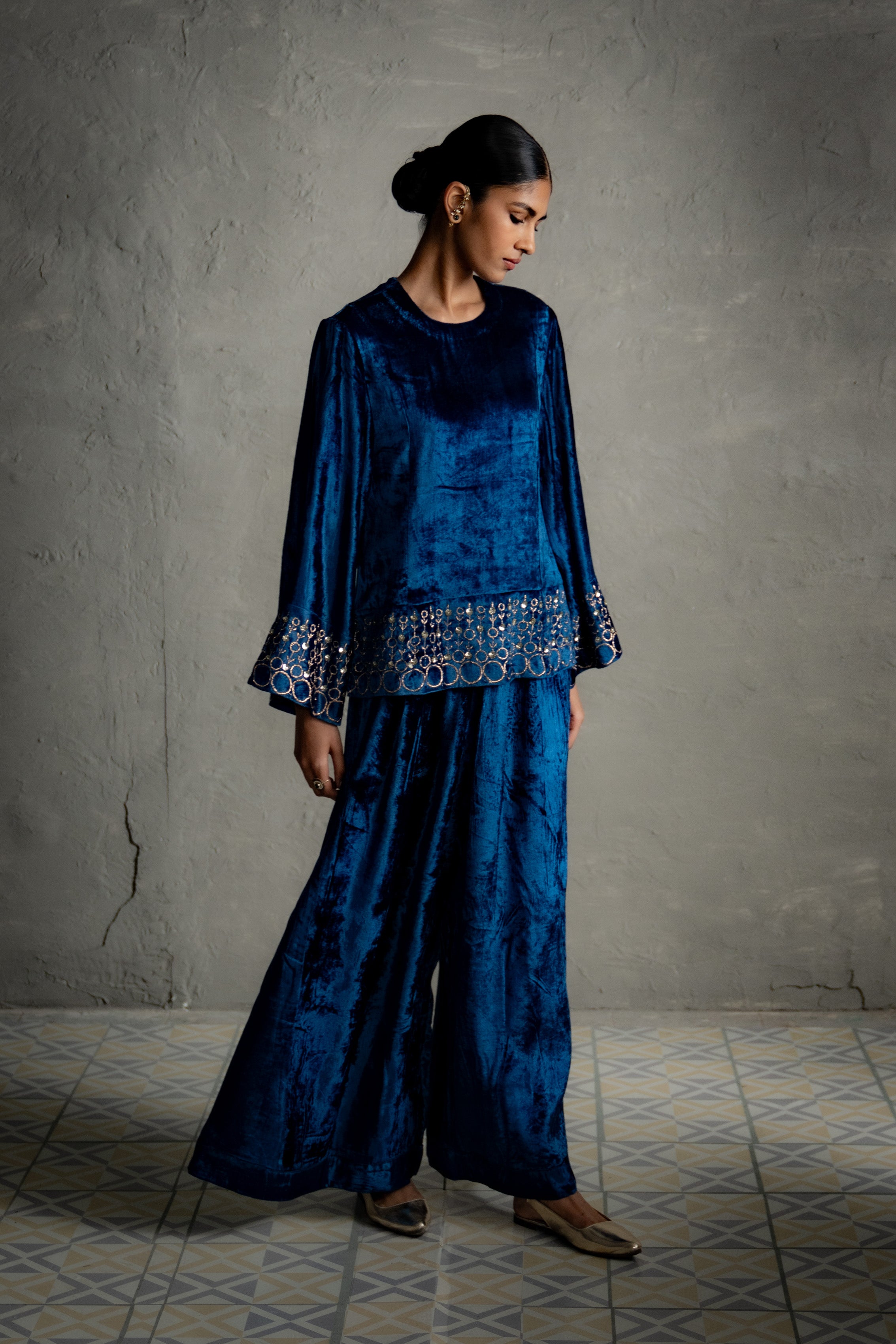 A contemporary two-piece cord set featuring a heavily embroidered top with detailed hem and sleeve cuffs, flared long sleeves, and paired with flared, ankle-length palazzos. Designed for modern formal occasions, this ensemble balances intricate craftsmanship with a sleek, contemporary silhouette.