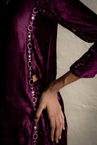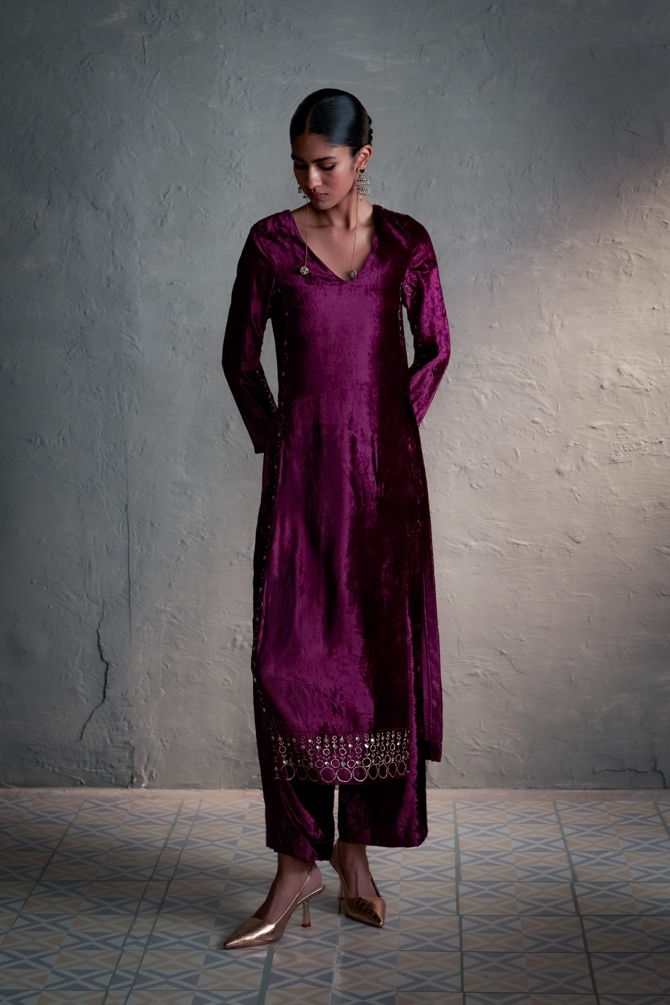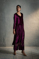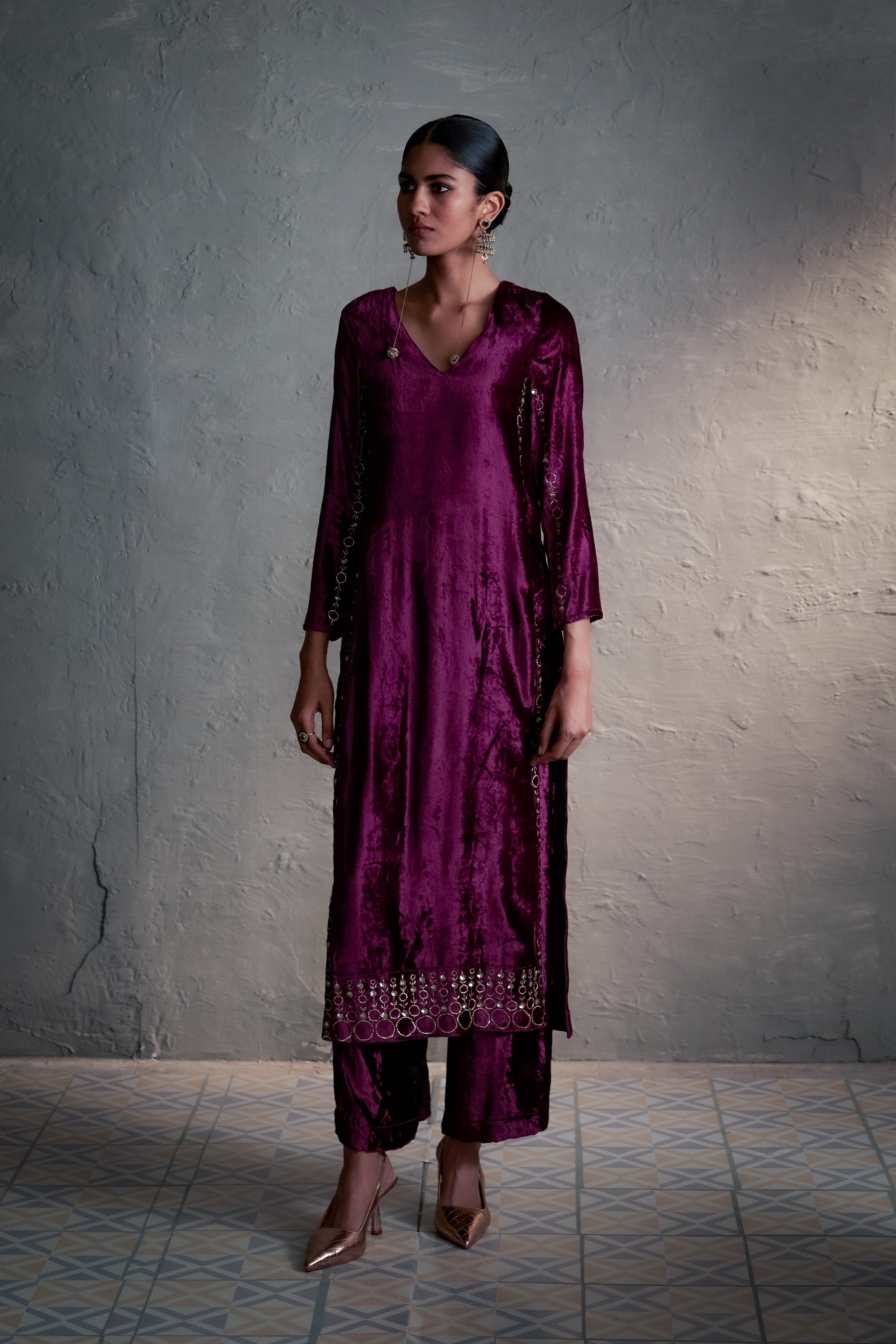 A velvet kurta set in a straight-fit silhouette, featuring an intriguing side-slit detail, a sleek side band on the bodice, and a back tie-up for a structured yet graceful look. Intricate embroidery adorns the long slits, sleeves, and the front hem, paired with loose palazzos for effortless ease. Available in two rich colour options, one styled with an embroidered velvet stole, and the other with an organza dupatta edged in velvet for a soft, flowing drape.