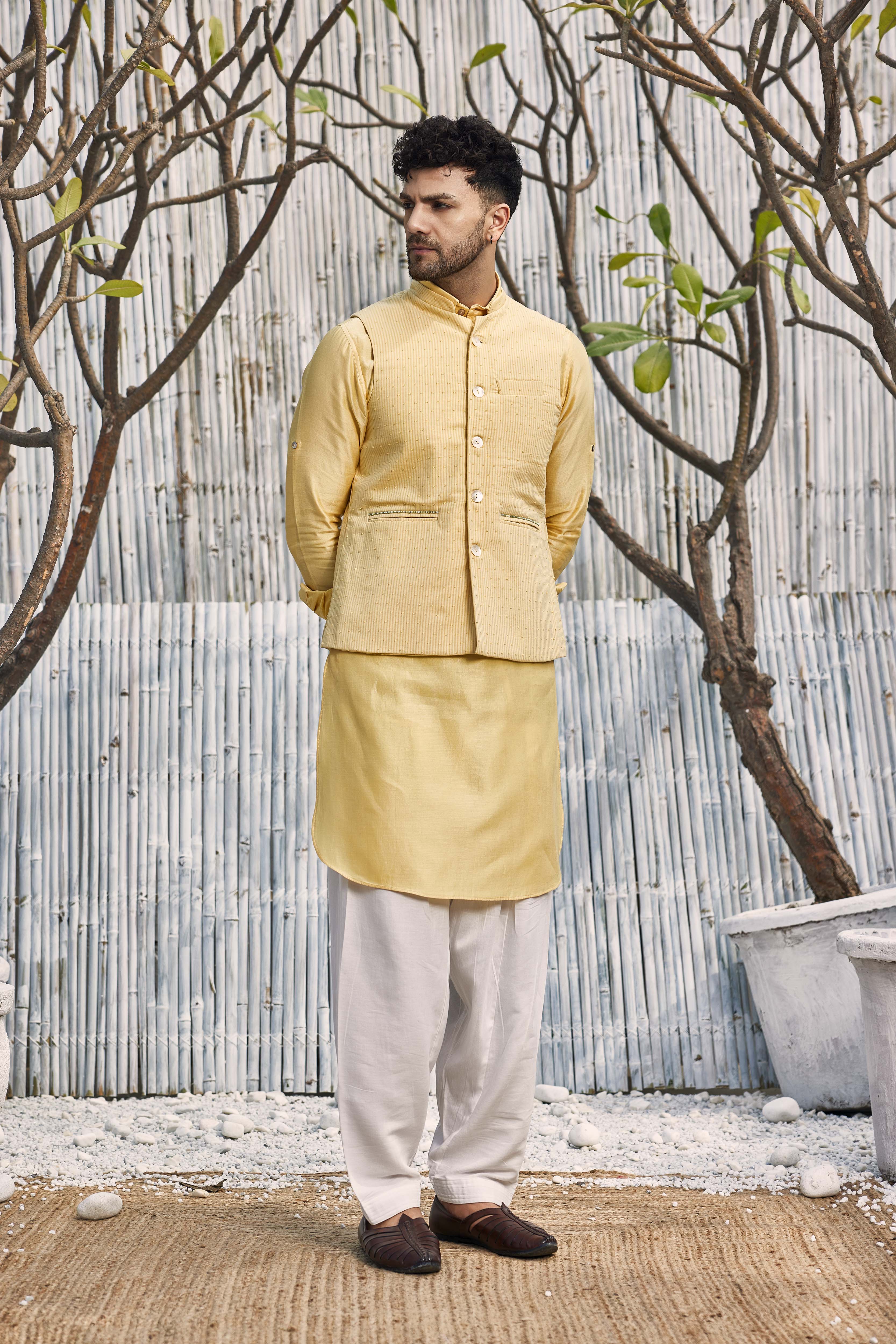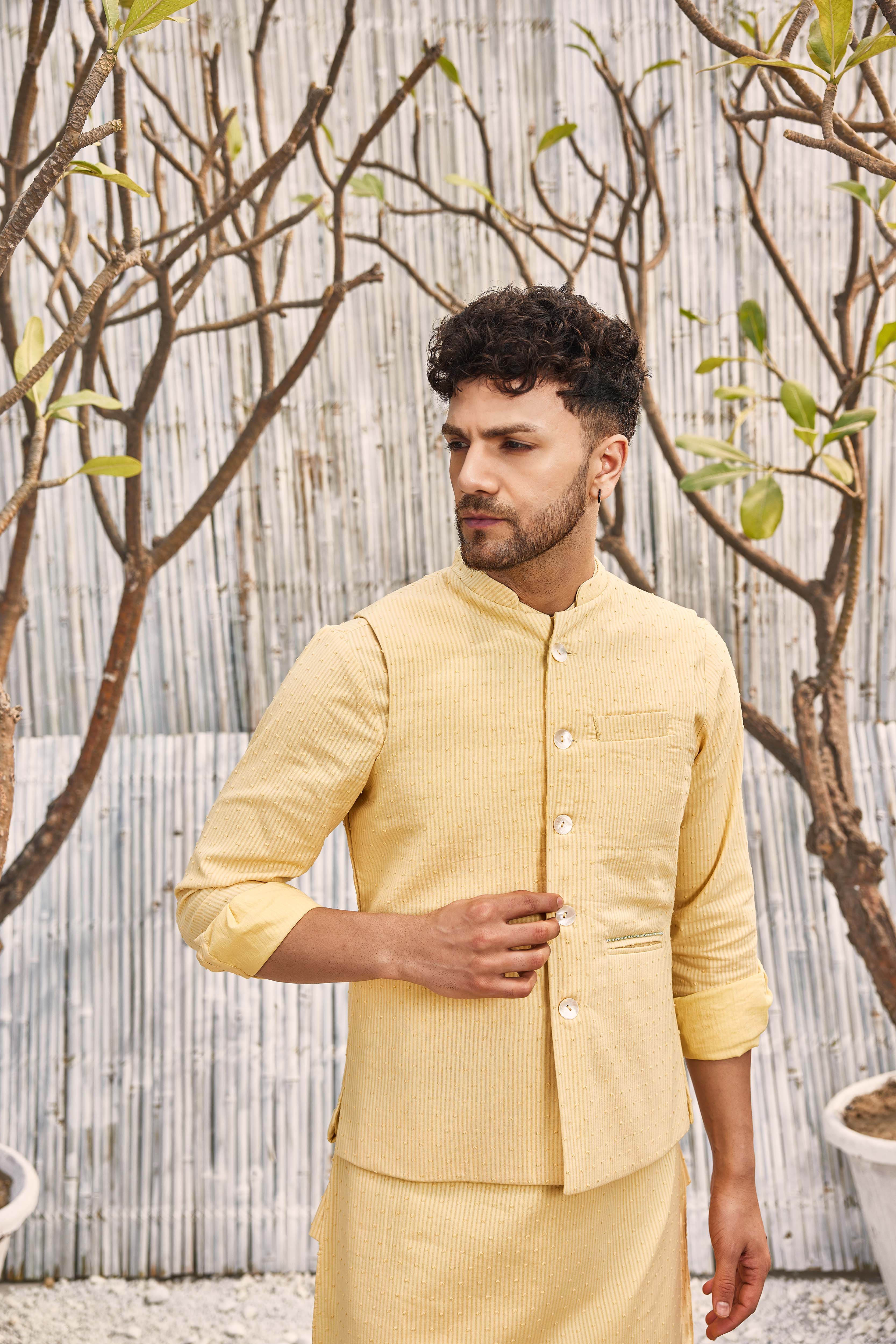 Bundi jacket in yellow cotton dobby can transform any outfit into occasion wear. This jacket has an intricate dash of bead work over the pockets.