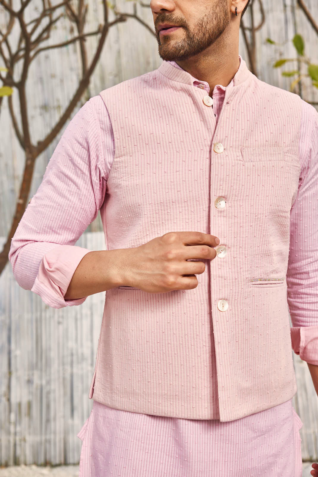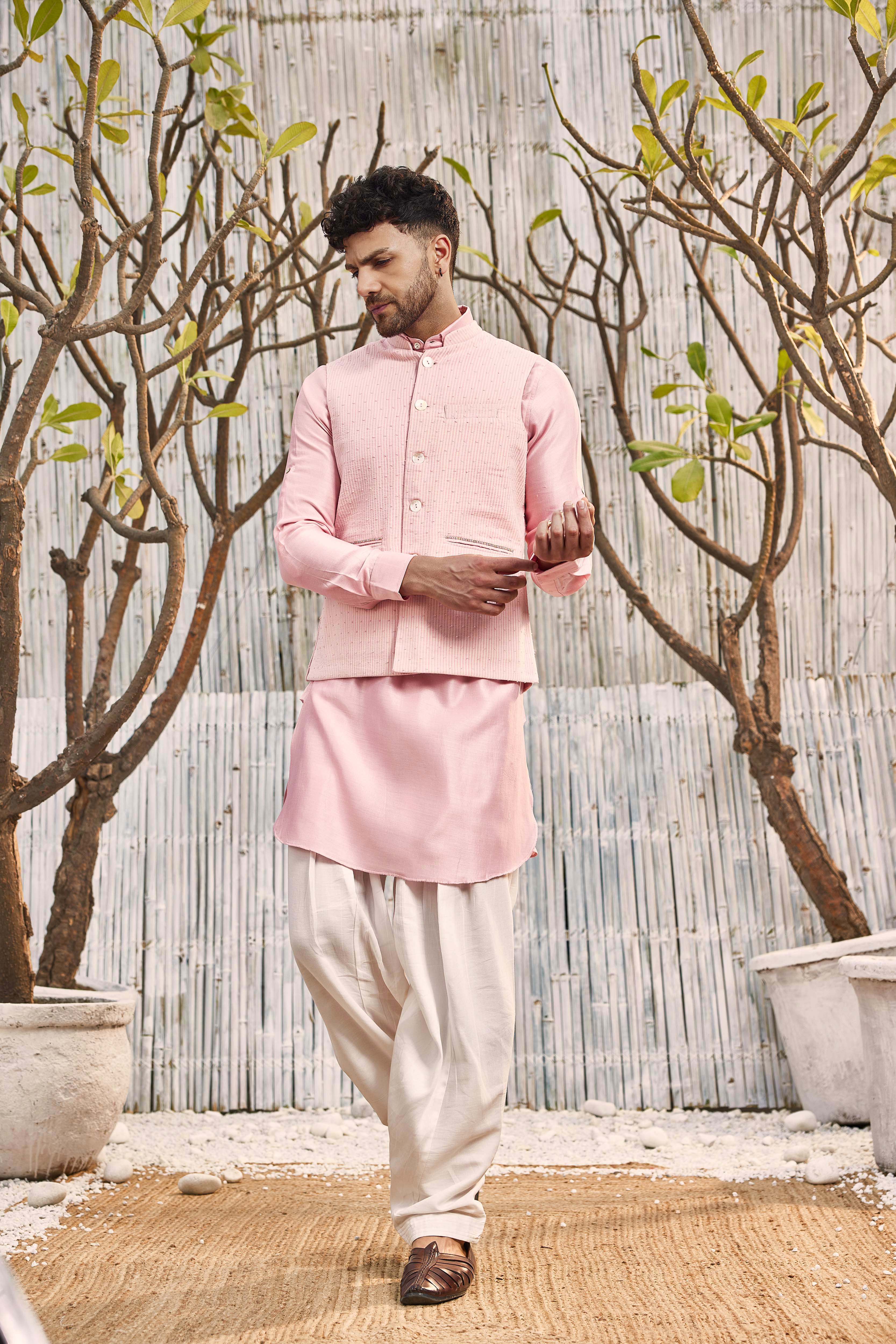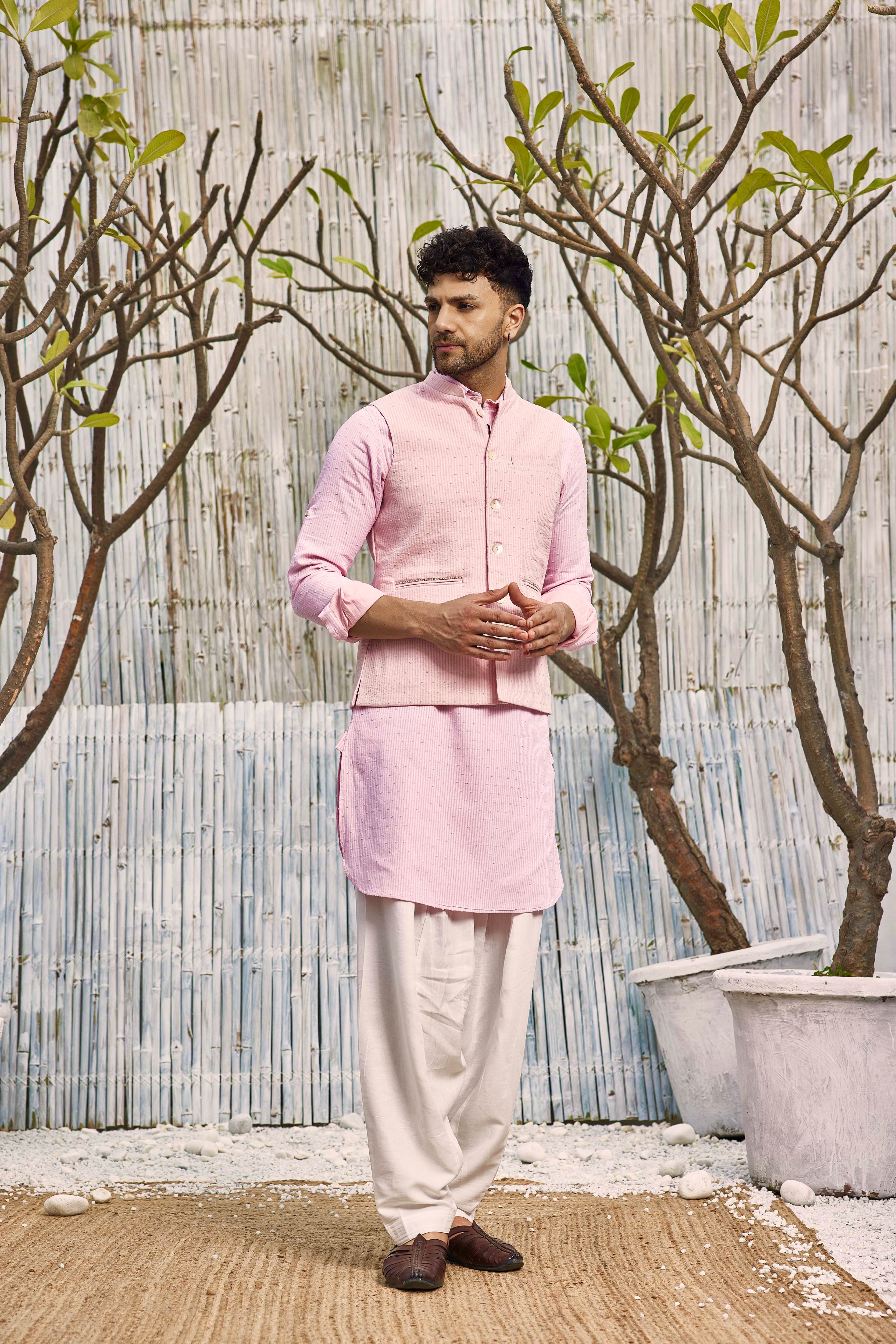 Bundi jacket in pink cotton dobby can transform any outfit into occasion wear. This jacket has an intricate dash of bead work over the pockets.