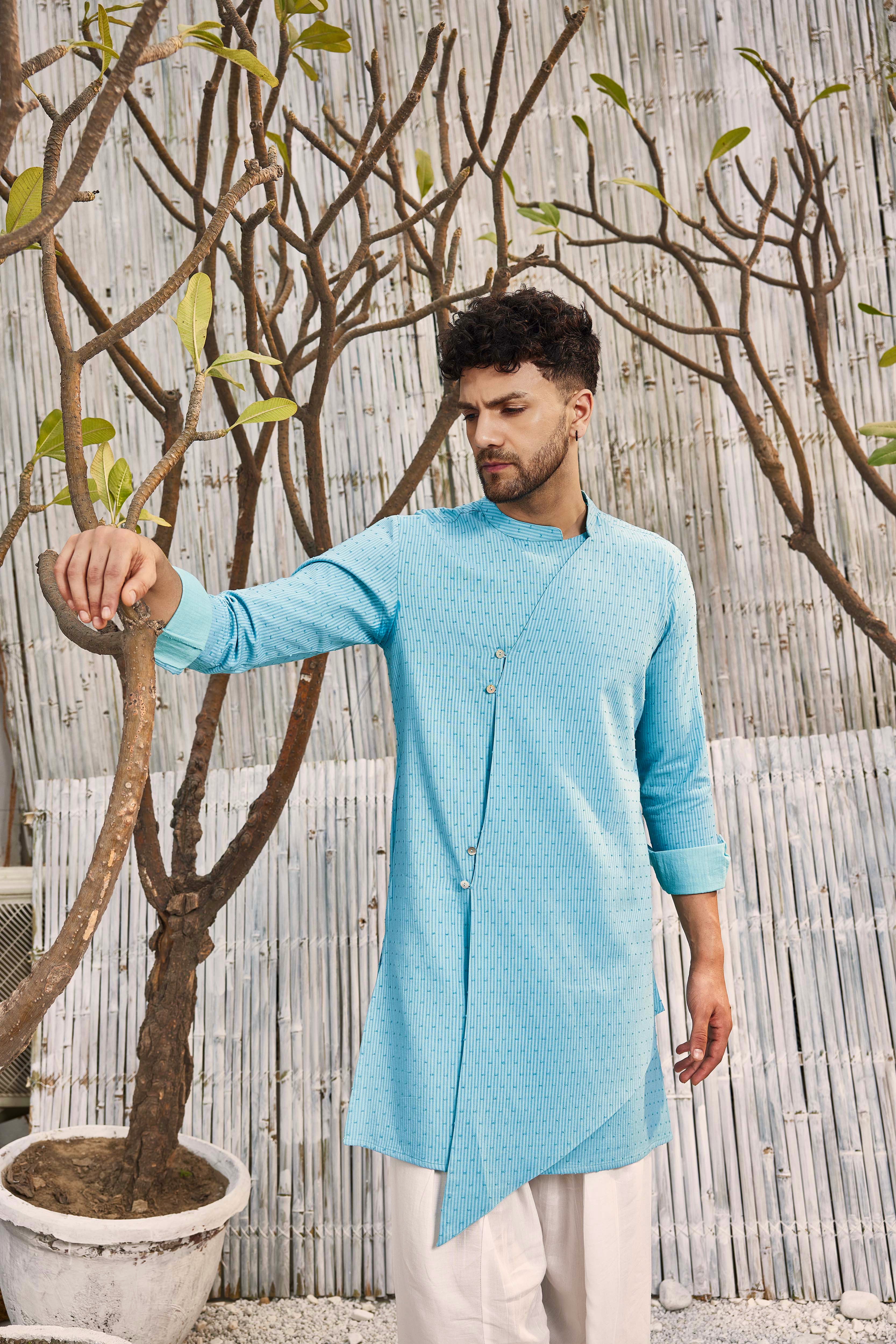 Blue textured cotton diagonal short kurta with overlapping front panels paired with cotton Salwar. The kurta features, foldable sleeve & side pockets.