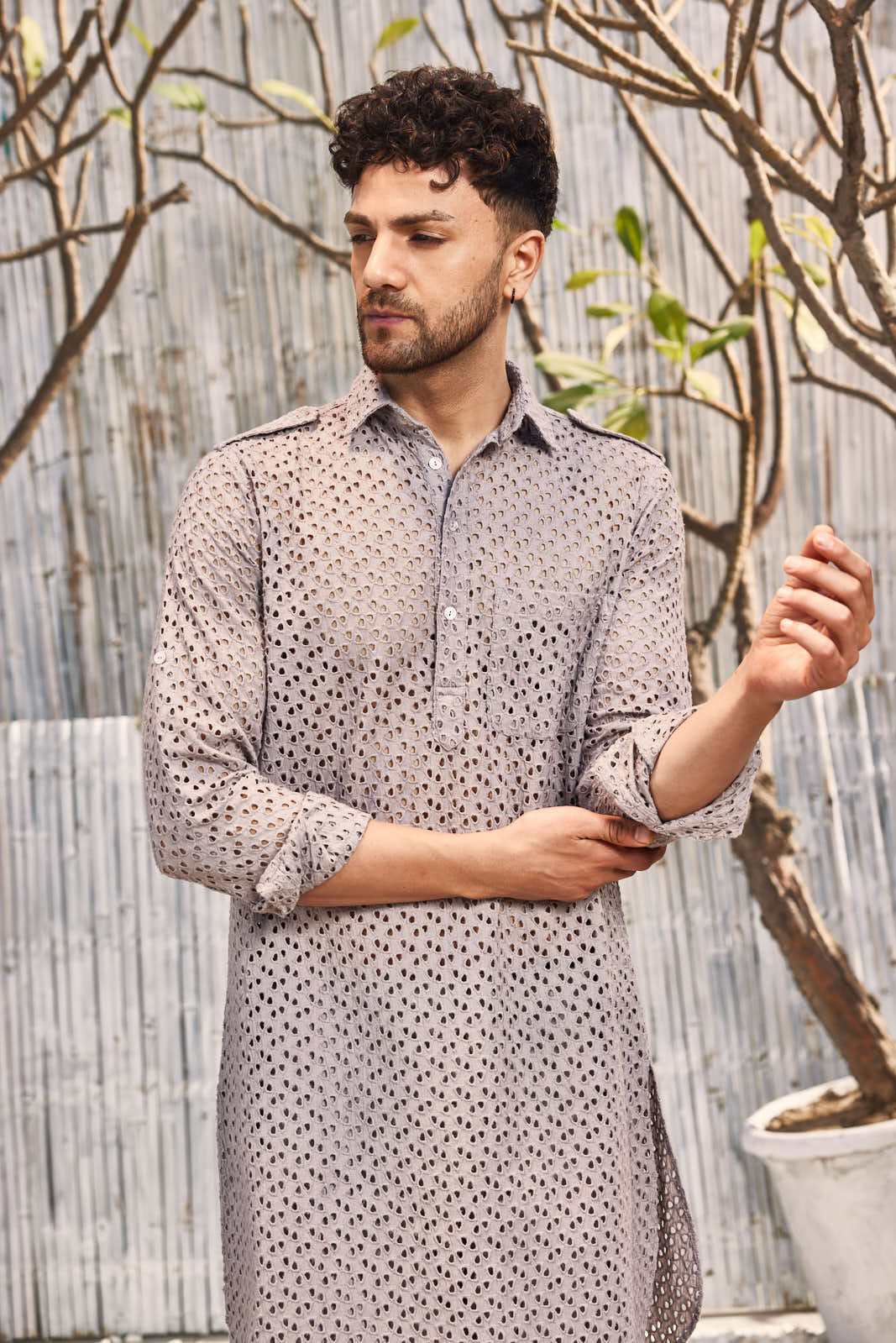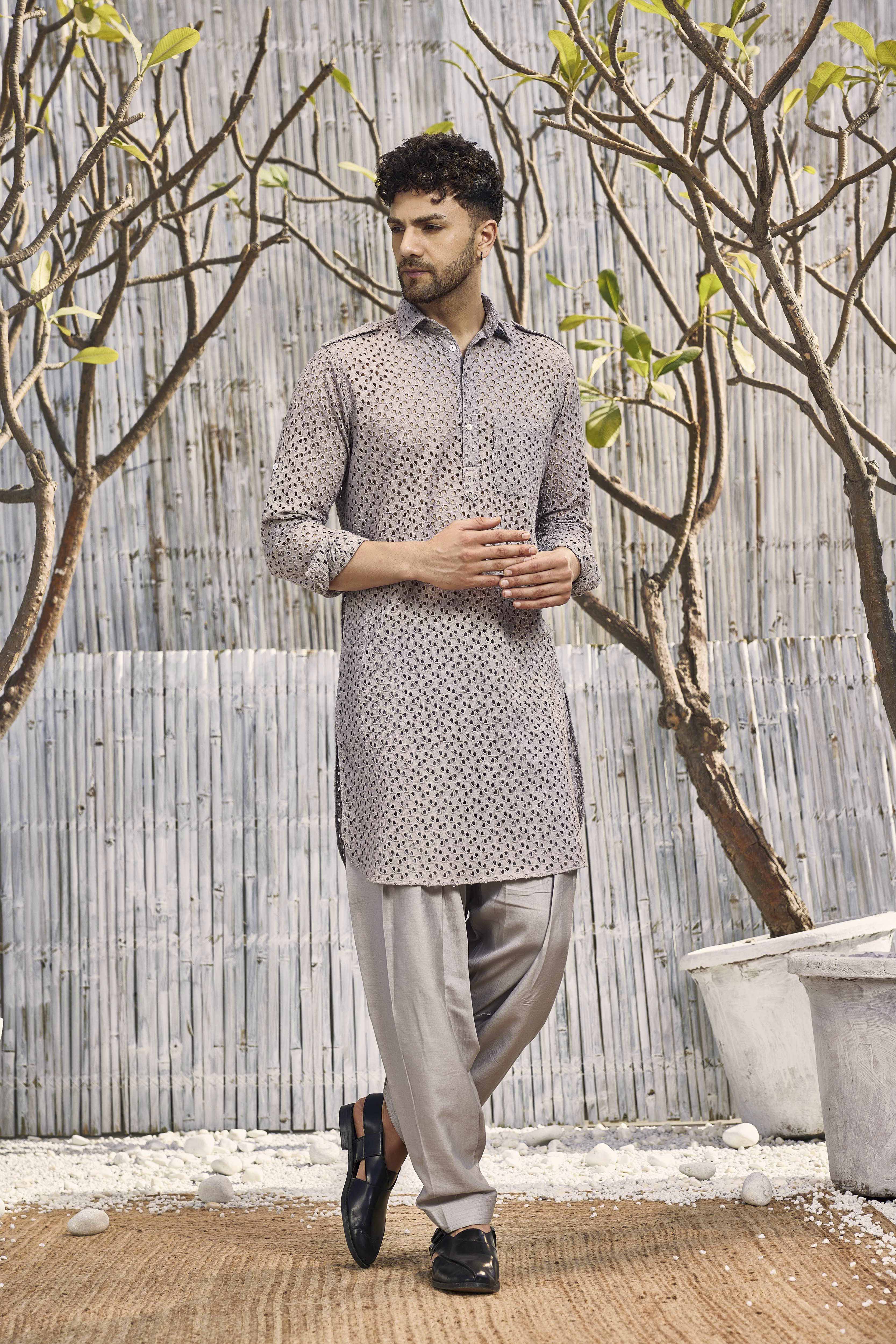 Our classic pathani in a steel grey schiffli fabric is the perfect occasion wear. This kurta features, classic shirt collar, foldable sleeve, side pockets & a round shape bottom. Kurta is paired with same colour salwar.