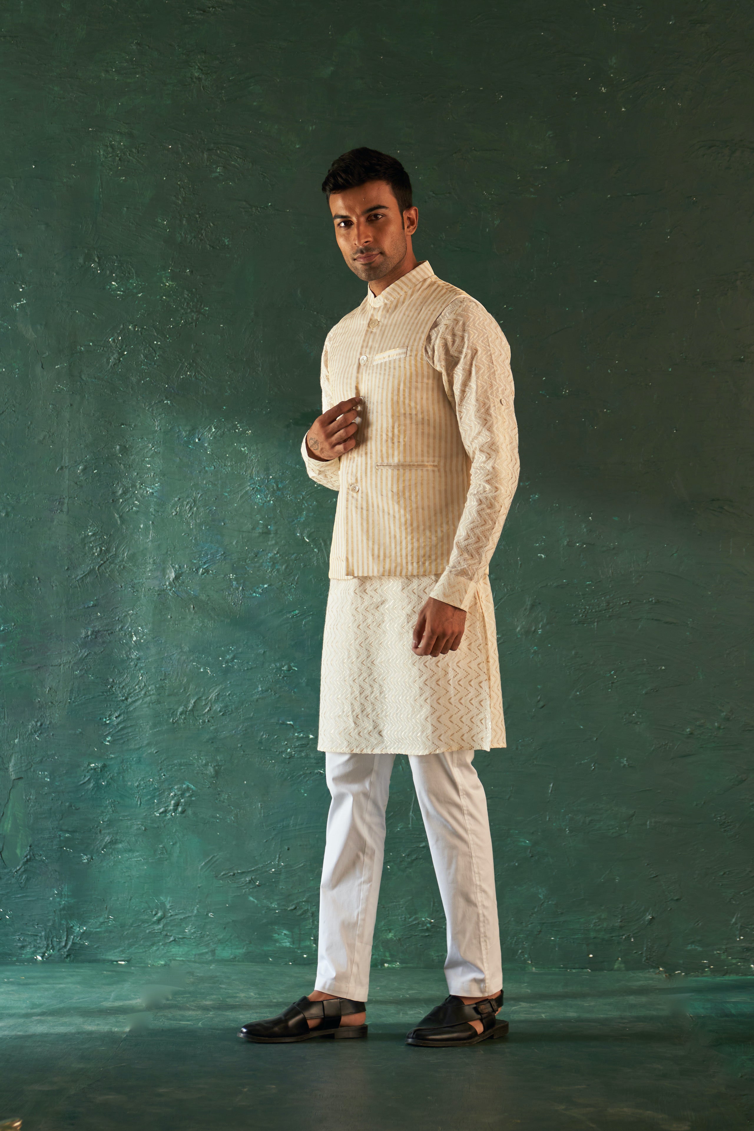 Our classic straight kurta in white chevron cotton is the perfect occasion wear. The kurta crafted in beautiful threadwork all over. It is paired with cotton pants and a white stripe tissue nehru jacket to make it look more edgy. The stylish and modern design ensures you look your best on your special events. Impress your guests with this set of three and let the timeless design become a conversation starter.