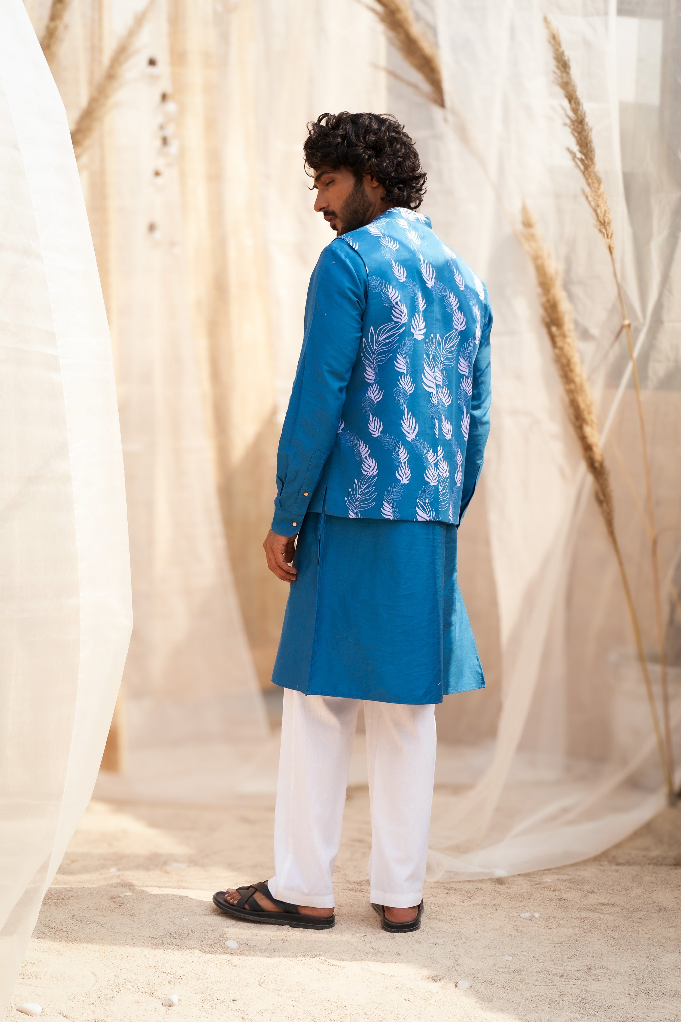 Redefine elegance with this plain ocean blue solid kurta set, enhanced by a leaf-printed jacket that adds a striking layer of sophistication. The kurta’s minimalist design exudes timeless charm, while the printed jacket elevates the ensemble with a modern and stylish touch. Paired with straight pants, this set offers both comfort and versatility.