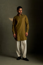 This men’s Pathani kurta is designed in a relaxed silhouette, featuring subtle star motif and glass crescent moon embroidery on the placket and sleeve cuffs.The same detailing appears on the inner sleeve loops for a refined touch. Paired with a classic salwar, it offers a festive look that is both traditional and distinctive.