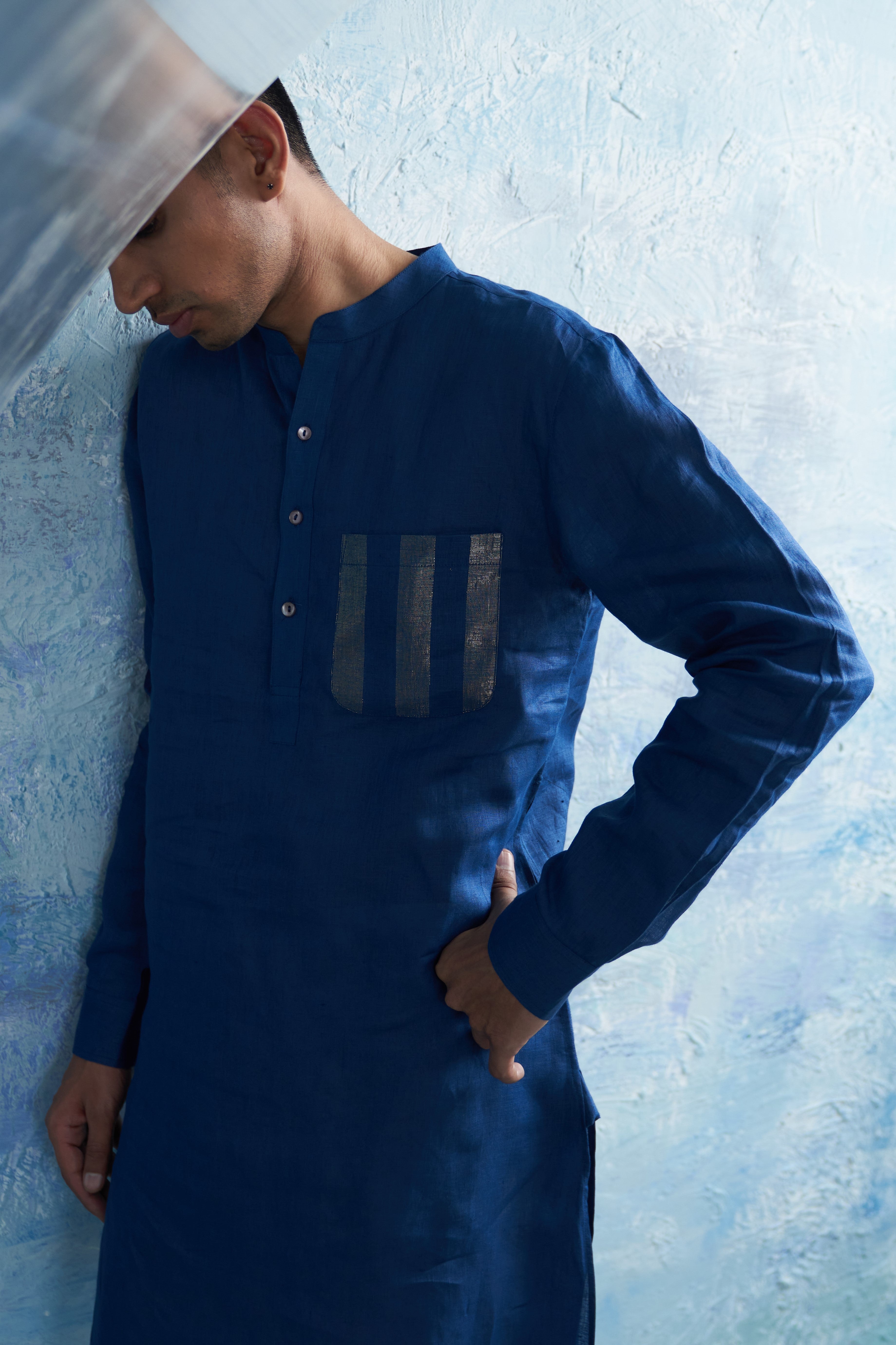 Our classic straight kurta in a standout royal blue linen, a remarkable addition to our Aura collection. This exquisite kurta features subtle hints of shimmer on the pocket, enhancing its timeless appeal with a touch of sophistication. Styled with a cotton satin salwar for a traditional aesthetic, or paired with classic straight pants for versatility, this ensemble offers endless possibilities.