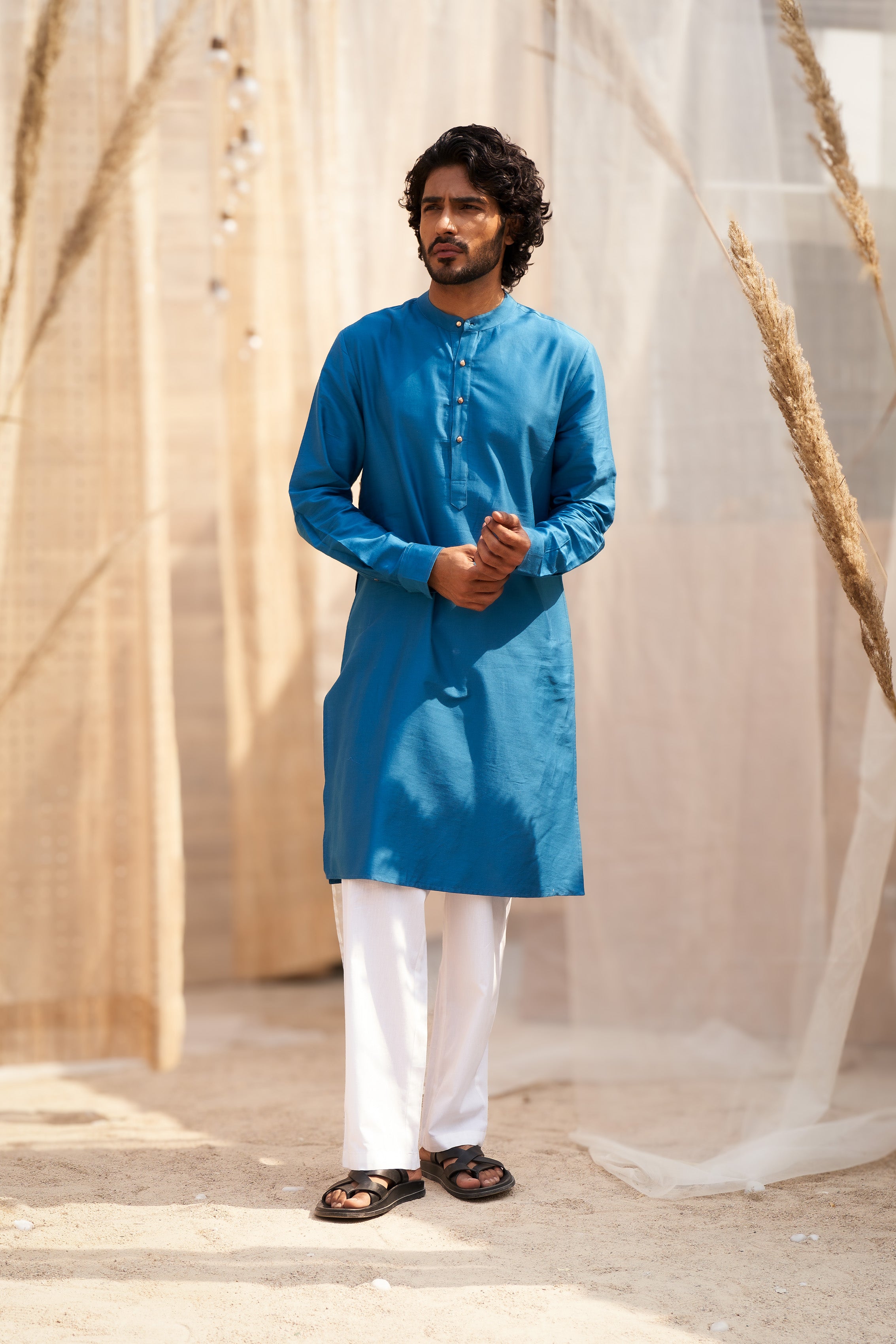 Elevate your wardrobe with this solid ocean blue kurta set, designed for a timeless and elegant look. The kurta features a minimalist design that exudes sophistication, paired with straight pants for unmatched comfort and ease.