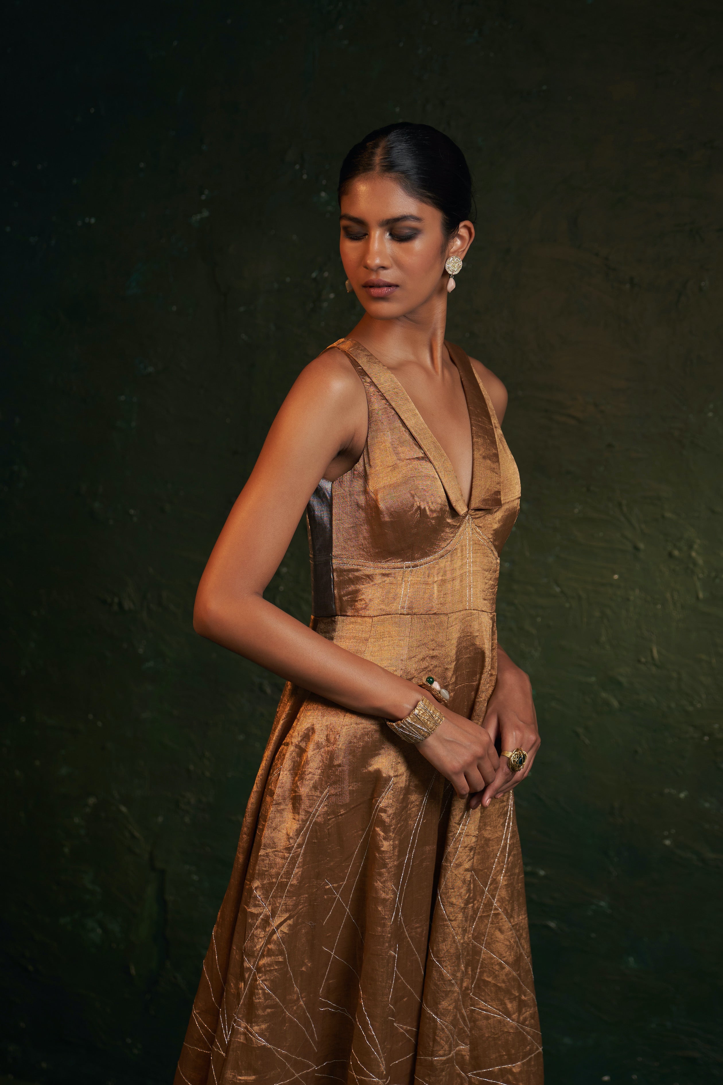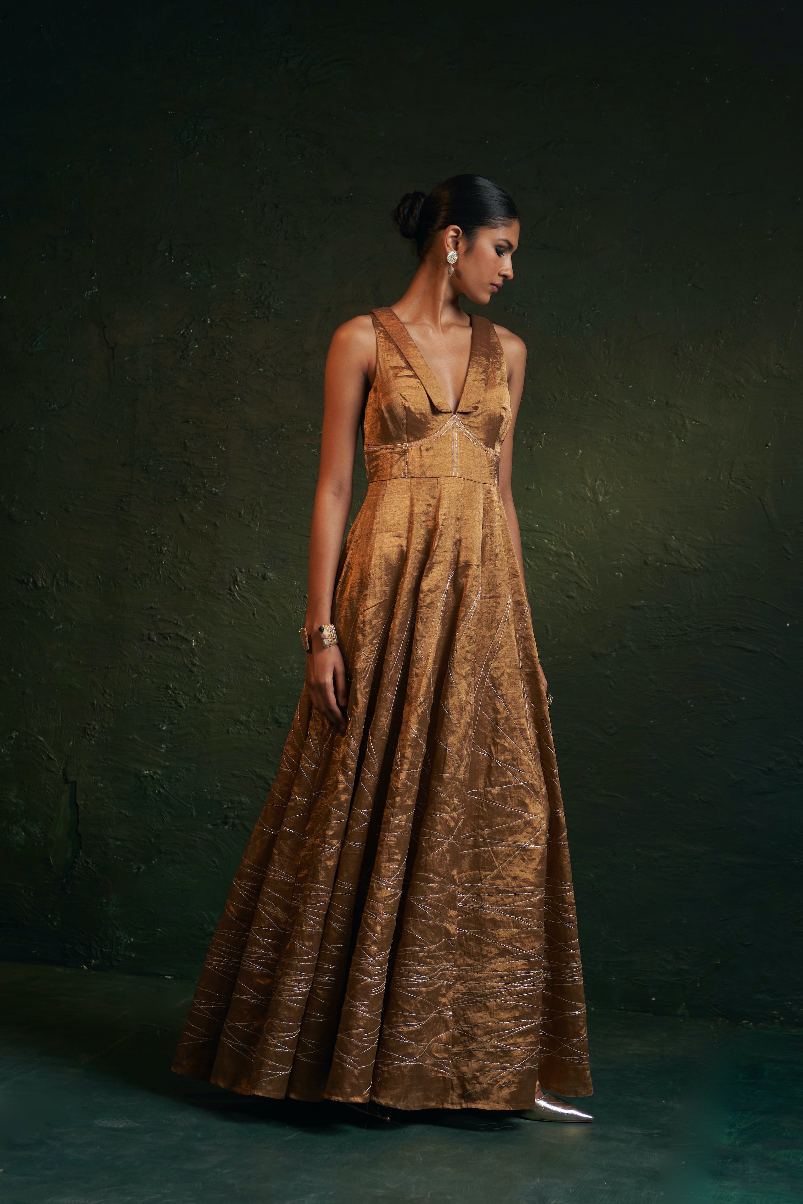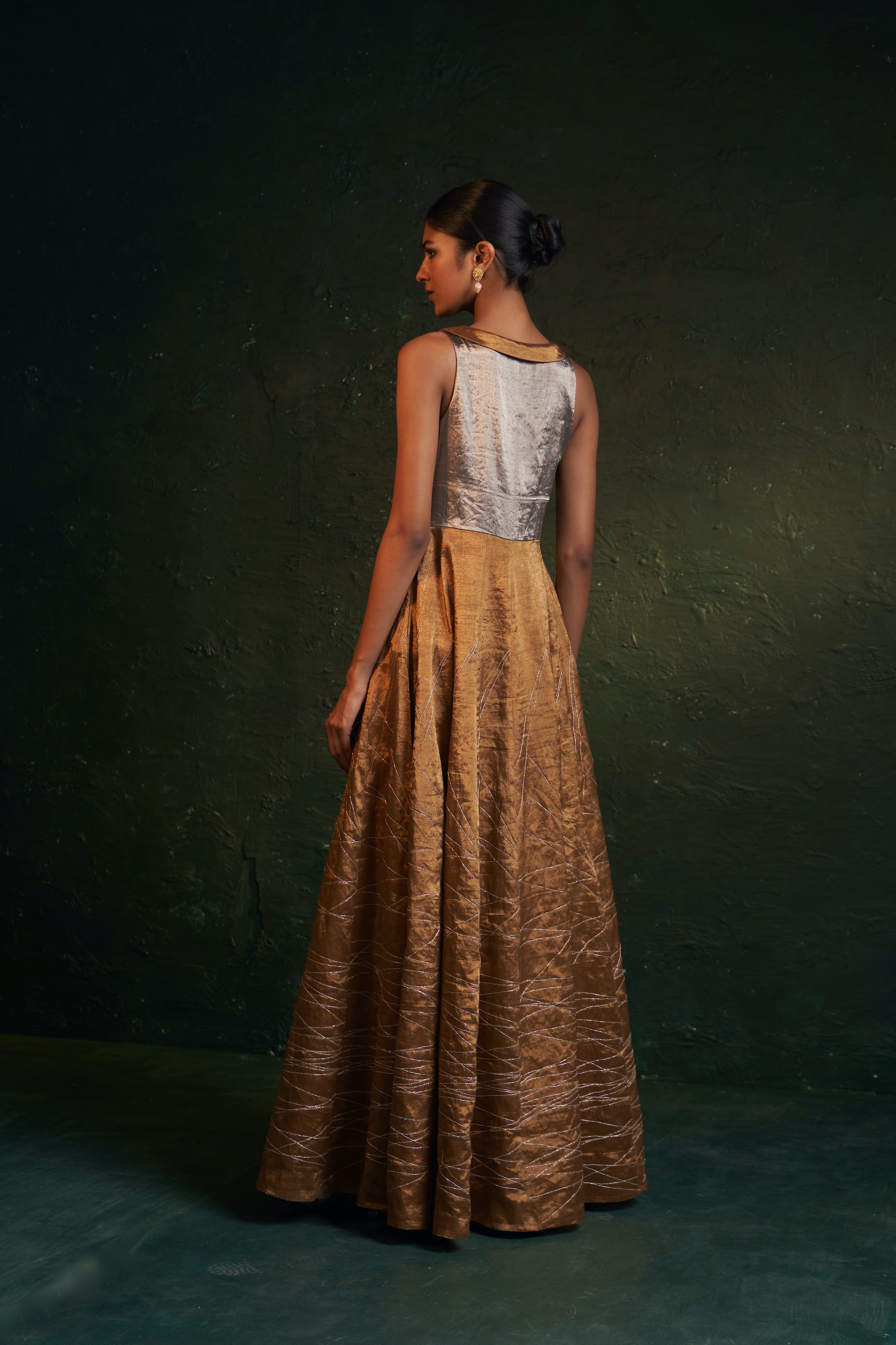 Ready for Spotlight- Gold Tissue Flared, embroidered with intertwining dori work on skirt all around with contrasting back bodice Anarkali Dress. This dress with a corset bodice look is a modern age contemporary silhouette that makes you stand out and look glam.