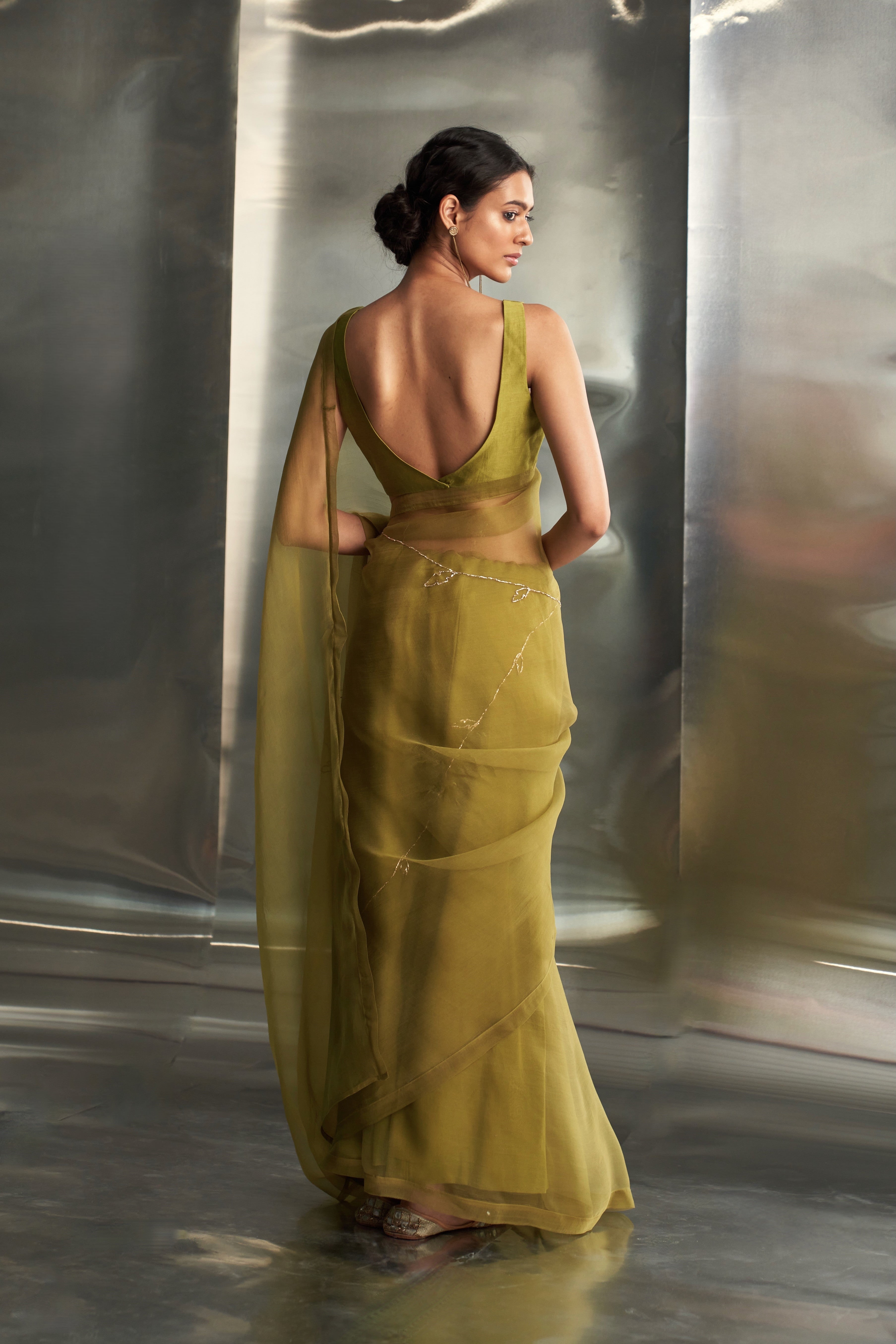 This rich and vibrant saree, crafted in a stunning berry green hue from pure organza fabric, showcases intricate golden nakshi hand embroidery inspired by graceful leaf motifs. Paired with a deep-neck, sleeveless Chanderi blouse (padded) that adds a touch of glamour, this ensemble embodies timeless elegance.