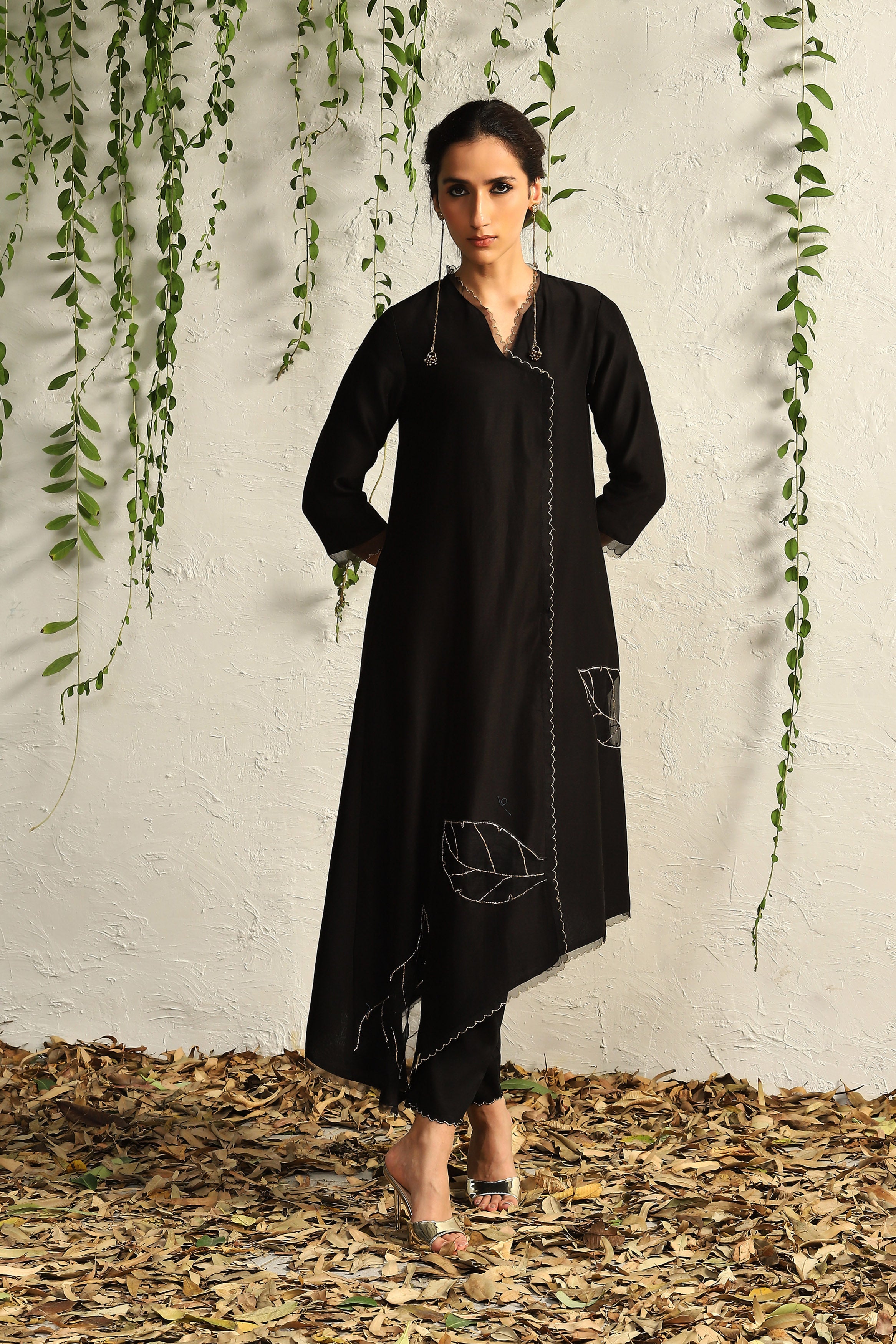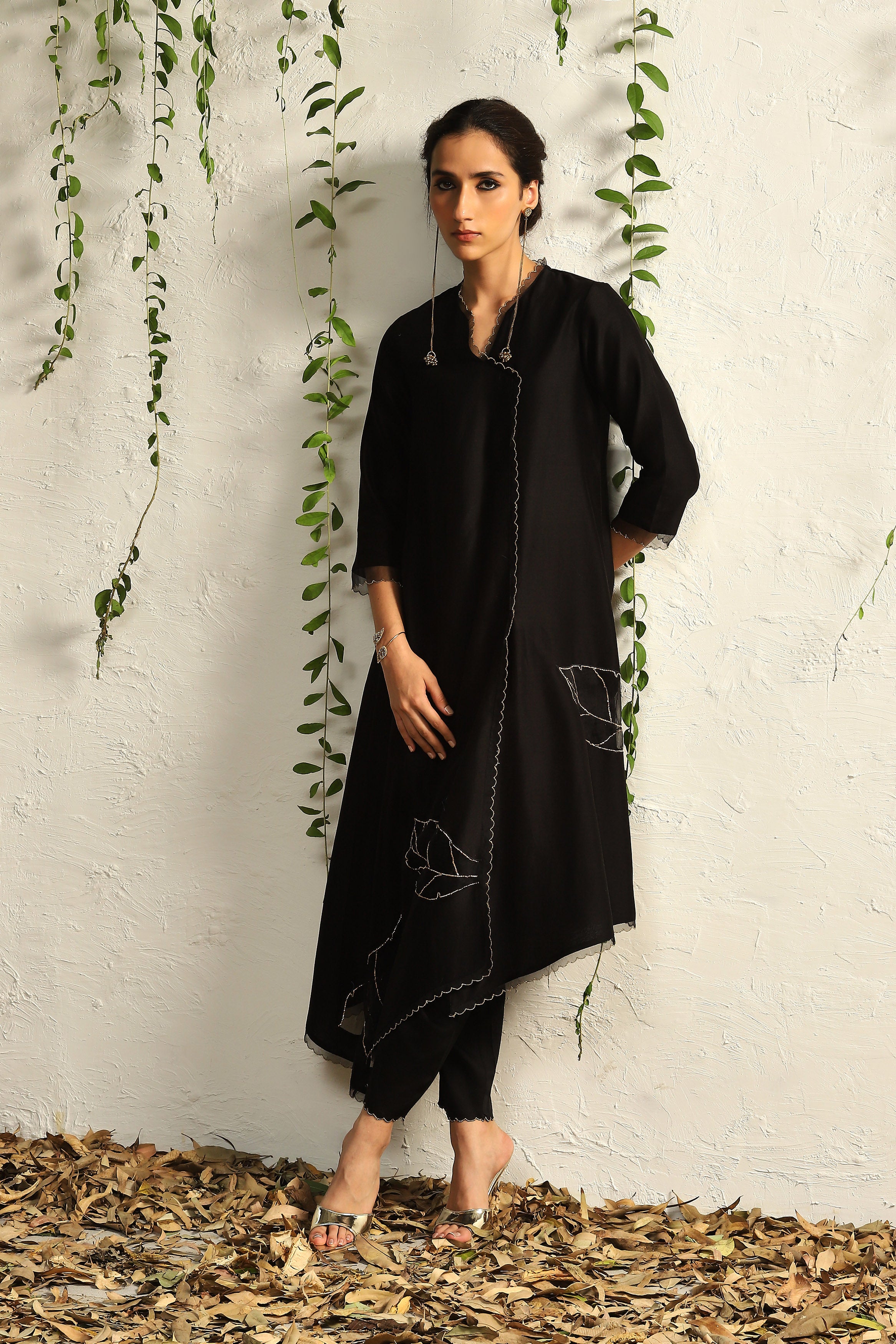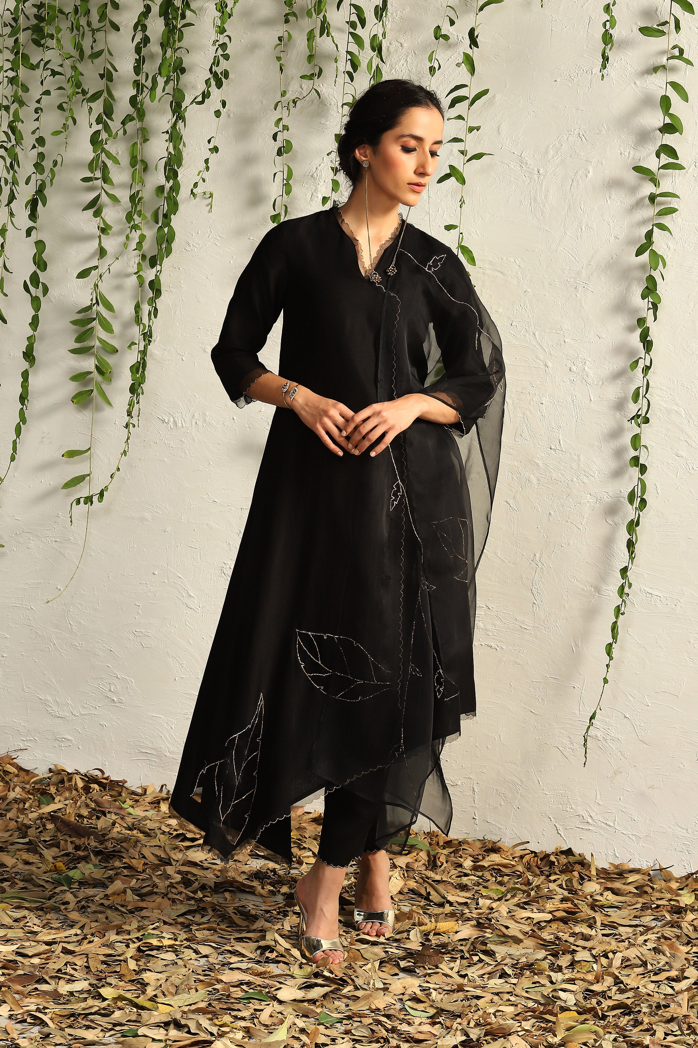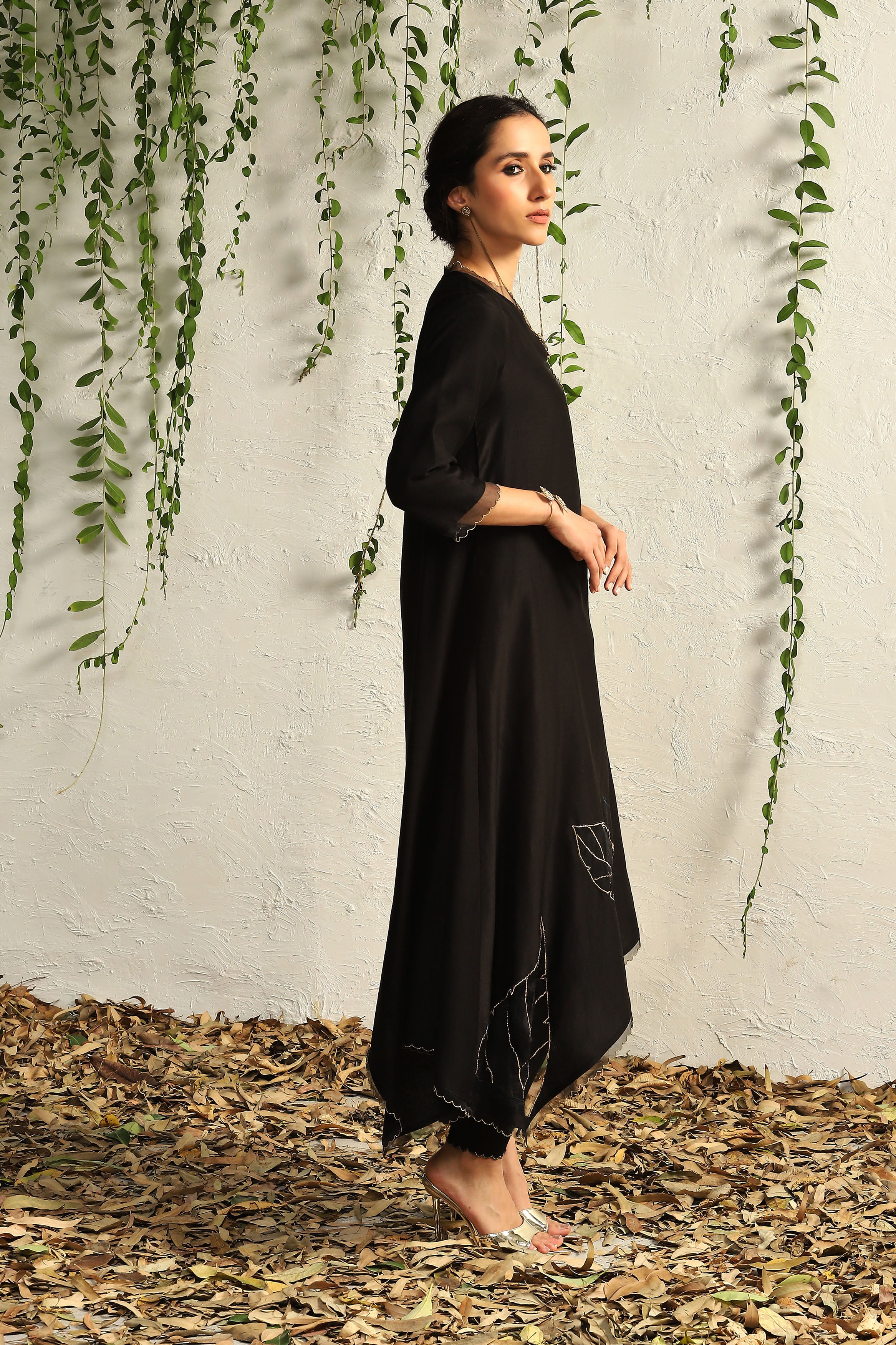 Embrace its contemporary and edgy silhouette, featuring feather-touch pure organza patchwork adorned with intricate golden nakshi hand embroidery and a delicate scalloped border throughout. This exquisite black chanderi kurta set is destined to become one of your most prized possessions.