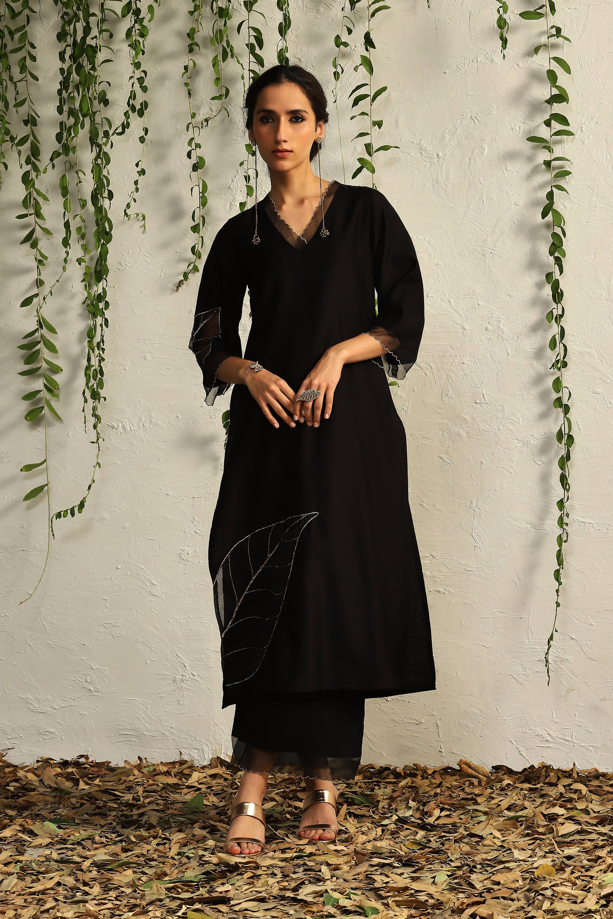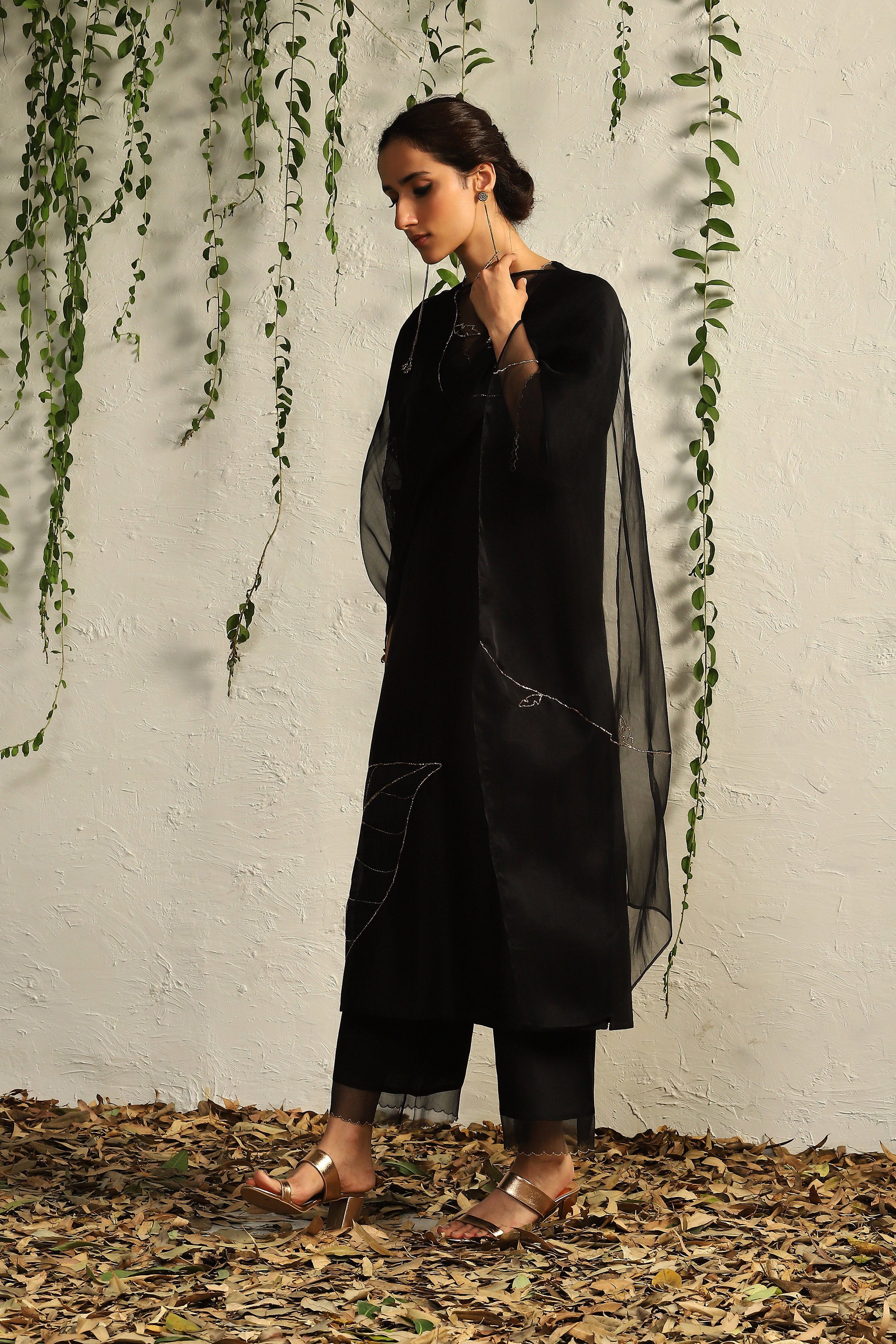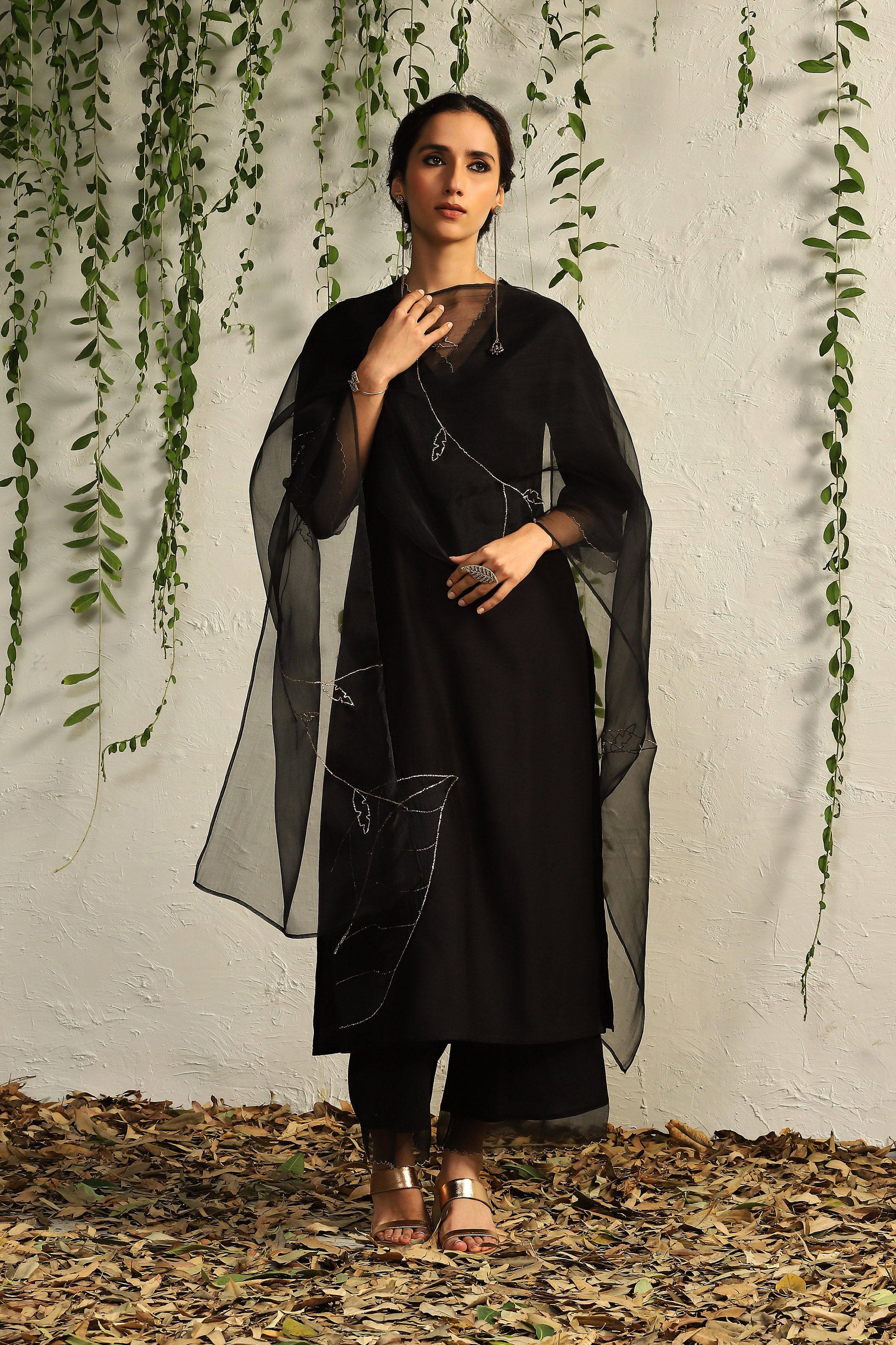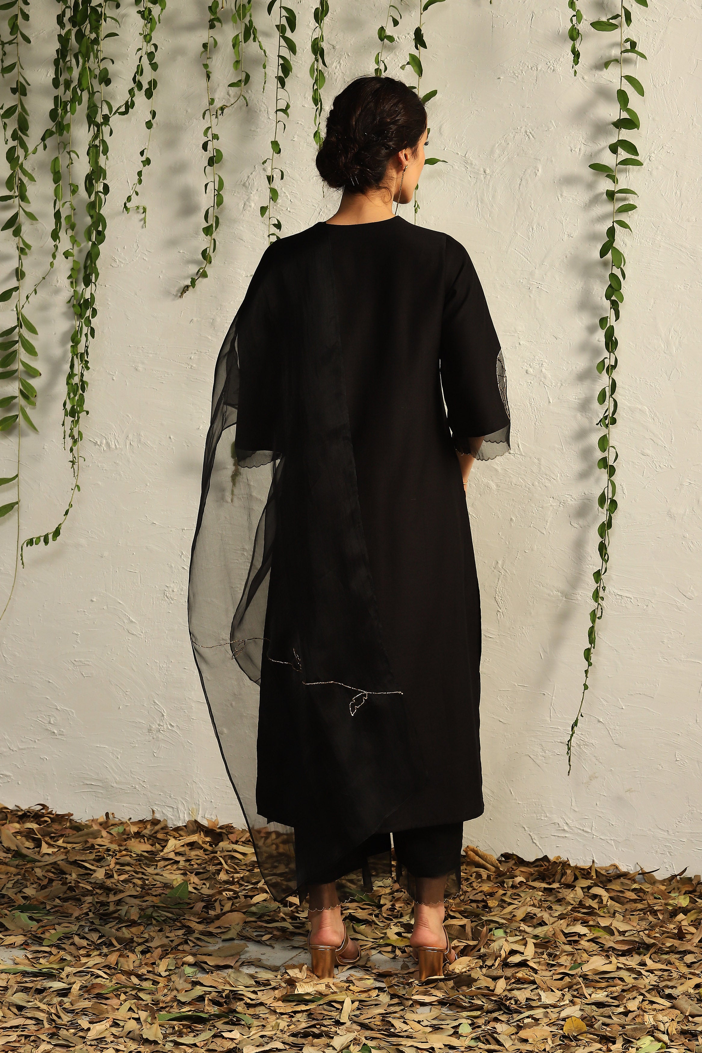 This black kurta set in a straight silhouette with side slits and beautiful scalloped neckline is elegant and enchanting. Designed with intricate nakshi and zari gold hand embroidery which shines on the black colour, this contemporary ensemble is ideal for your festive celebrations.