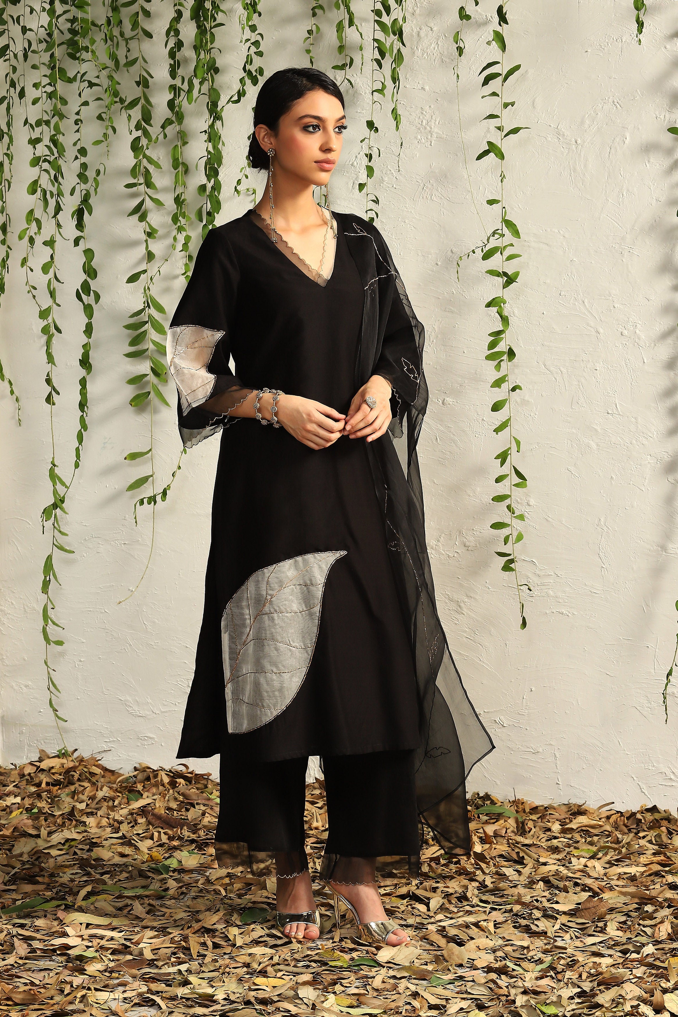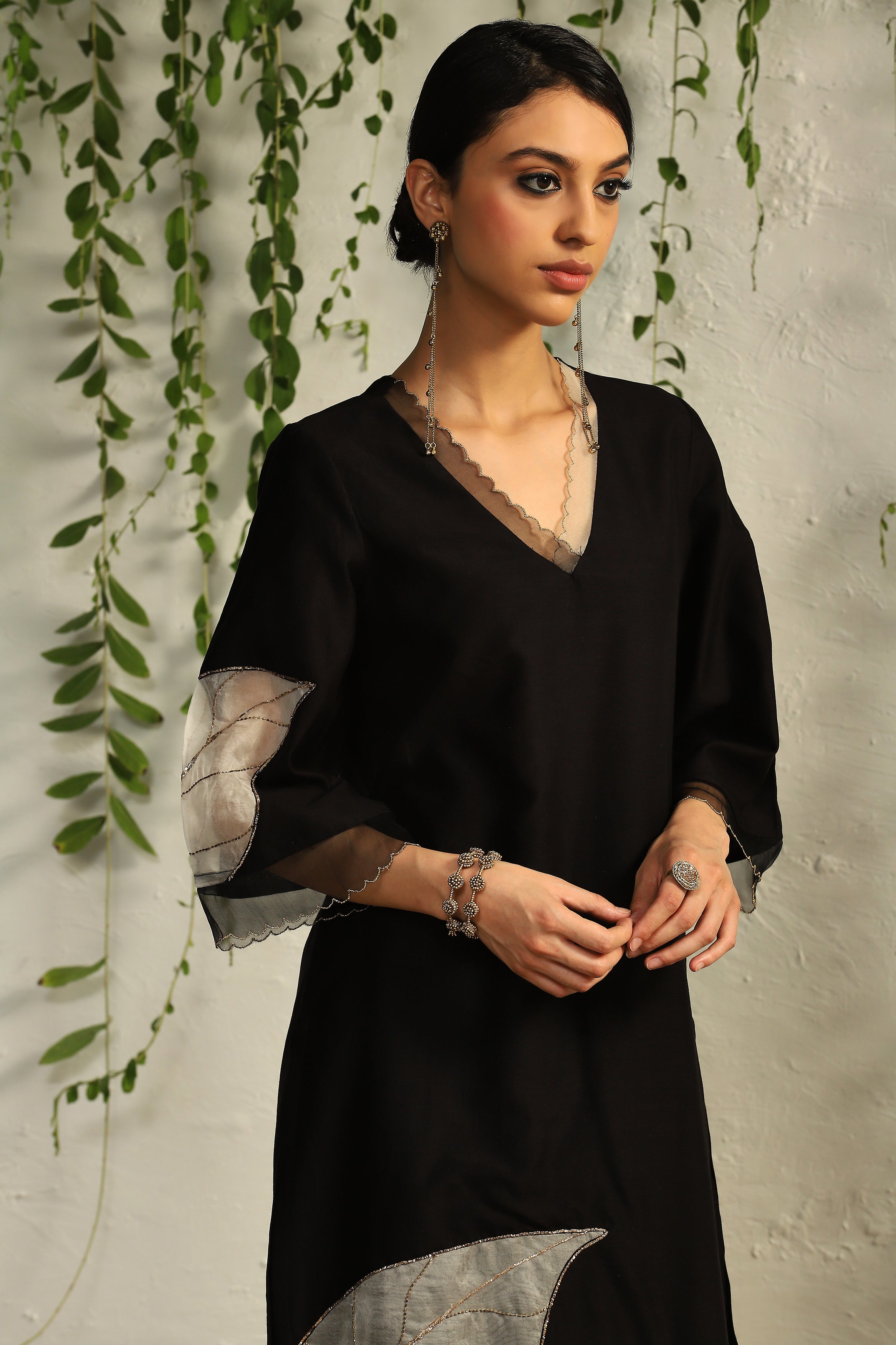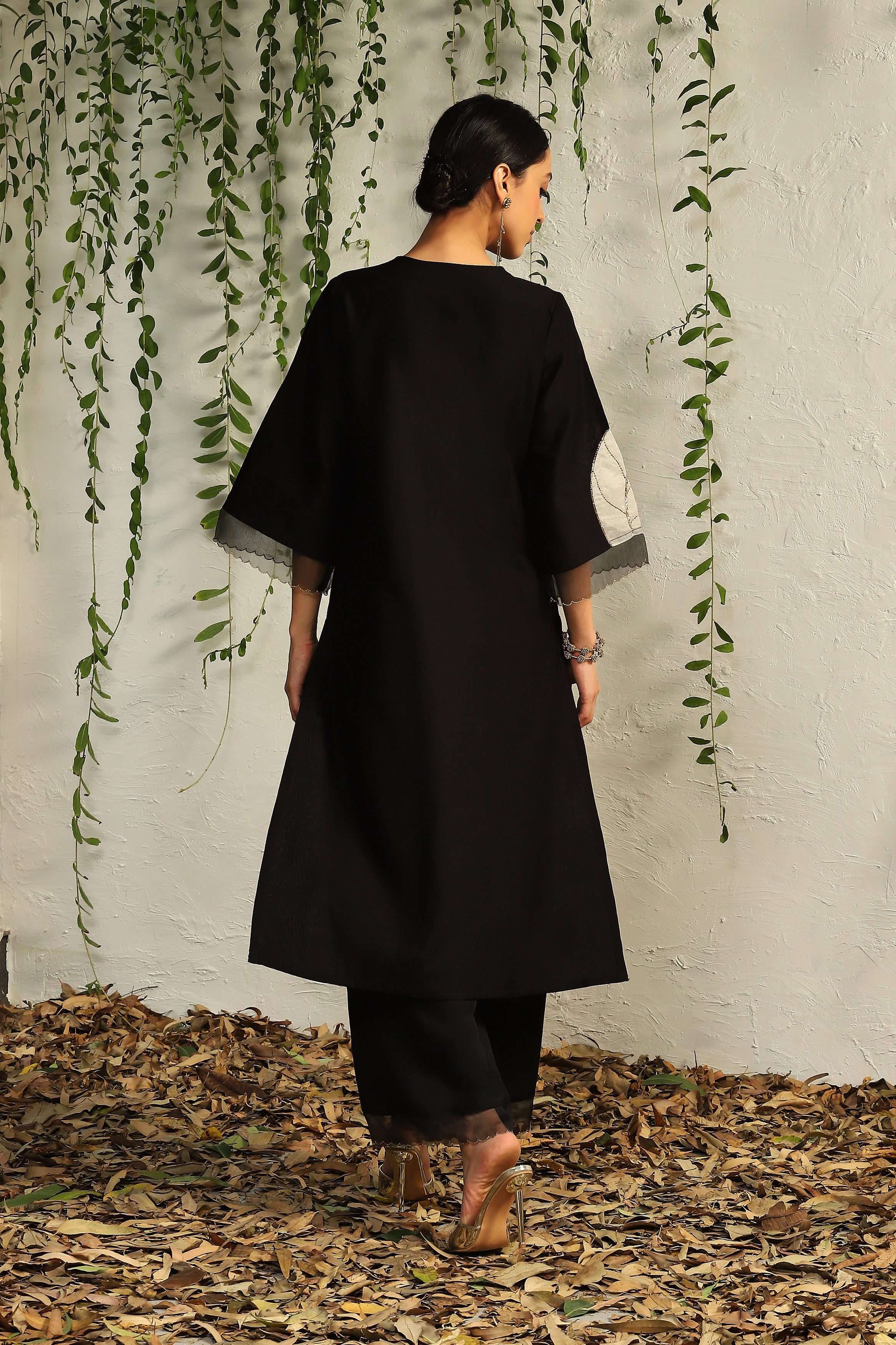 This Black kurta set in a straight silhouette with side slits and beautiful scalloped neckline is elegant and enchanting. Designed with intricate nakshi and zari gold hand embroidery and interplay of white contrast trims, this contemporary ensemble is ideal for your festive celebrations.