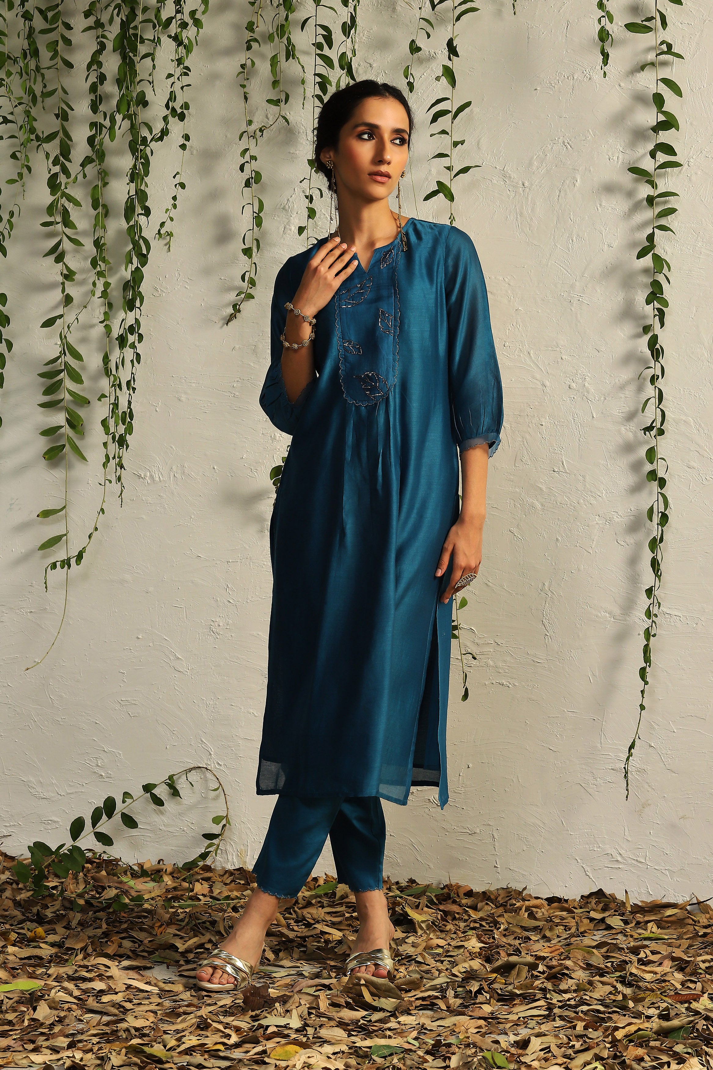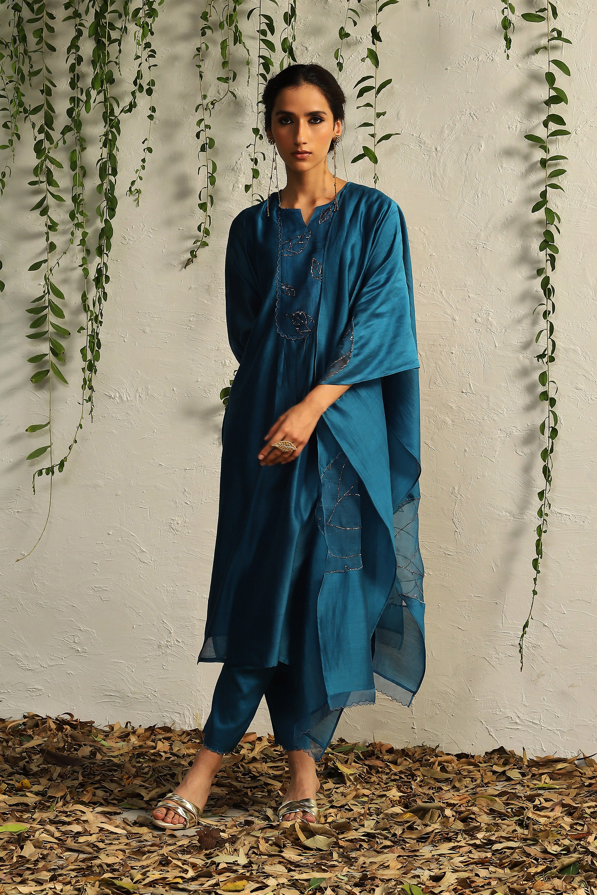 The timelessness of nature inspired motifs is interpreted through hand embroidered leaf motifs in our true blue relaxed fit kurta set. The decadence is enhanced with our intricate nakshi and zari antique silver hand embroidery.