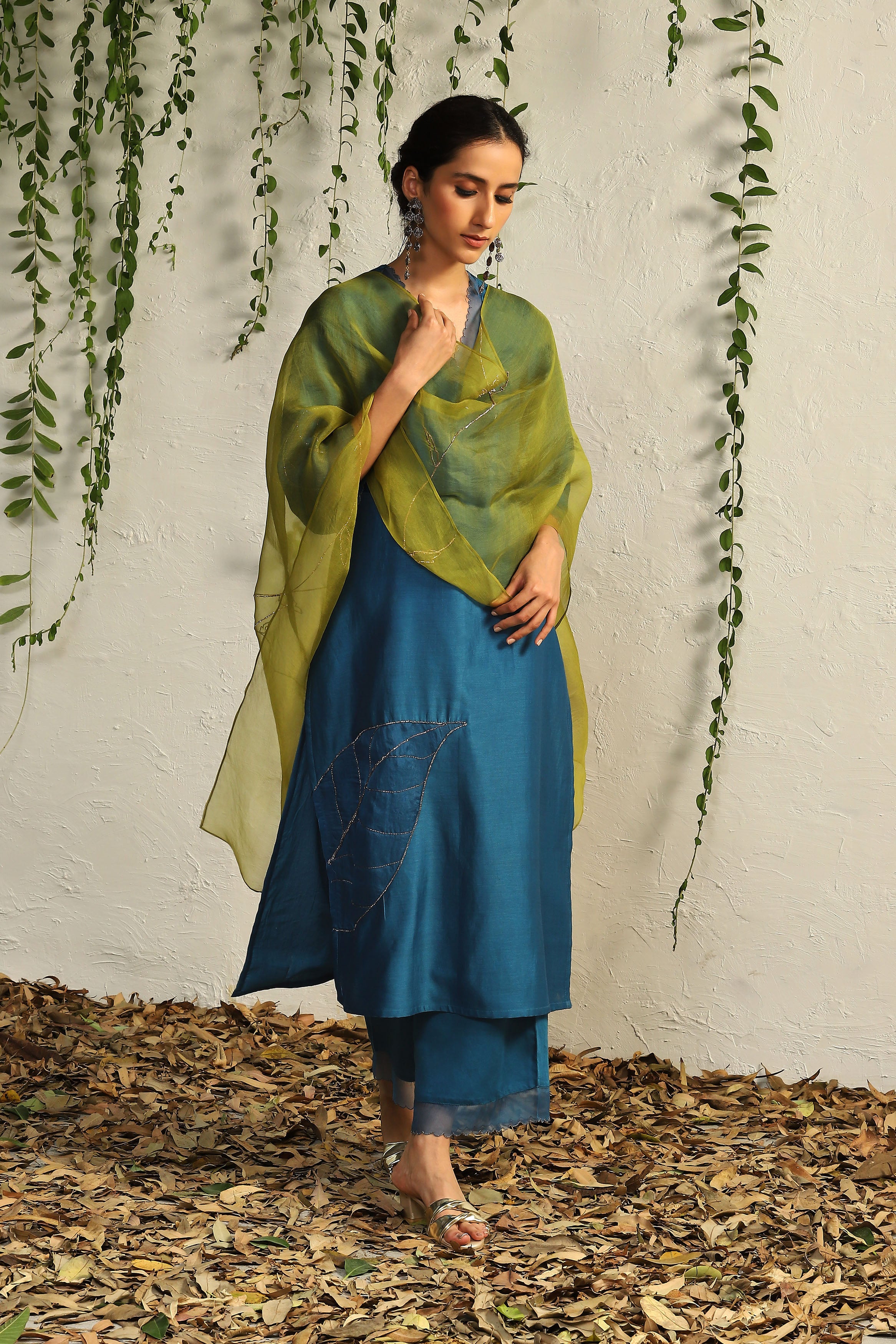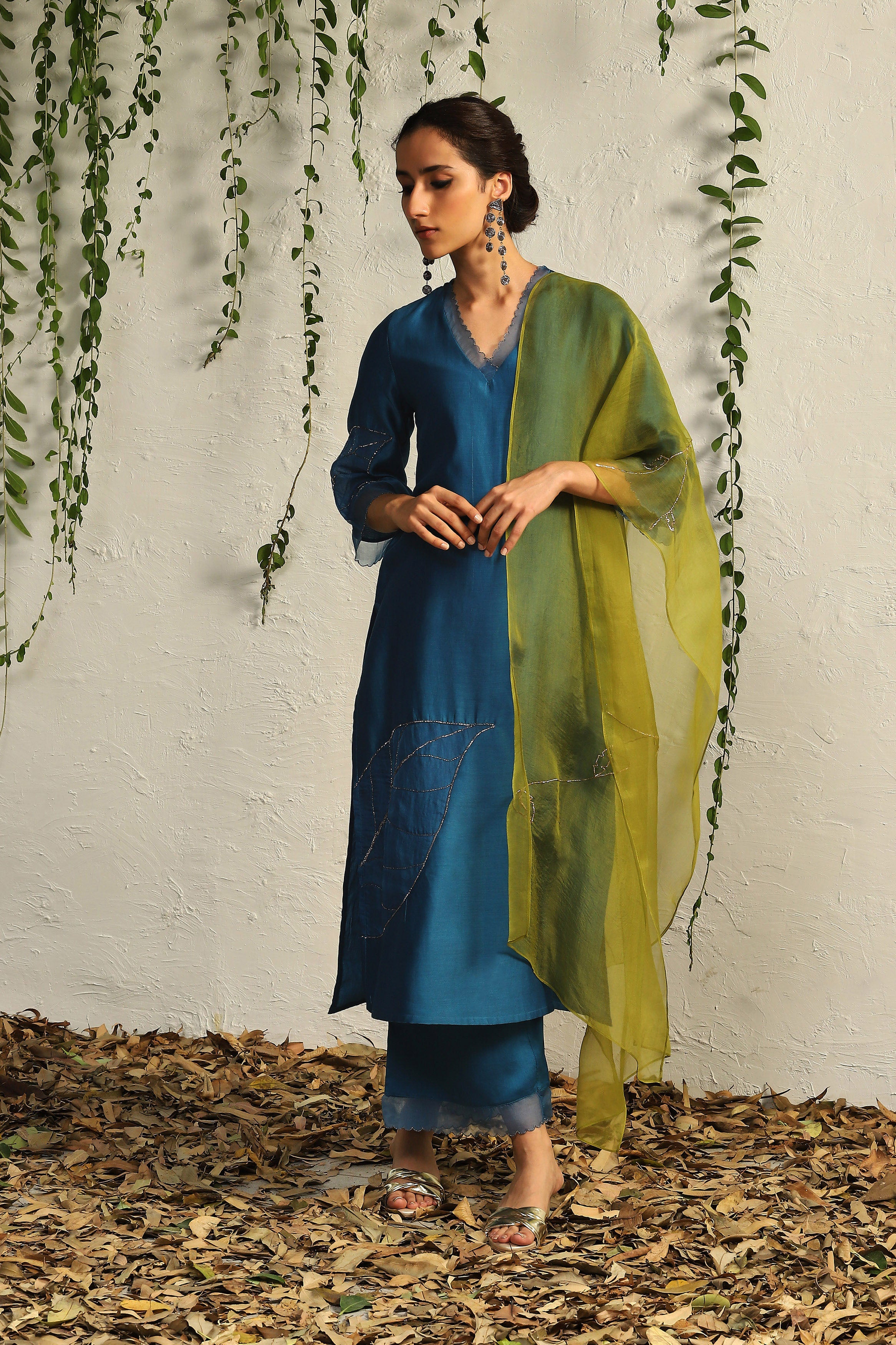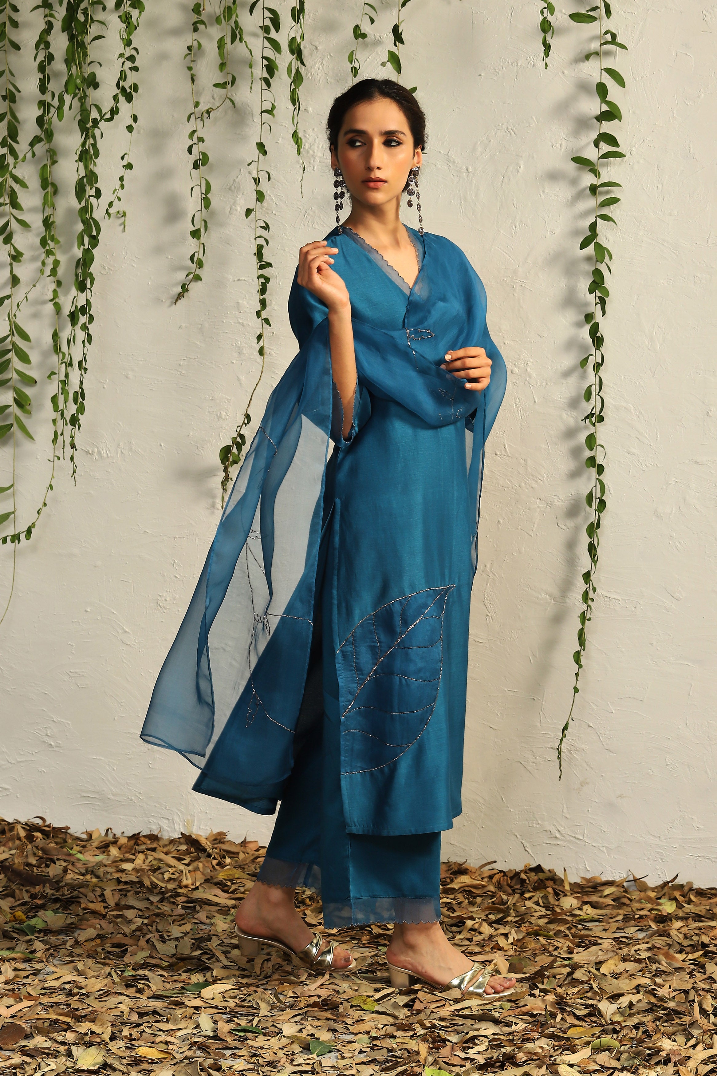 This true blue kurta set in a straight silhouette with side slits and beautiful scalloped neckline is elegant and enchanting. Designed with intricate nakshi and zari antique silver hand embroidery , this contemporary ensemble is ideal for your festive celebrations.