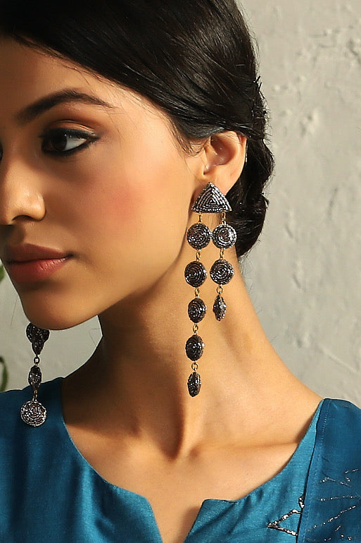 The Twilight Drop Earrings by Charkhee stand as a distinctive statement of artistry and style. The unique hand-embroidered design, featuring dabka and nakshi work, sets these danglers apart, adding a touch of allure and sophistication to your appearance. With attention to detail, each earring becomes a collectible piece, reflecting the craftsmanship Charkhee.