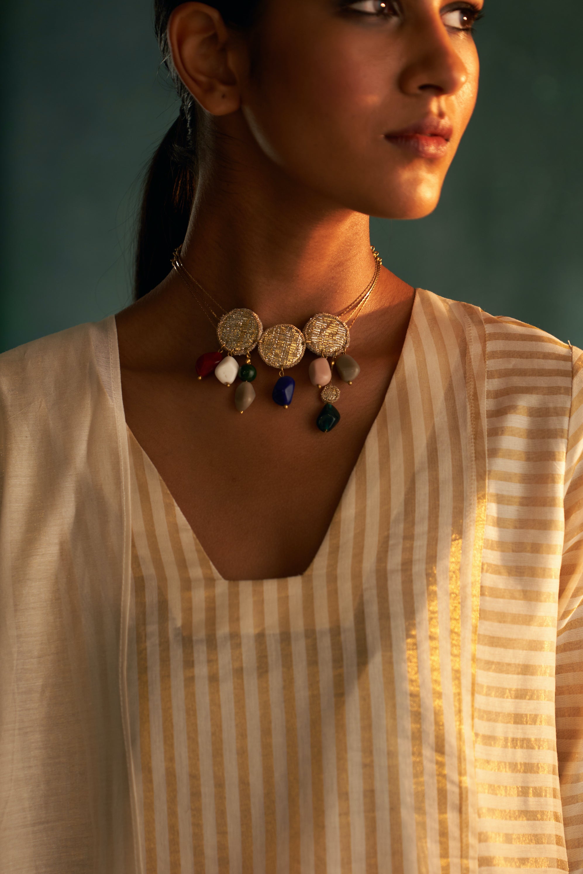 Radiating elegance, this exquisite neckpiece is a testament to the skill and artistry of our hand embroidery artisans, making it a one-of-a-kind jewel in your collection. Meticulously crafted, it showcases intricate details with a harmonious blend of gota, zari, and beads, elegantly designed in a snug choker style that gracefully adorns your neck.