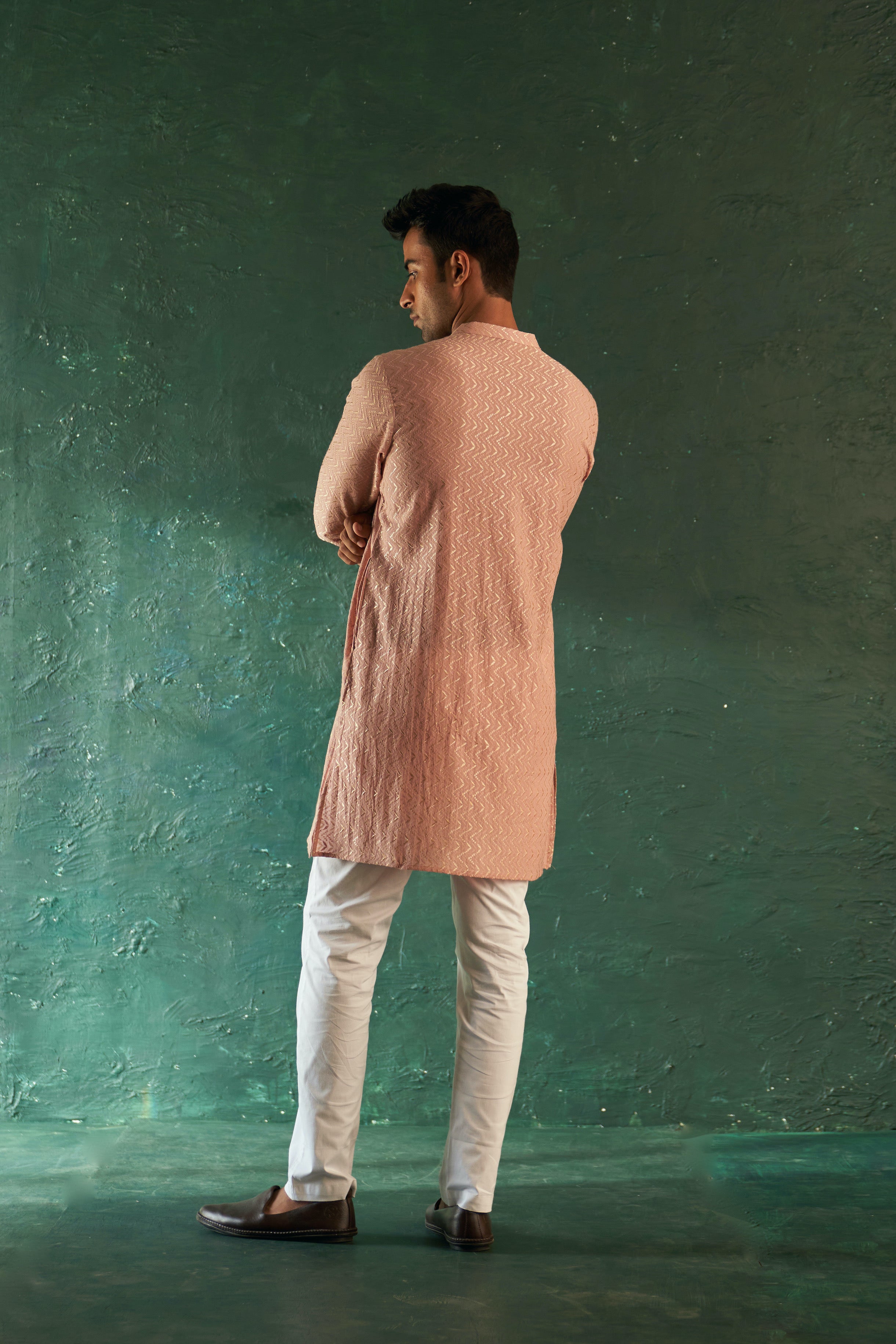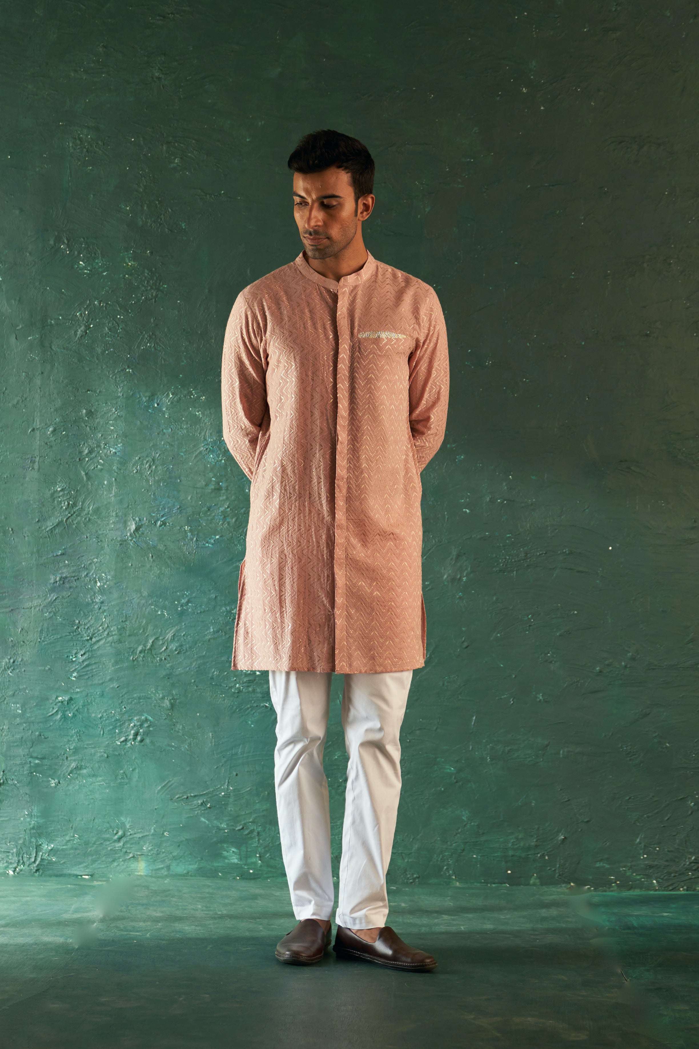 This sophisticated set contains an Old Rose Chevron Kurta, masterfully crafted from cotton threadwork, with a full-front placket, a mandarin collar, side pockets, and a Gota accent on the pocket for a luxuriant look. It also comes with a coordinating cotton pant, ideal for any event.